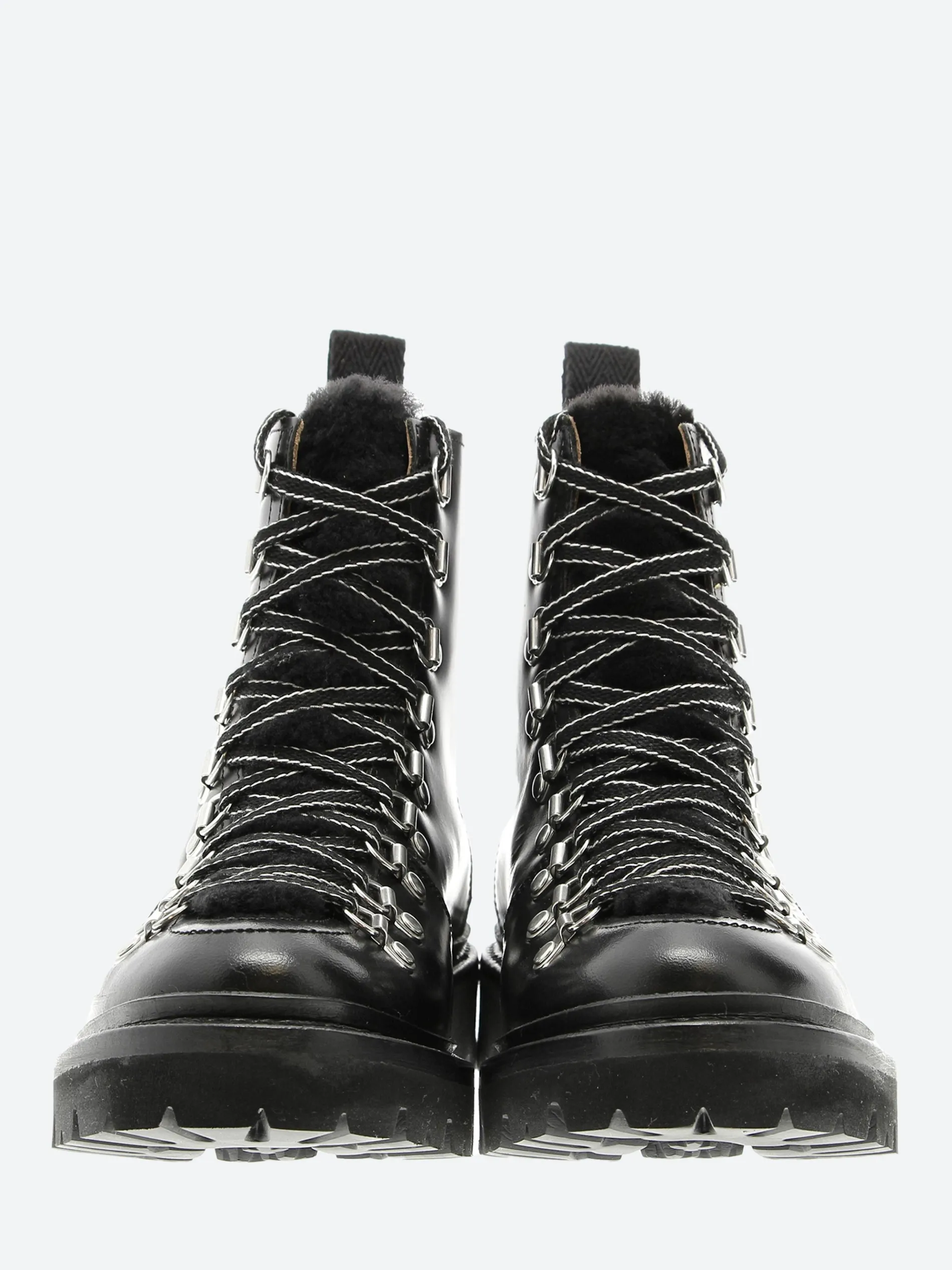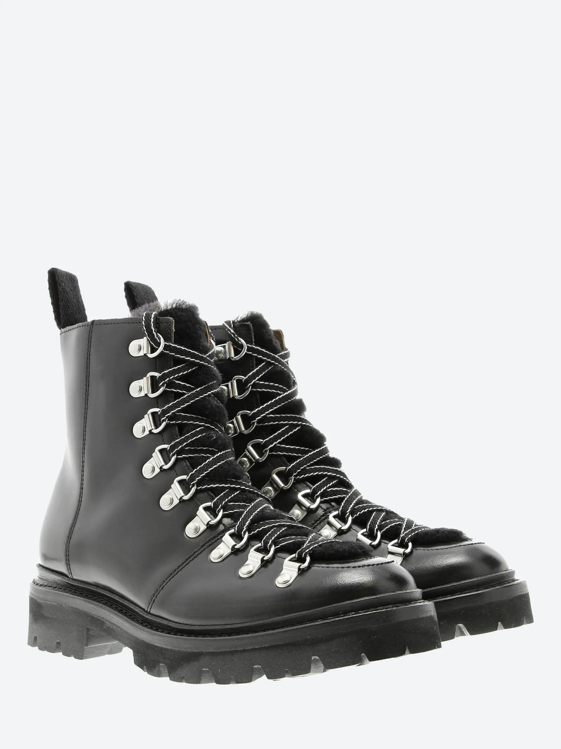 Grenson Nanette is a chunky, but lightweight and inspired by hiker boot styling with striking cross over lacing. Made in smooth grained black calf leather with a black shearling apron and tongue.