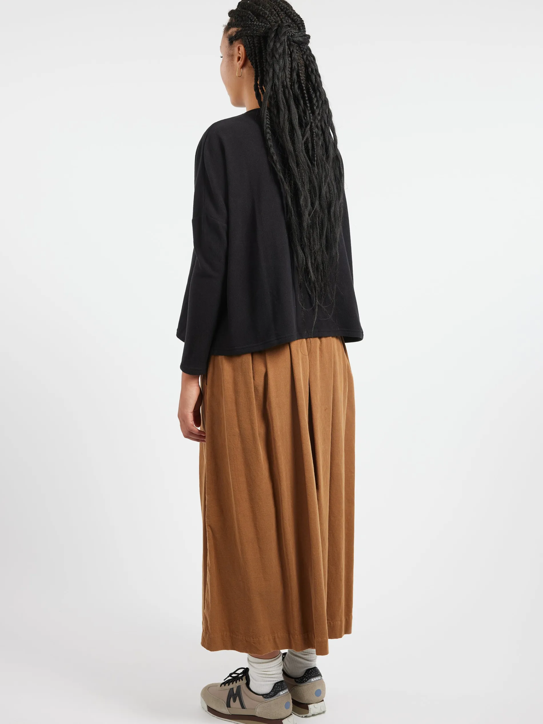 Neirami sweater with a boxy shape and intentionally wide lines to make it comfortable and dynamic.