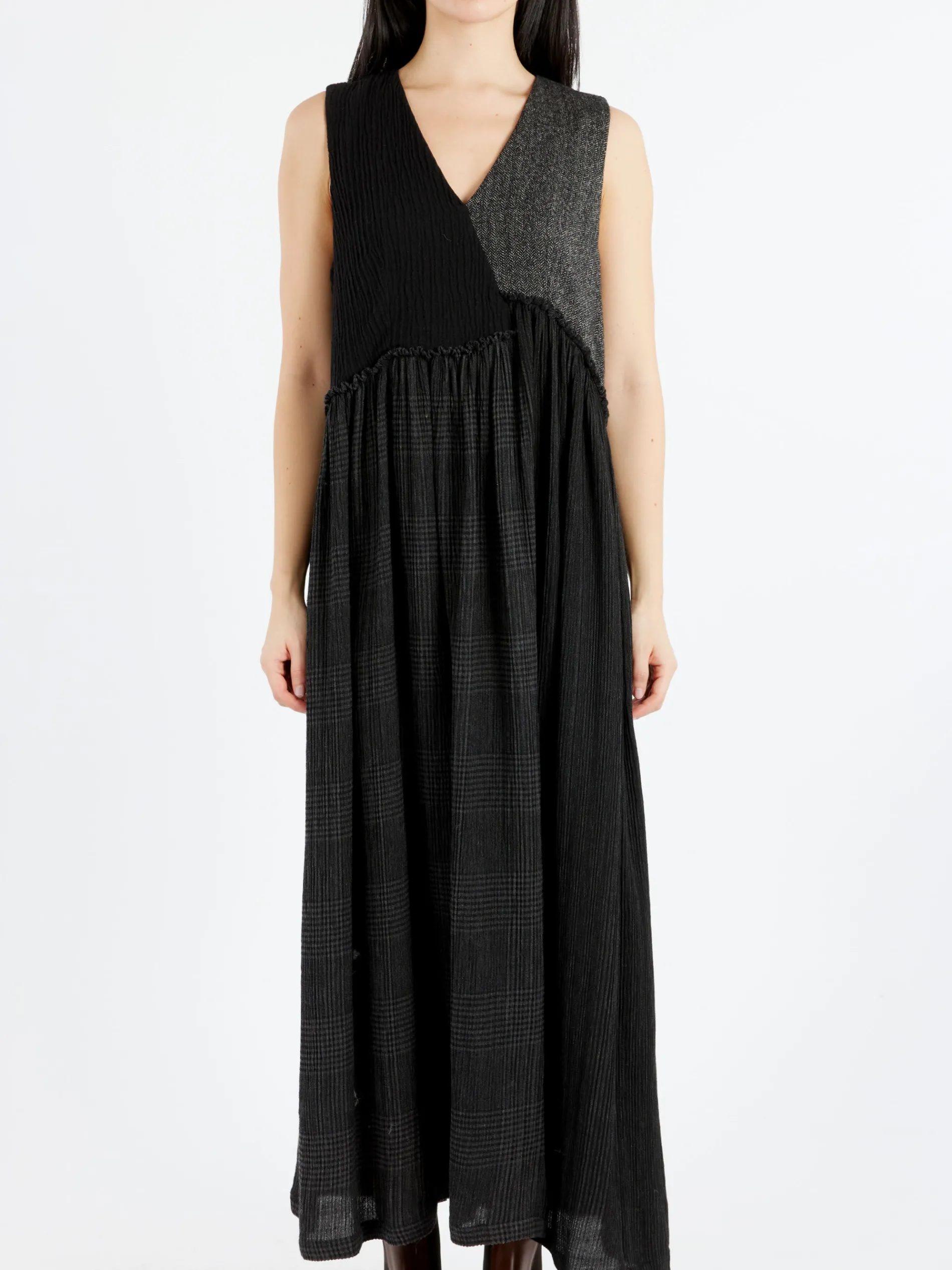 Neirami sleeveless A-line dress with mixed patterned panels. Cut in the brands signature relaxed fit.