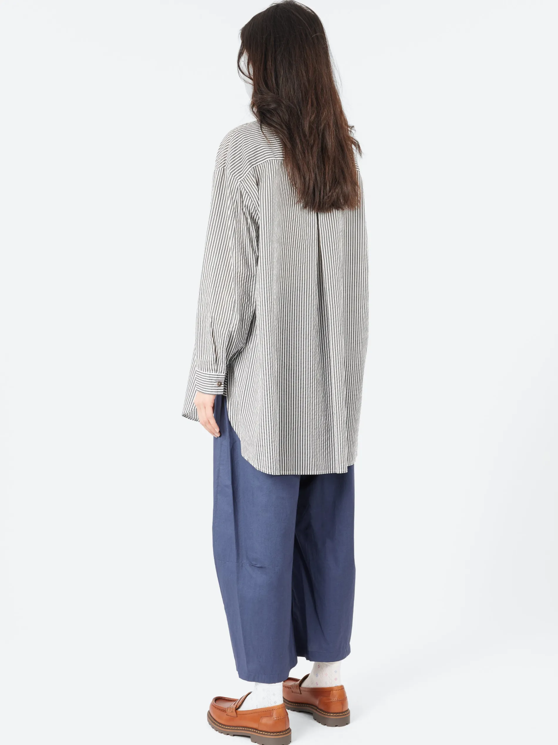 Oversized button-up shirt with long sleeves, cut from a striped cotton with a rounded hem slightly longer at the back.