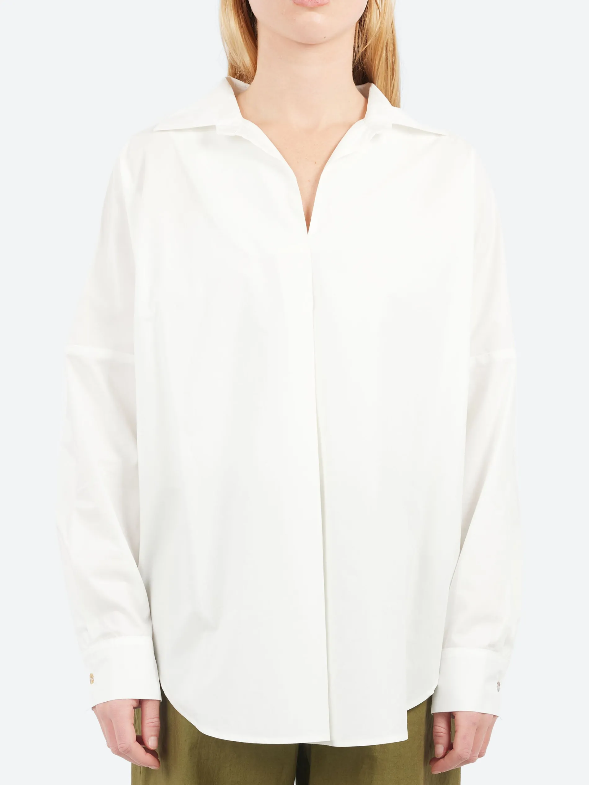 This oversized blouse, crafted from crisp cotton, features long sleeves and a rounded hem that’s slightly longer at the back for a flattering silhouette. It showcases an open collar and a V-neckline, adding to its relaxed yet stylish appeal. The oversized fit ensures comfort and ease, making it a perfect blend of style and versatility for any wardrobe.