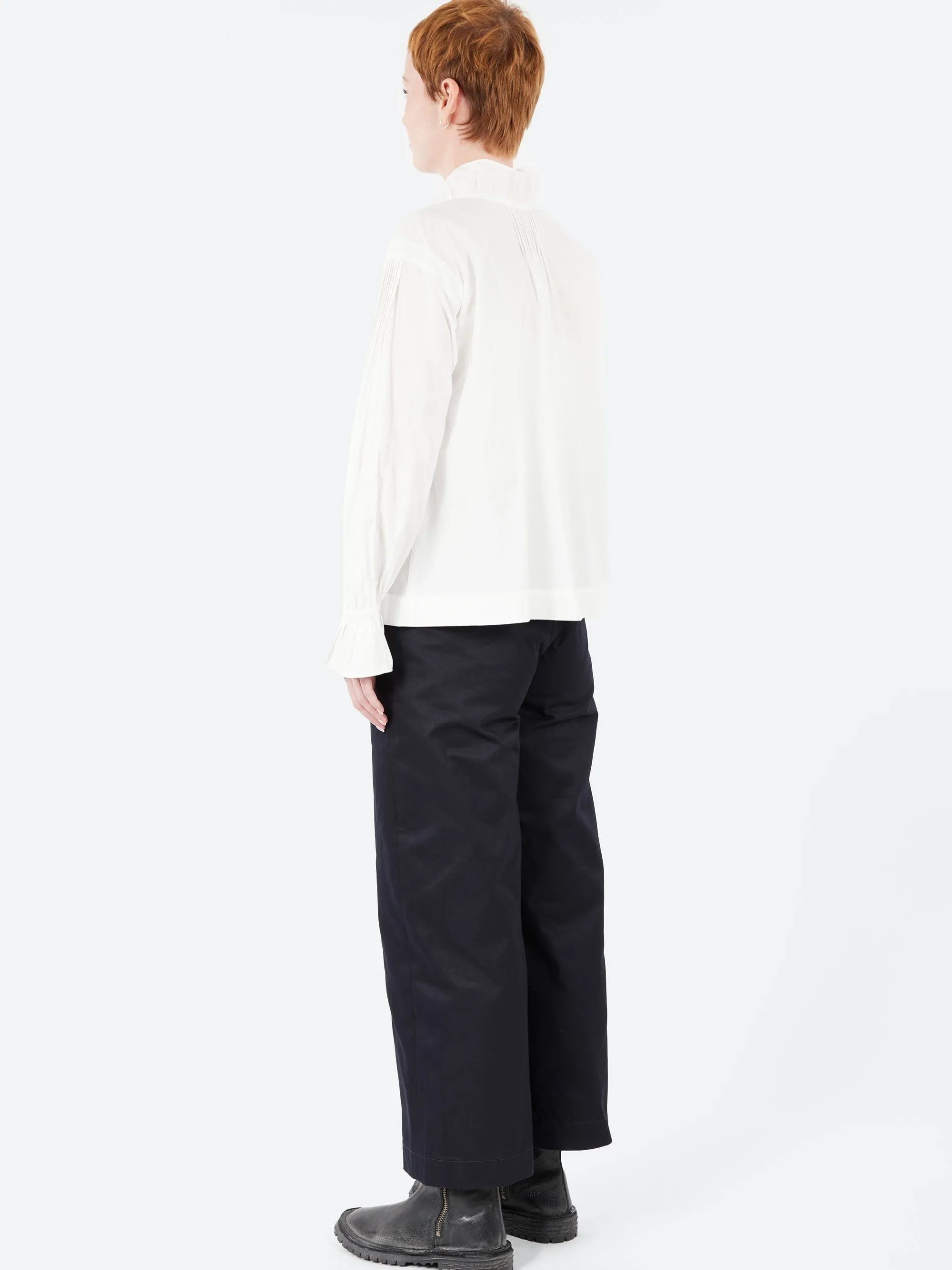 A loose-fitting blouse with a design motif of a vintage blouse from the 1960s. Made from a typewriter cloth that has a well-worn vintage feel.