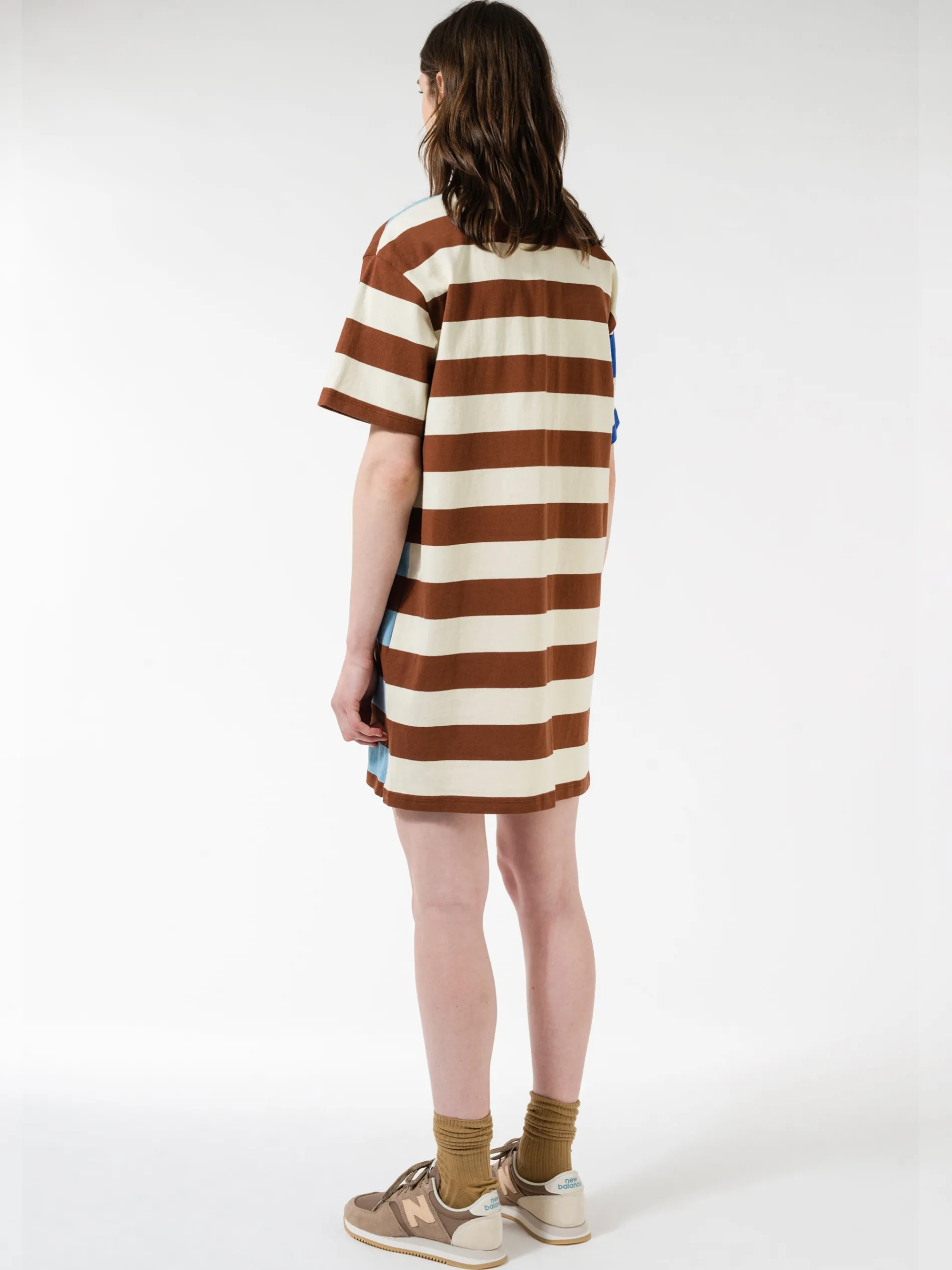 Oversized boxy t-shirt dress in a patchwork of vintage inspired stripes.