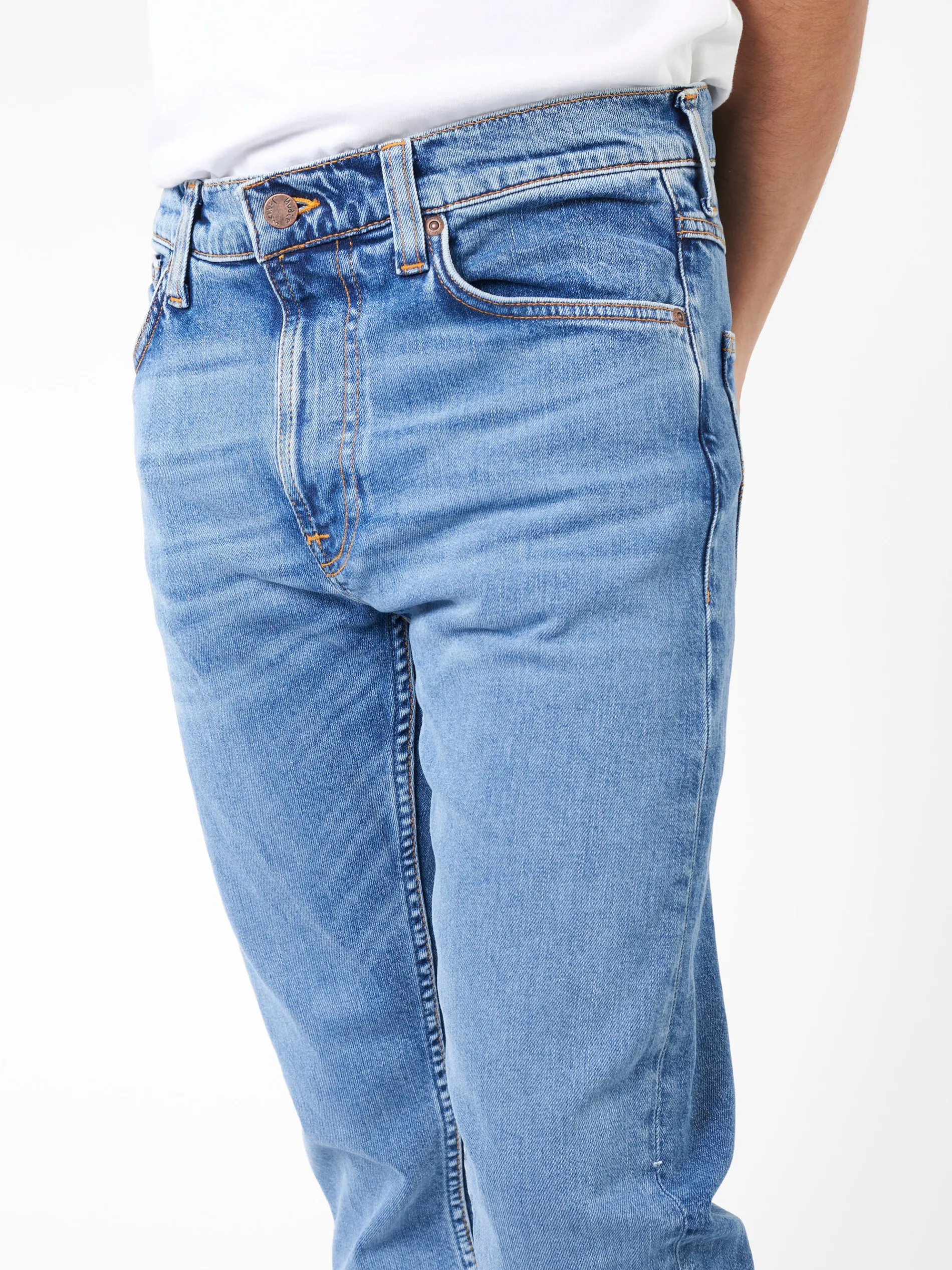 Jeans with a slim tapered fit made in organic comfort stretch denim. It tapers evenly from the hip down to the ankle, an aspect that has made Lean Dean one of Nudie Jeans’ most popular fits. Lean Dean fits slim and tapers from the thigh all the way down to a slim ankle opening.