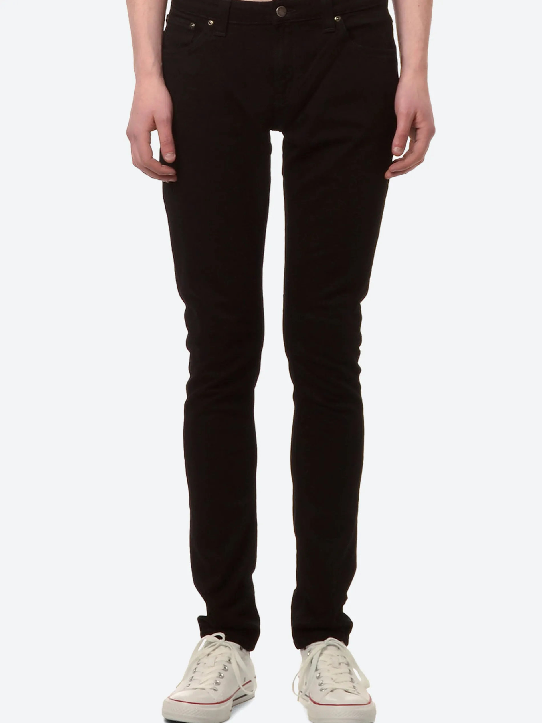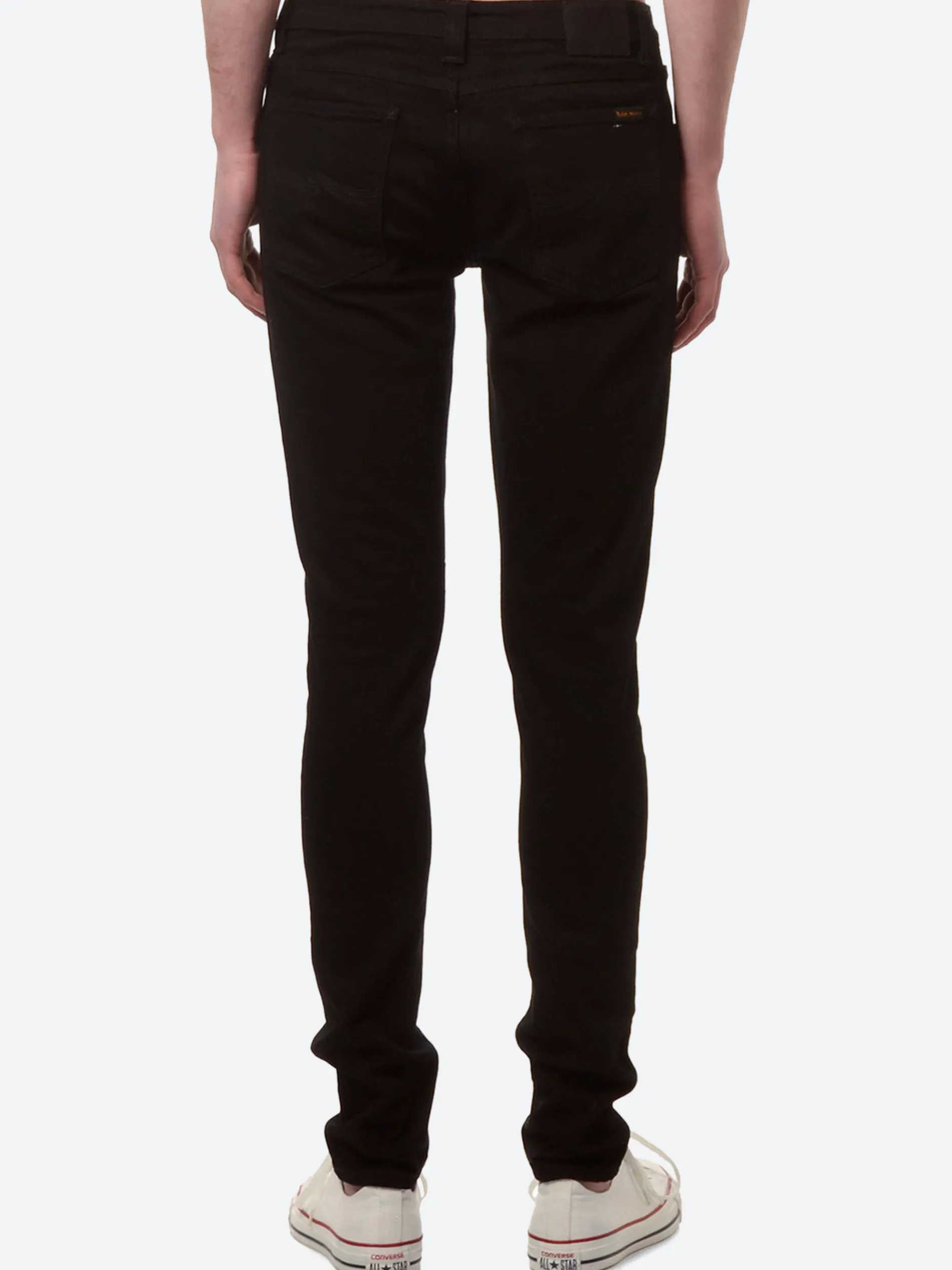 Nudie’s Skinny Lin are a super tight fit jean with a curved waist, tight leg and zip fly. Seen here in an organic black black, this denim is an overdyed stretch black with black stitching, perfect as an everyday basic.