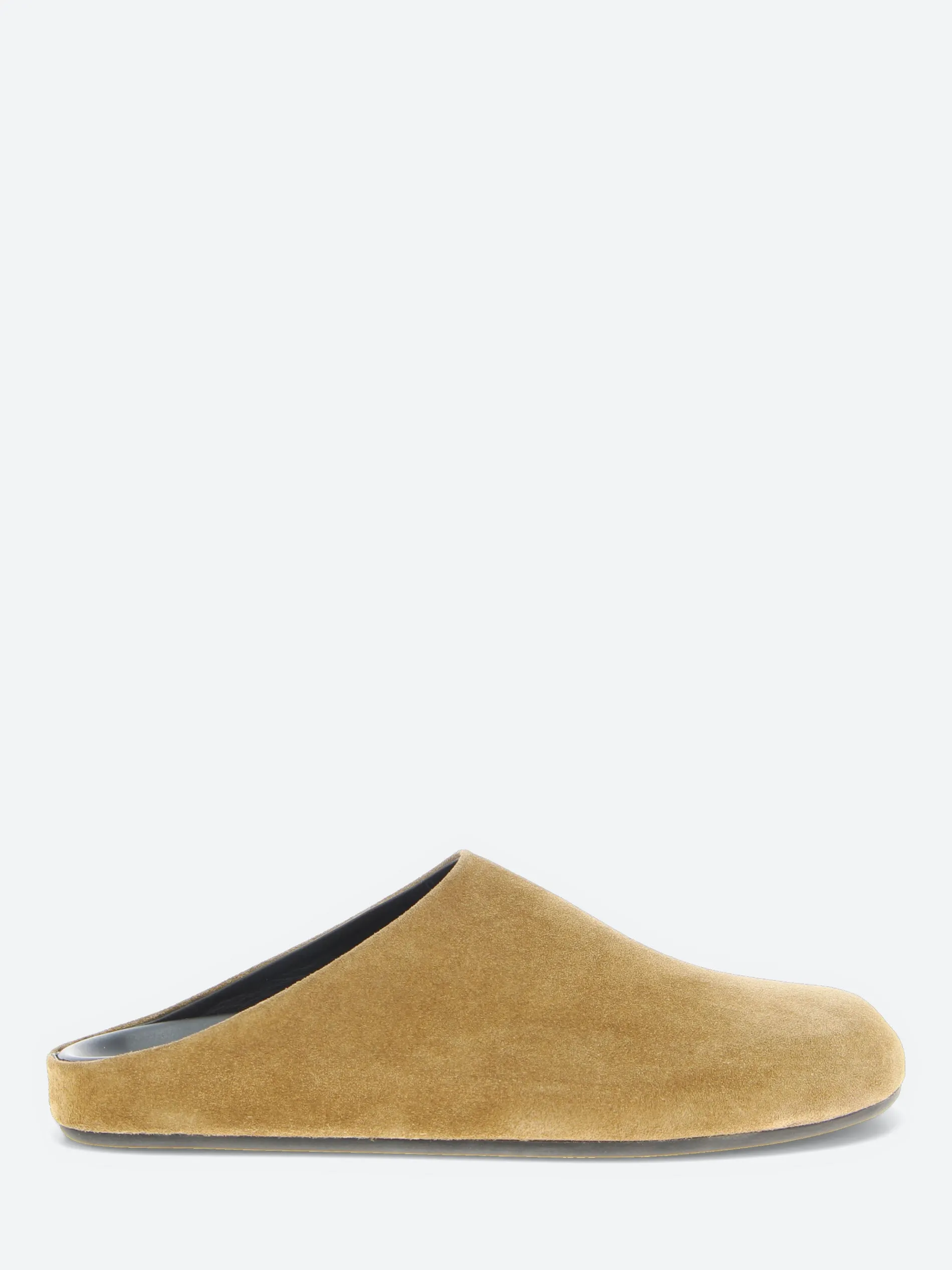 Handcrafted in Italy, the Babouche 001 sandals exemplify minimalist elegance with a sleek, single-piece construction. The encased design in supple suede wraps seamlessly around the foot, complemented by a rubber sole.