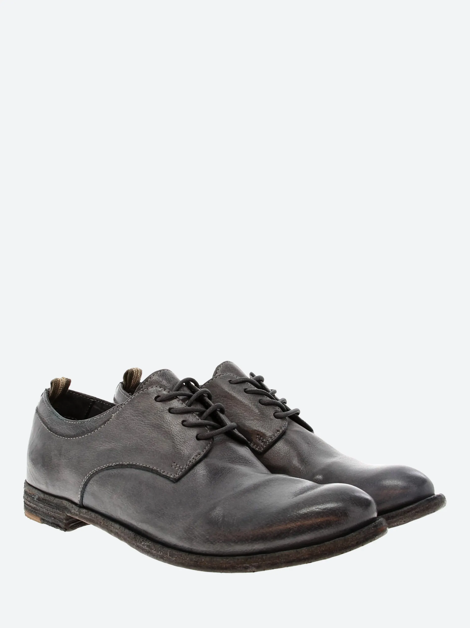 Officine Creative laceless derby in brushed blue leather. Piece-dyed and finished with a stitched custom leather sole.