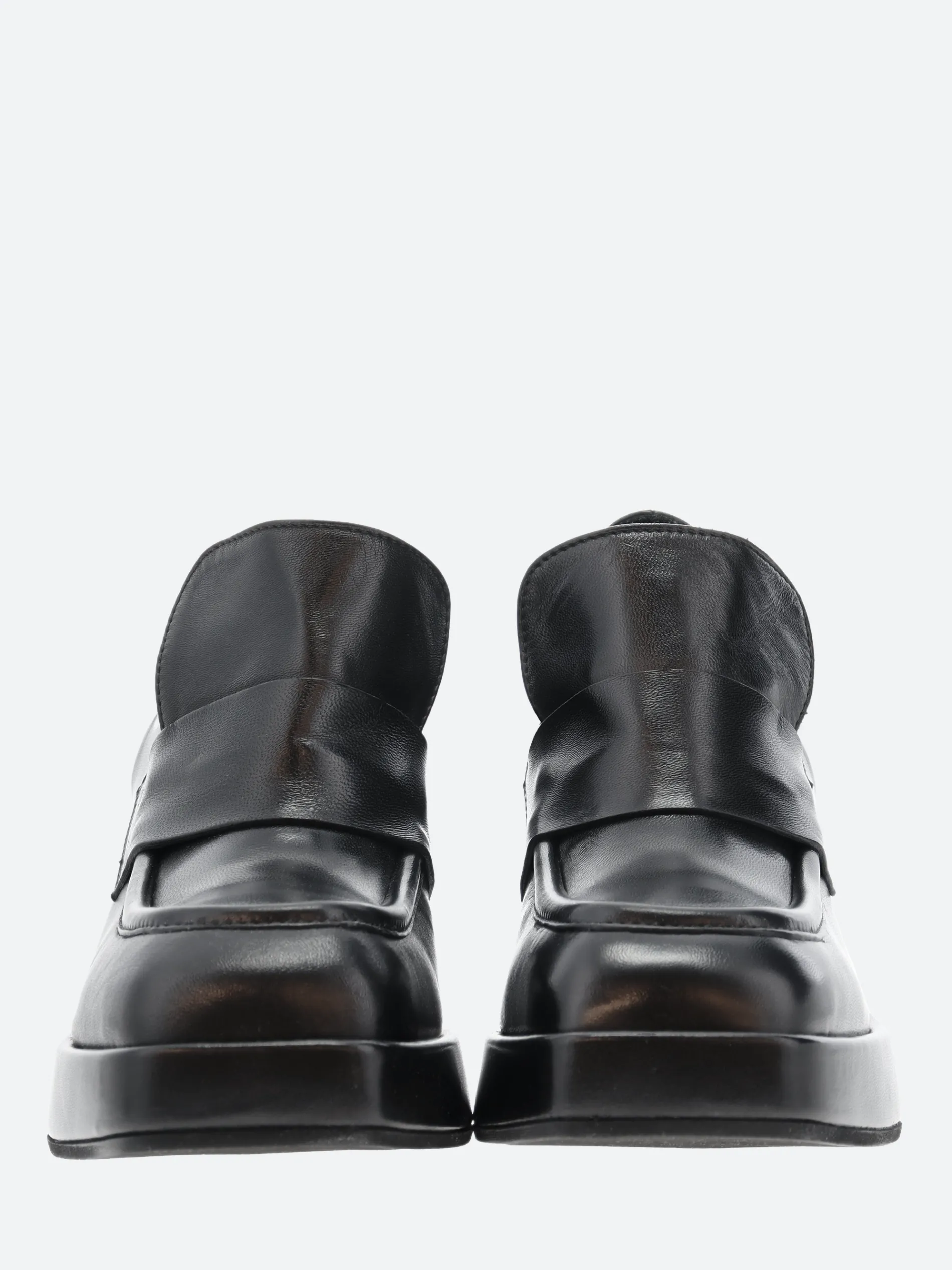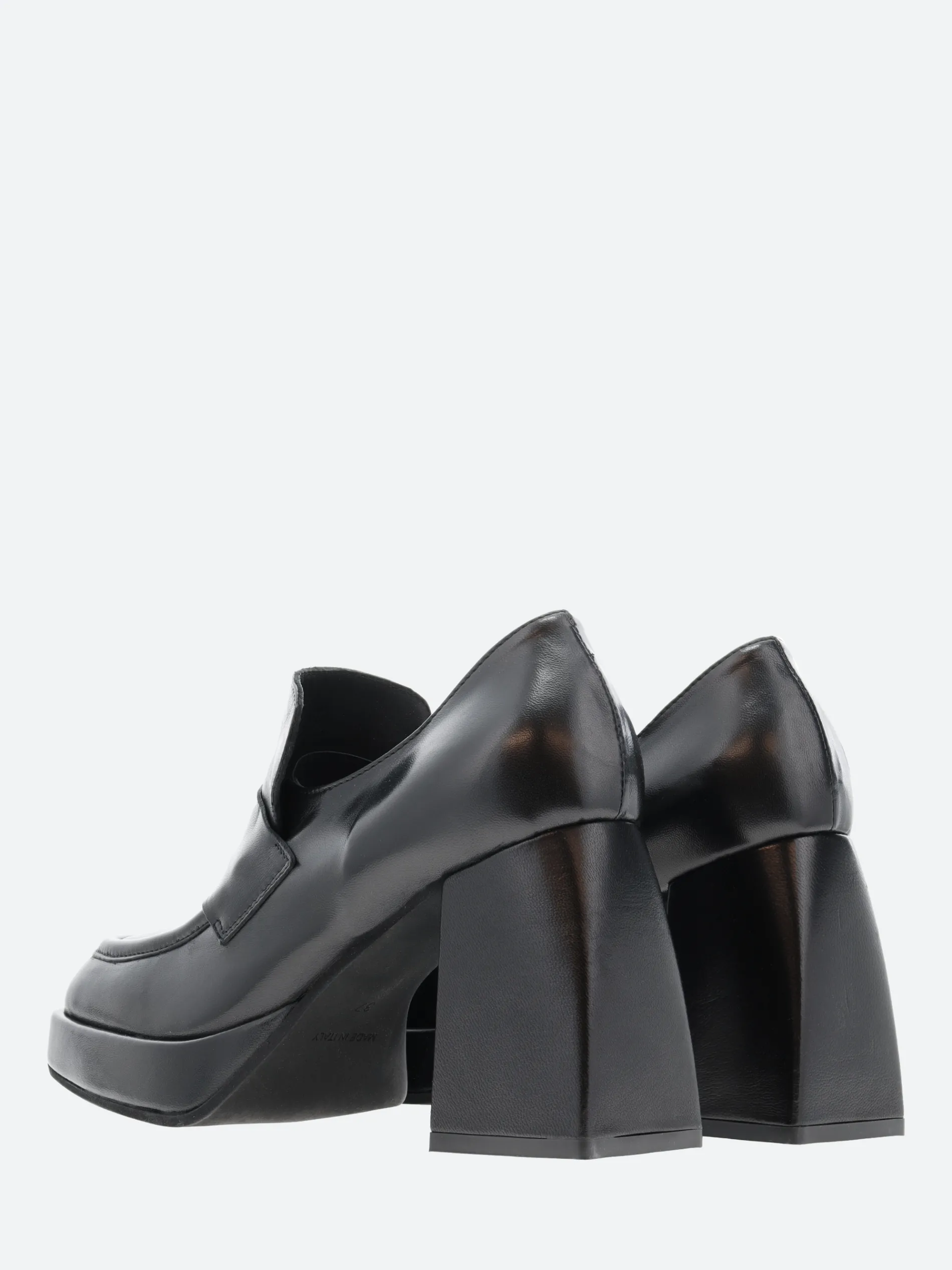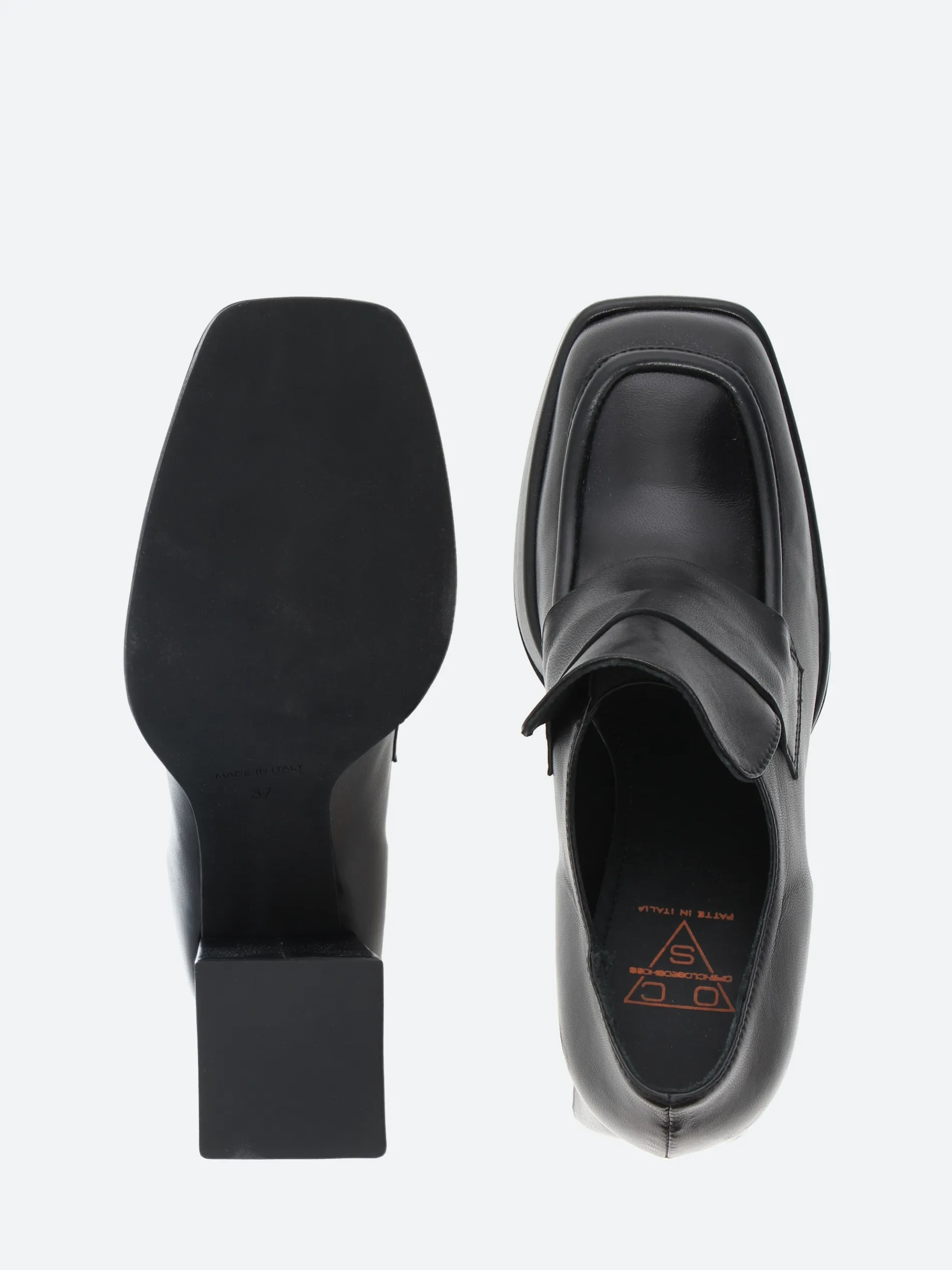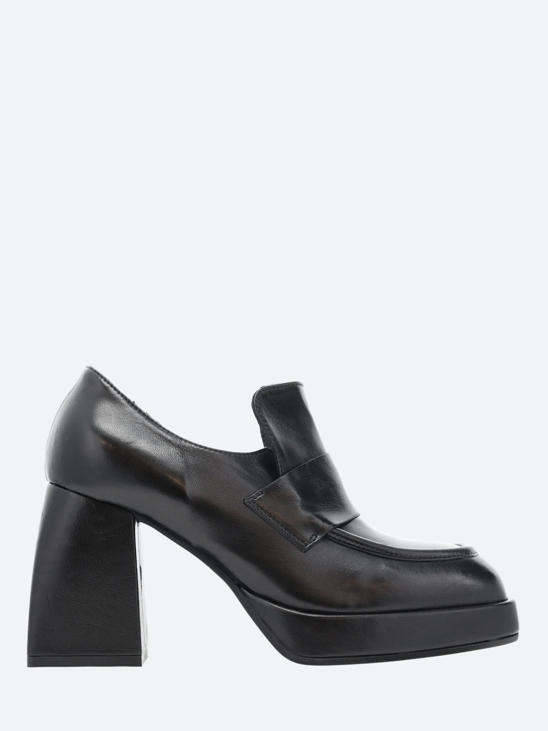 Open Closed Plata 01 is an understated leather loafer sitting on a tall block heel.