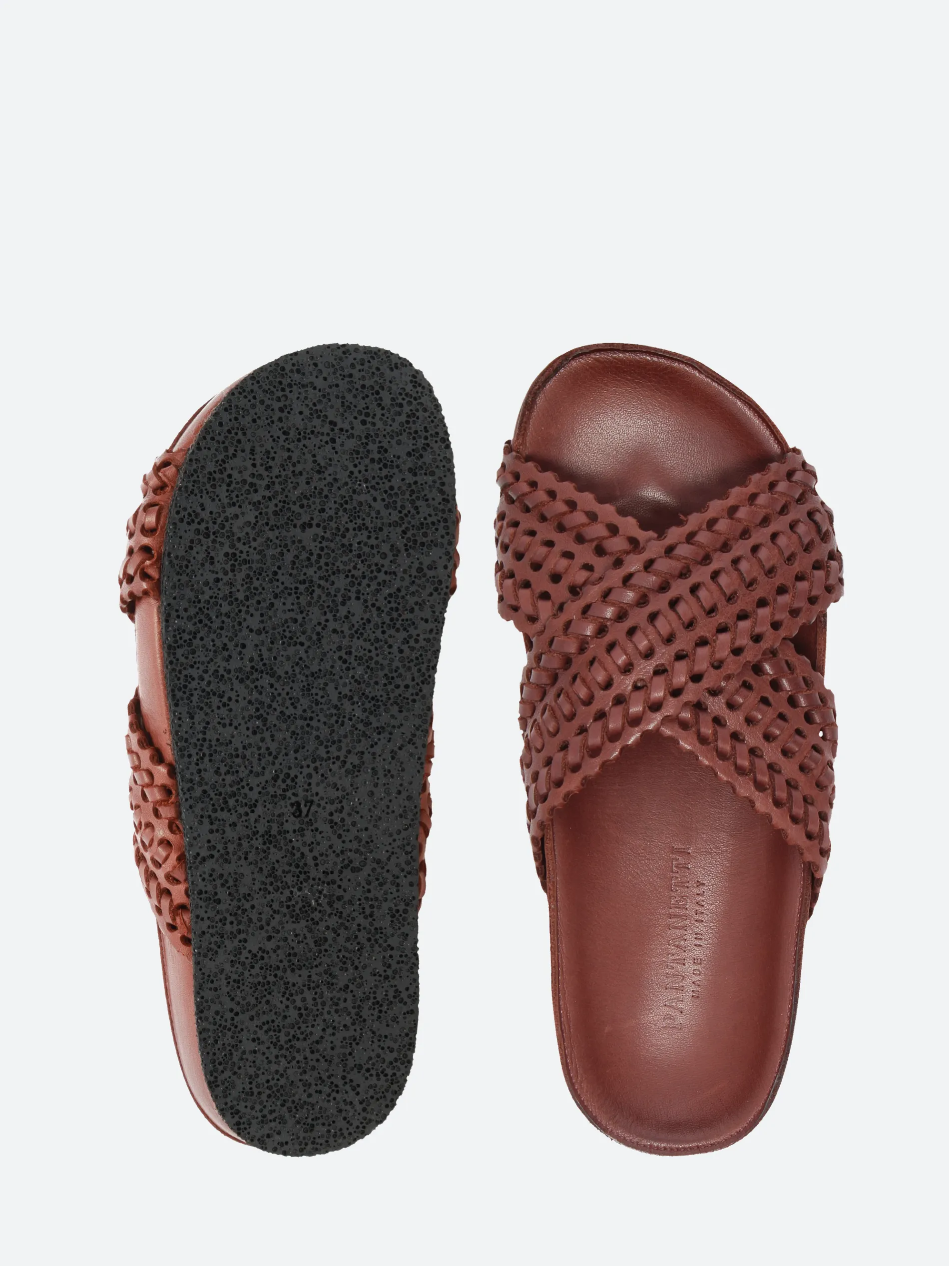 Expertly crafted with woven leather straps, these slide sandals hint at a laid-back style.