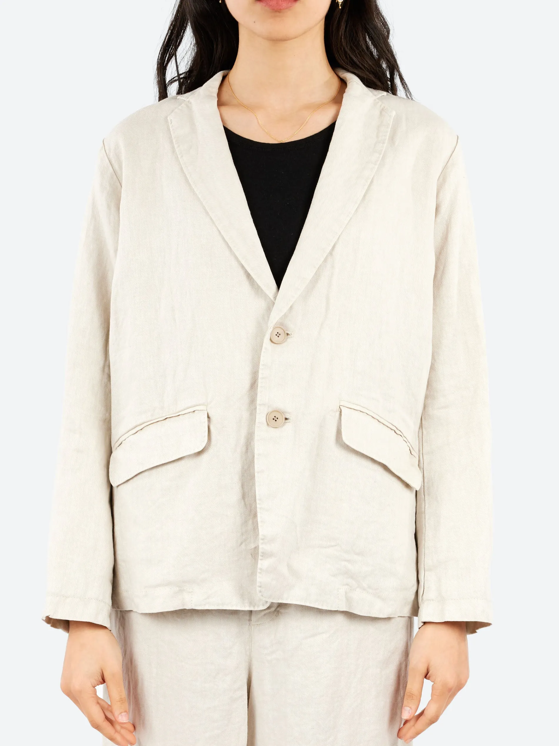 This jacket is crafted from linen twill and garment dyed for a worn-in finish. It features a notched collar, a two-button closure, and flap pockets for a functional yet stylish look. Lined in cotton for added comfort, the jacket boasts a relaxed silhouette, making it a versatile and timeless addition to any wardrobe.