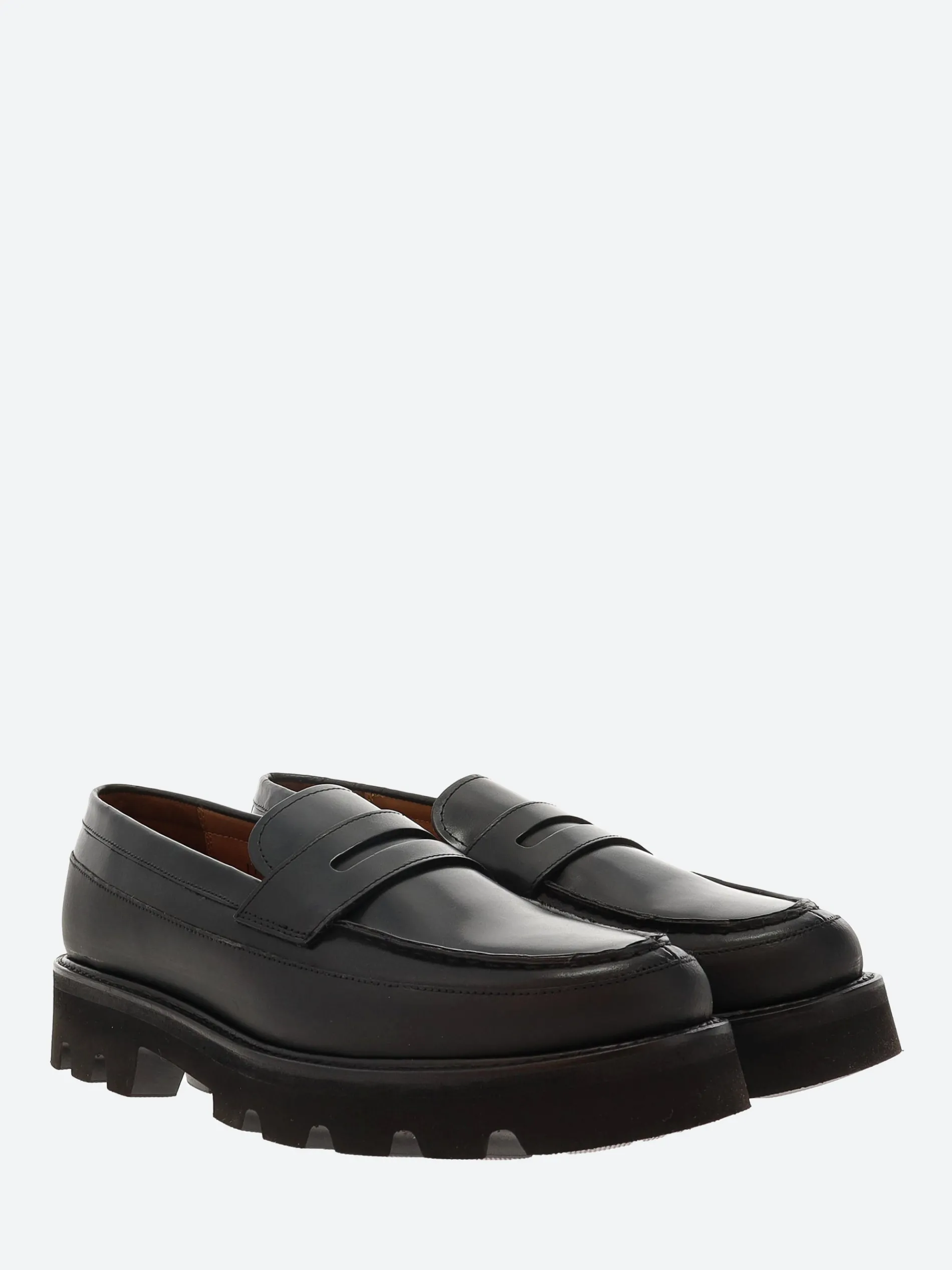 Grenson Pete is a penny loafer with butted apron seam and simple saddle with handsewn detailing.
