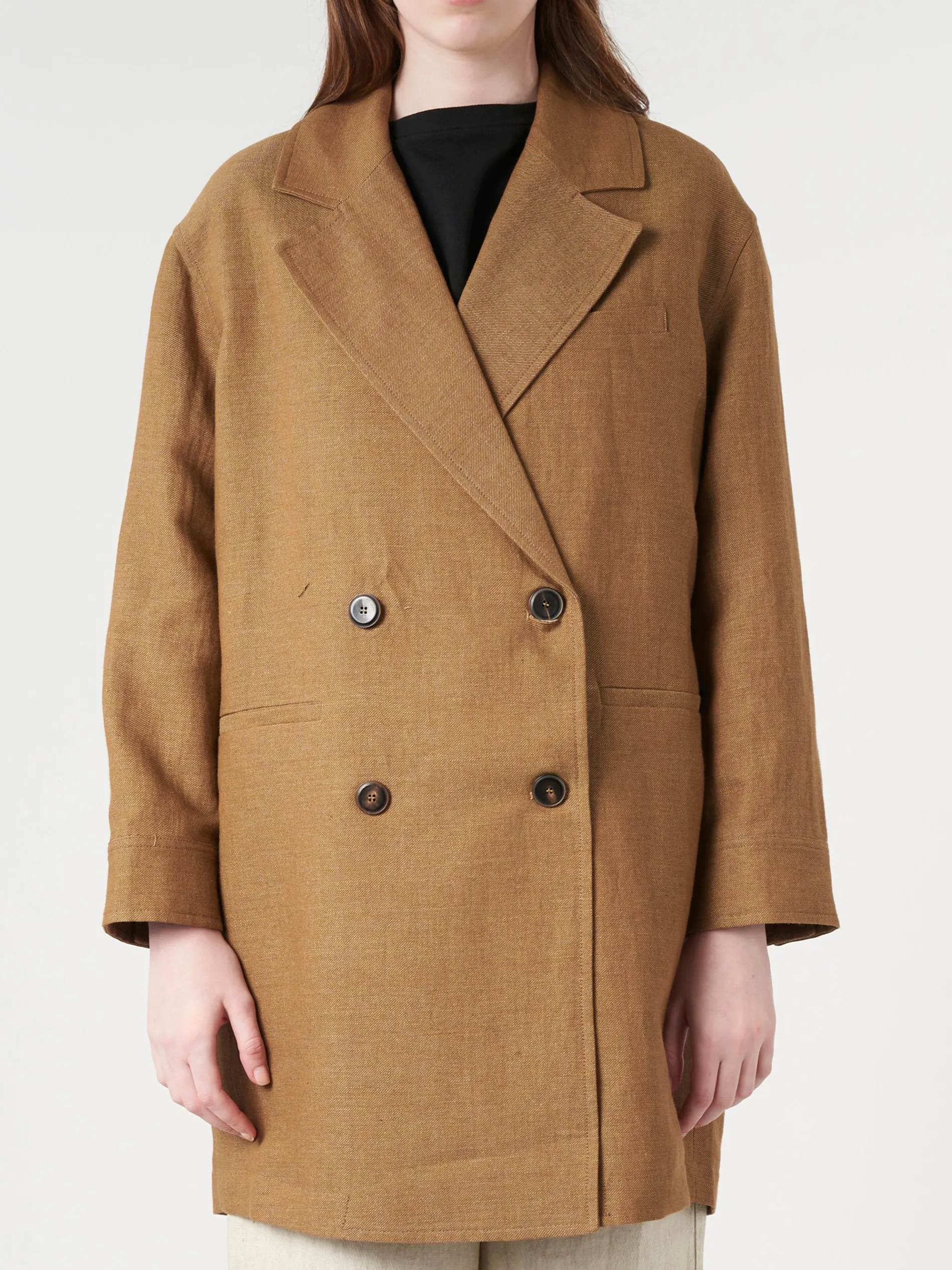 Constructed from a luxurious blend of cotton and yarn-dyed linen, this coat boasts a double-breasted button closure, dropped shoulders, and welt pockets for functional elegance. A back vent to keep you comfortable.