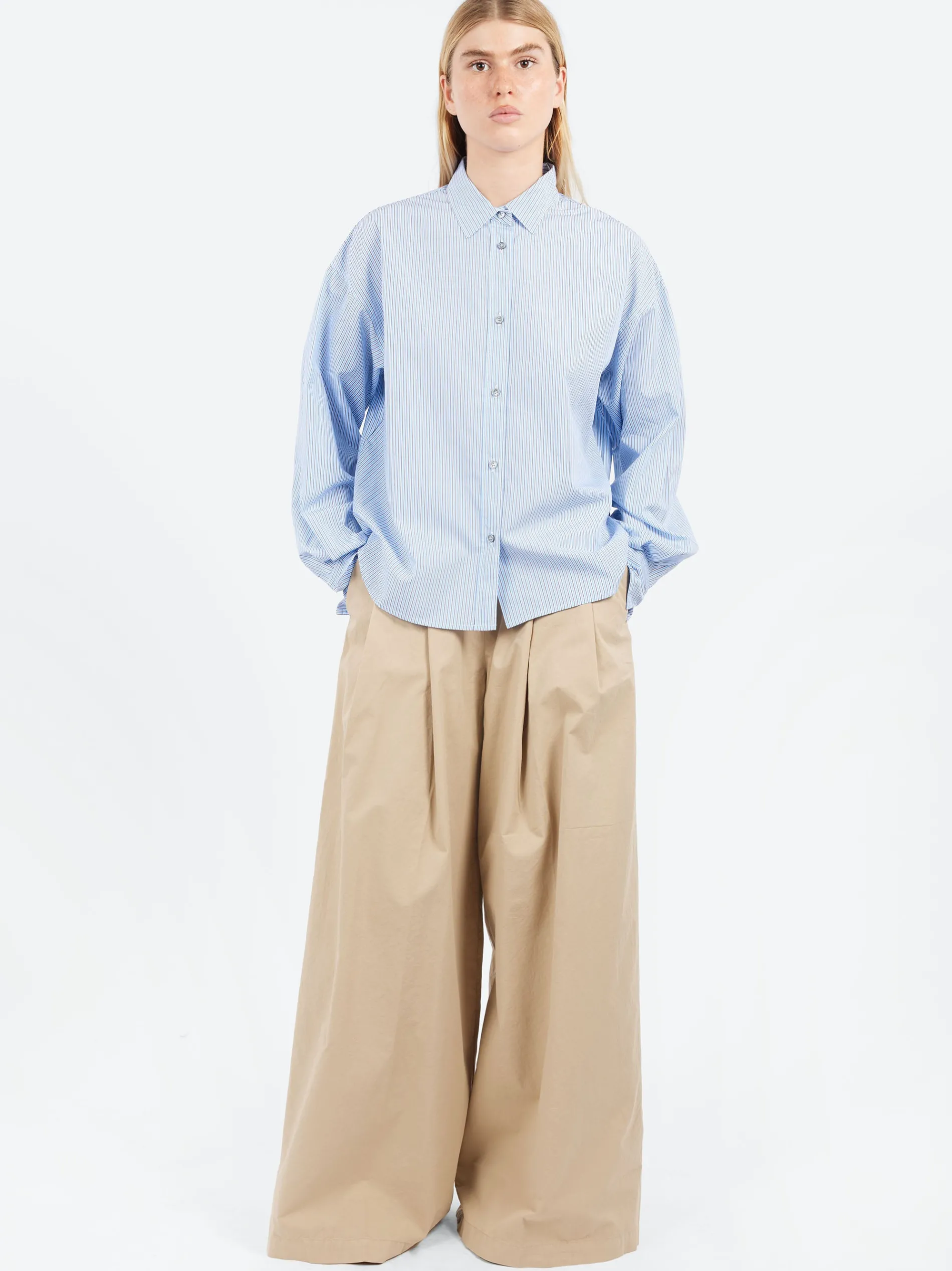 The oversized volume renews the classic masculine appeal of striped patterns in the cotton poplin striped shirt, featuring a soft and smooth feel.