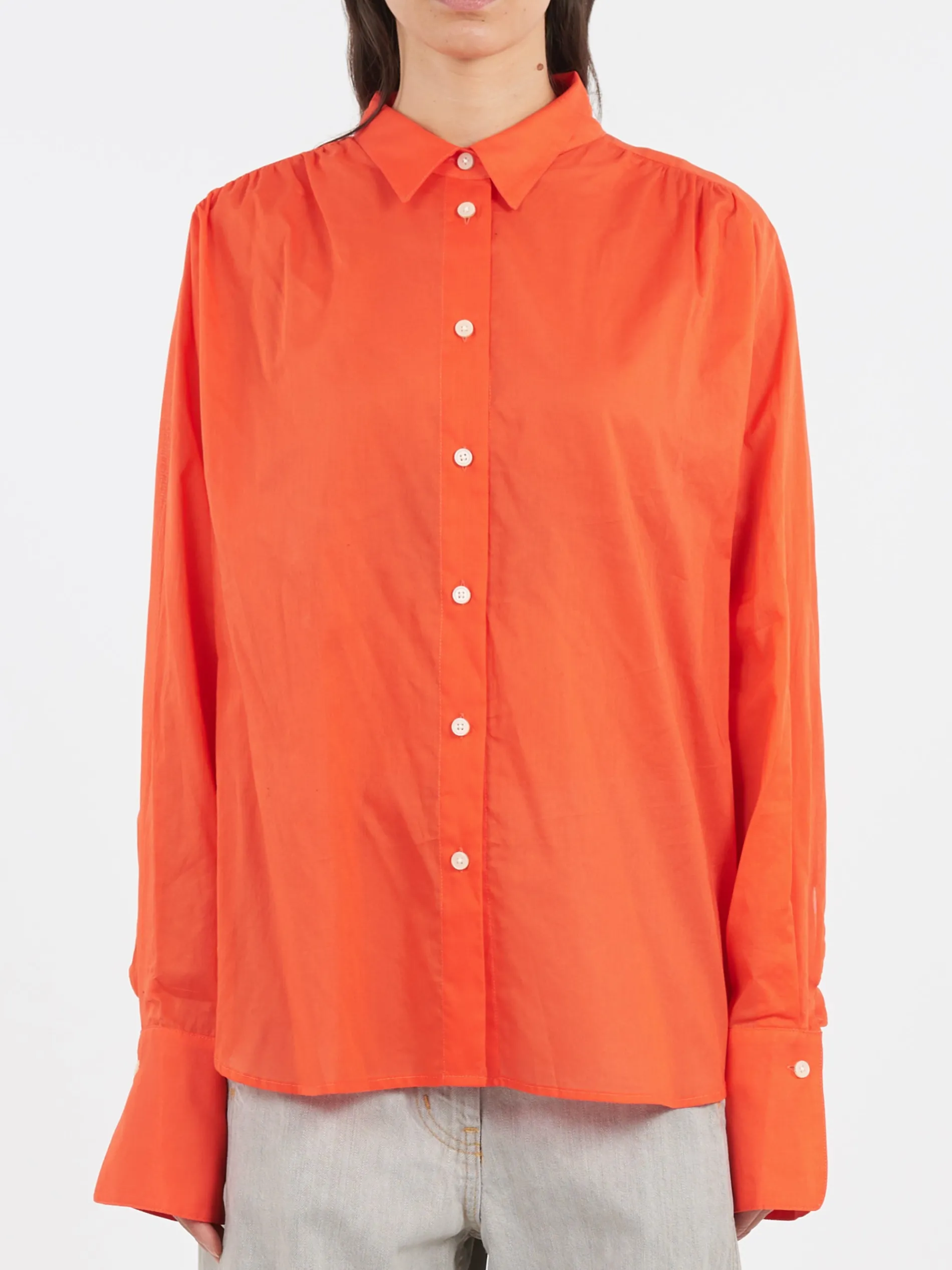 Casual button-up shirt featuring a classic collar and long sleeves with elongated buttoned cuffs, cut from soft and semi-sheer Cotton Lawn, ideal for sophisticated and lightweight summer wear.