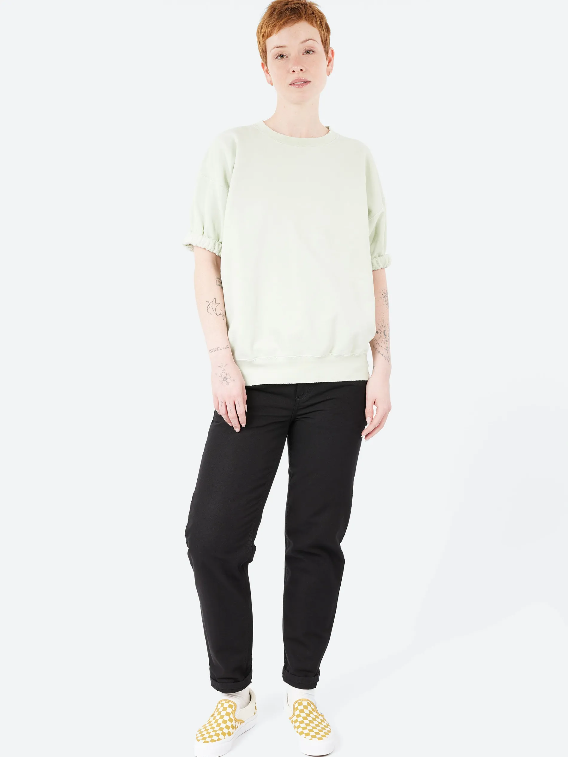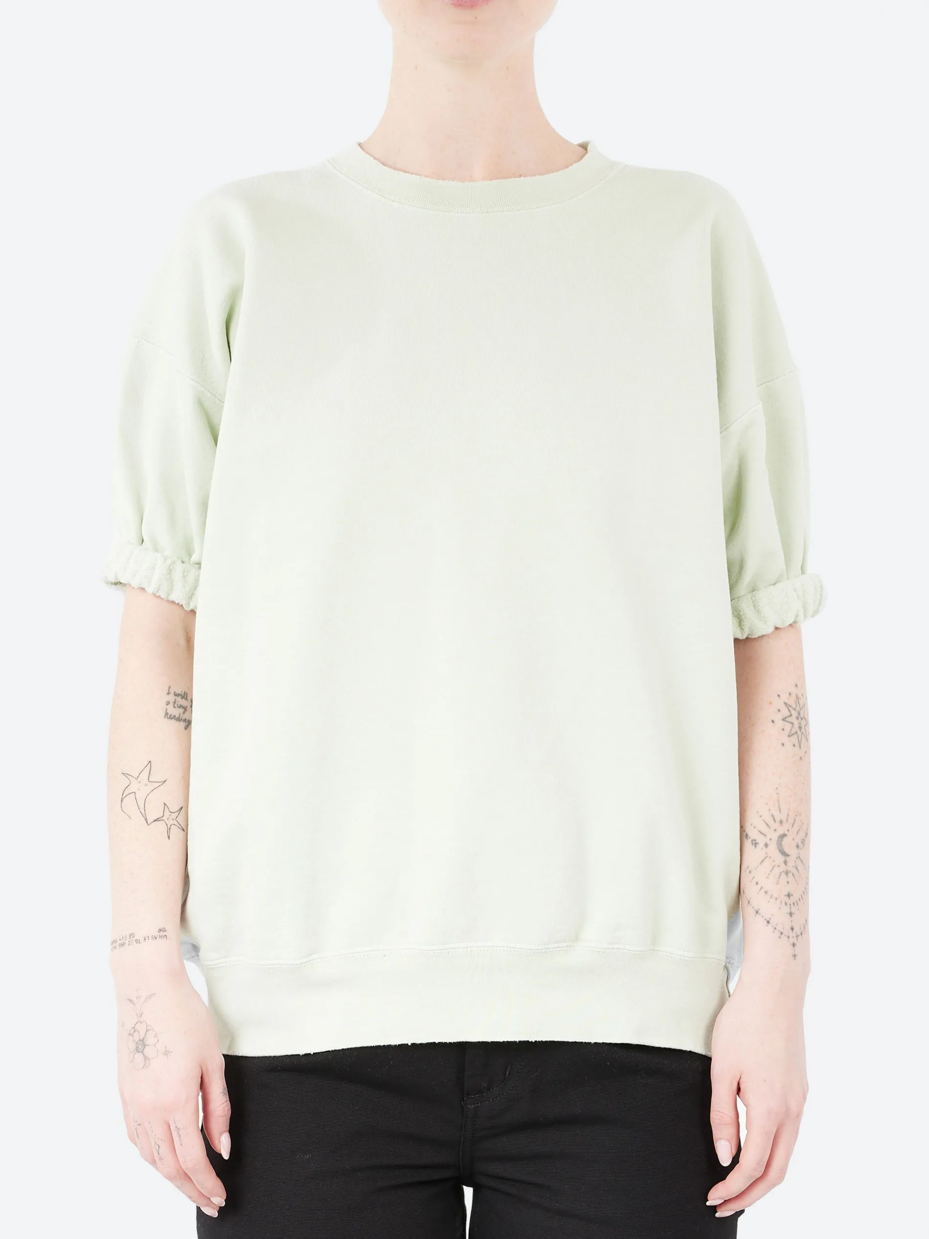 A short sleeve version of Rachel Comey’s essential Fond crewneck sweatshirt, now with a permanently rolled cuff and finished hemline.
