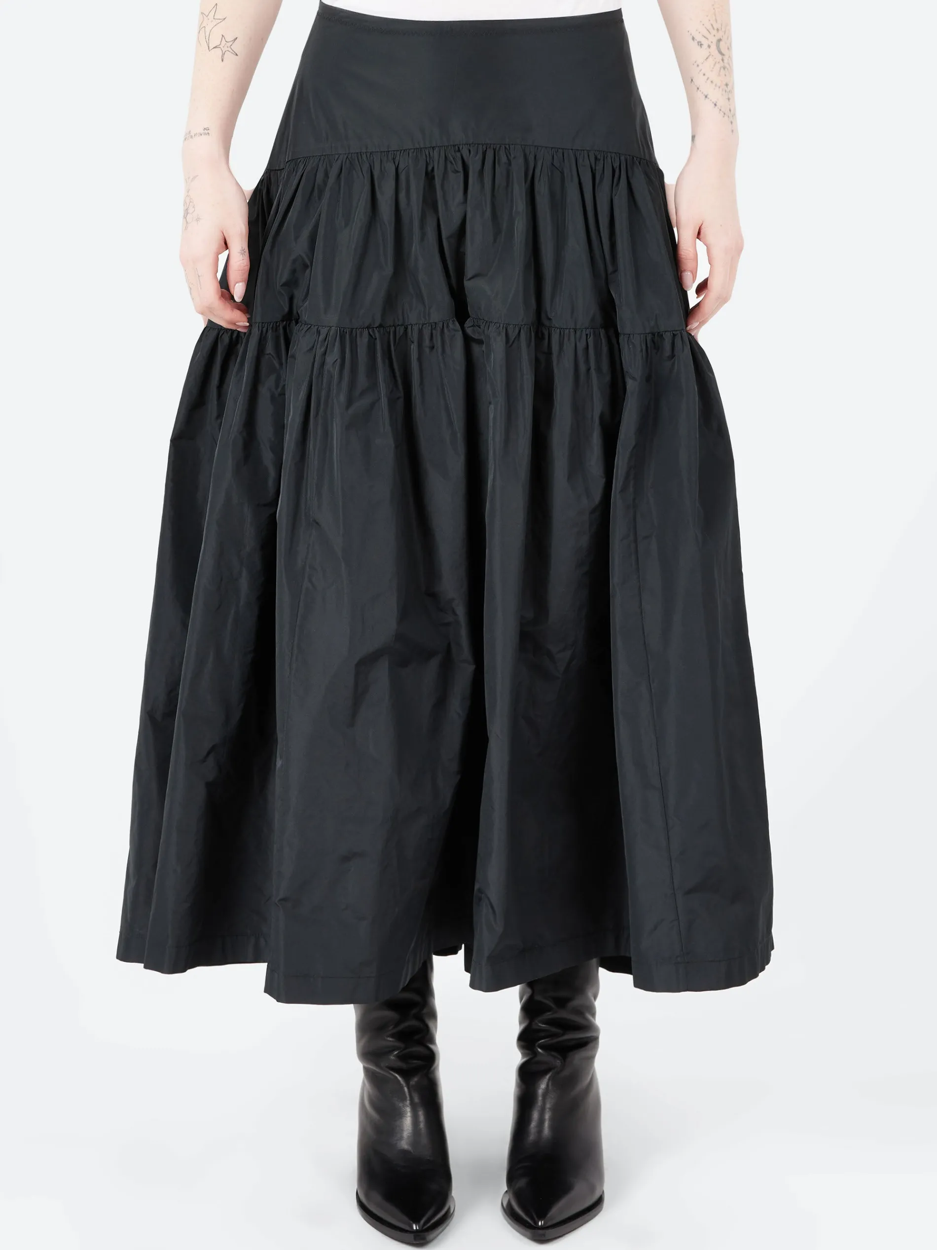 Gathered, tiered full skirt with a high-low hemline and zigzag stitching, in technical lightweight taffeta.