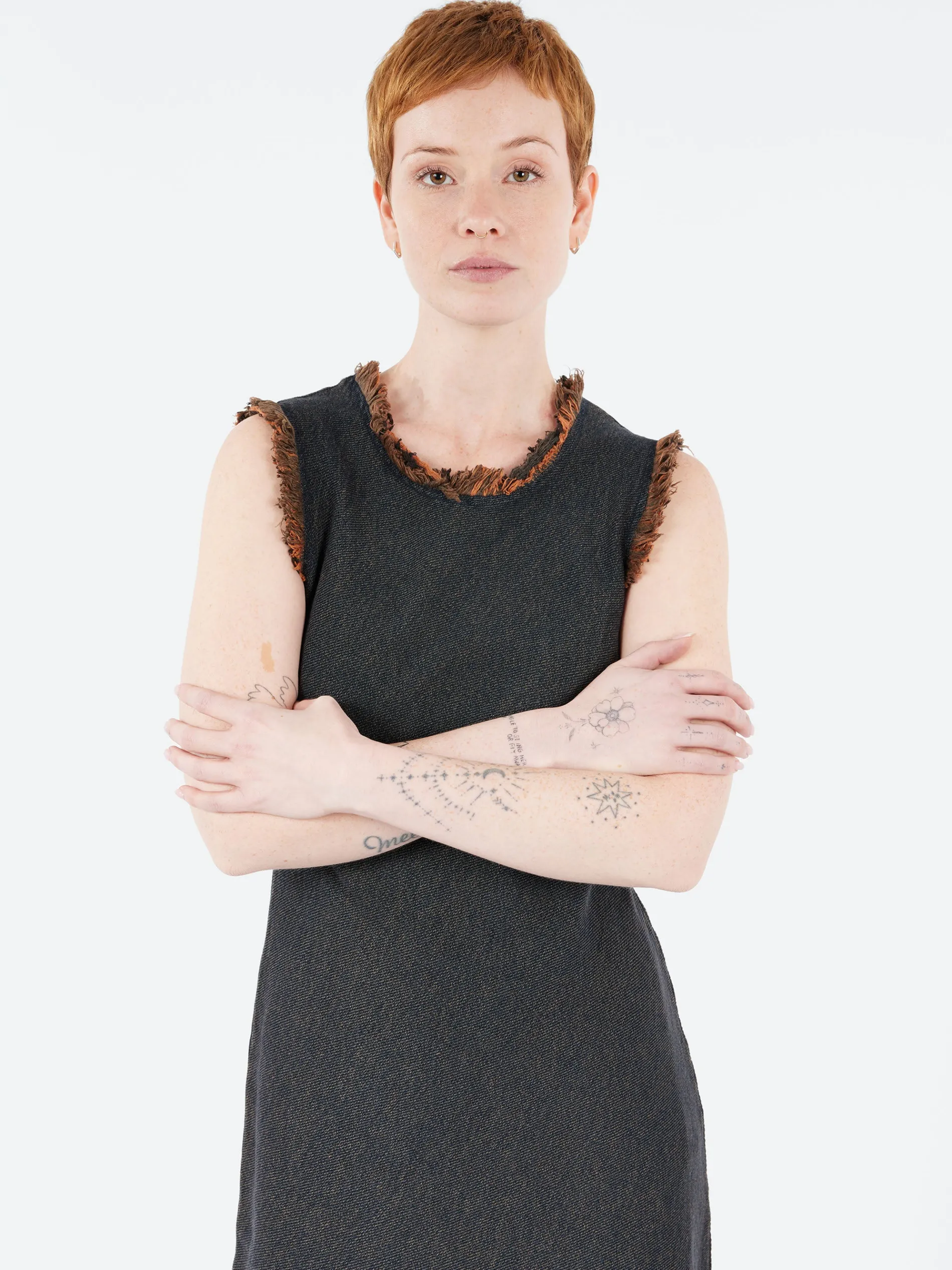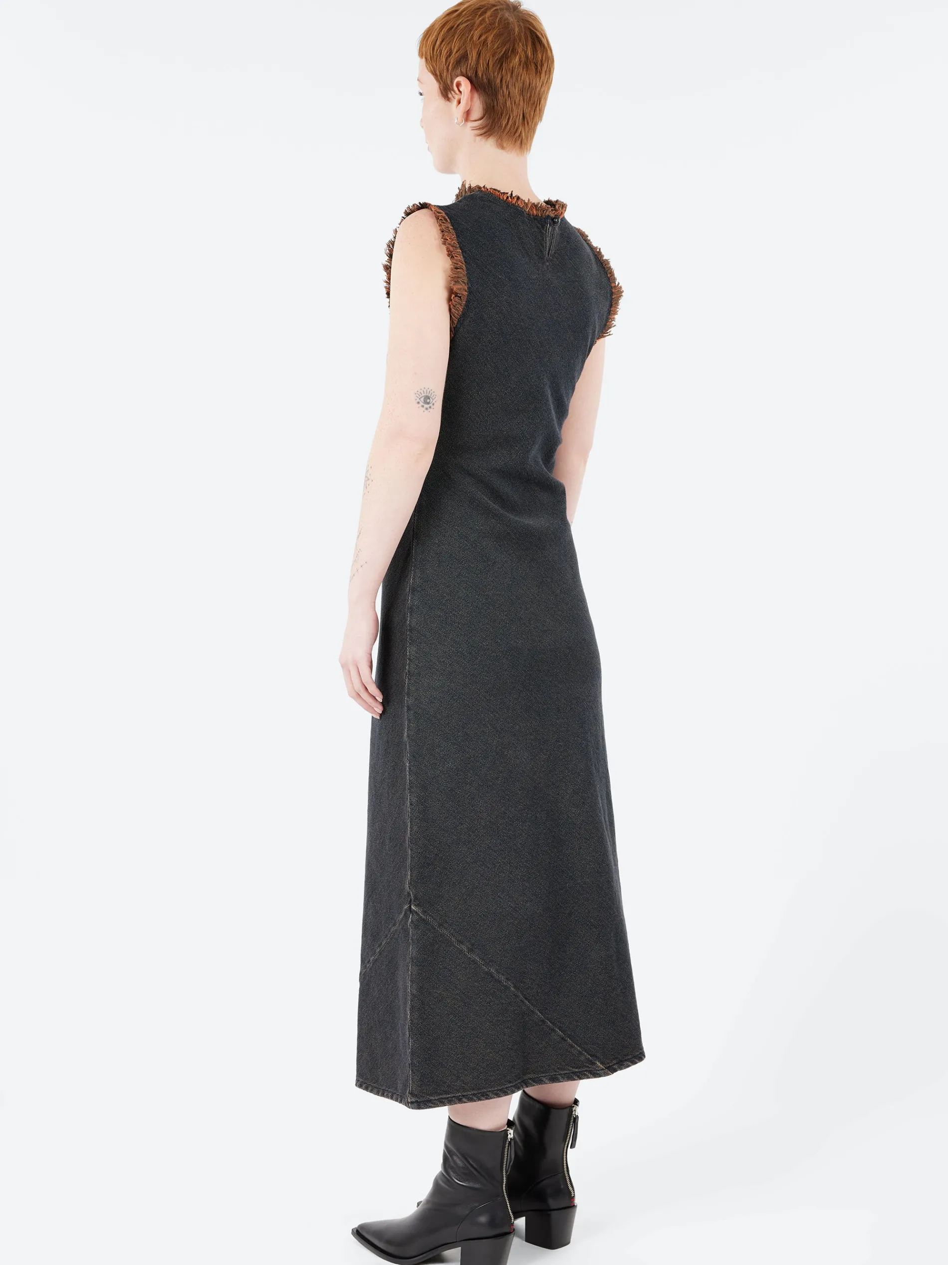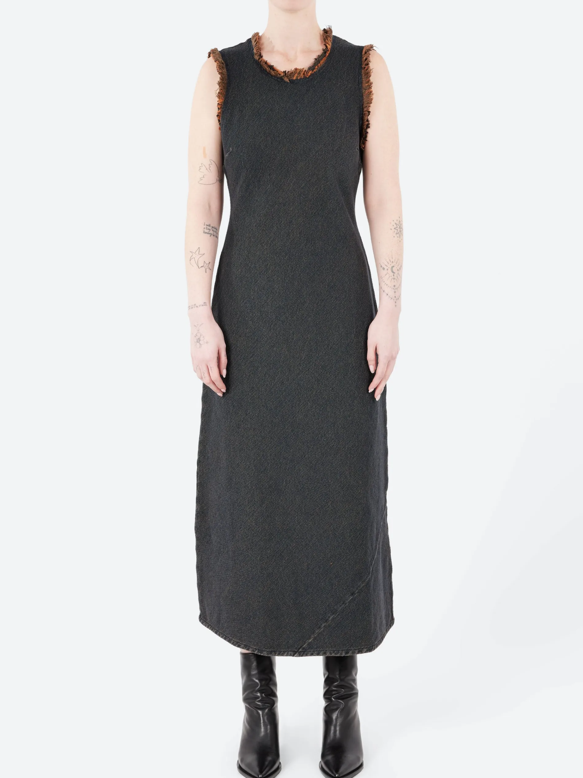 Sleeveless dress cut from overdyed twill denim featuring a raw detail at the armholes and neckline and a diagonal panel at the hem. Designed with a mid-length cut and clean, minimalist silhouette.