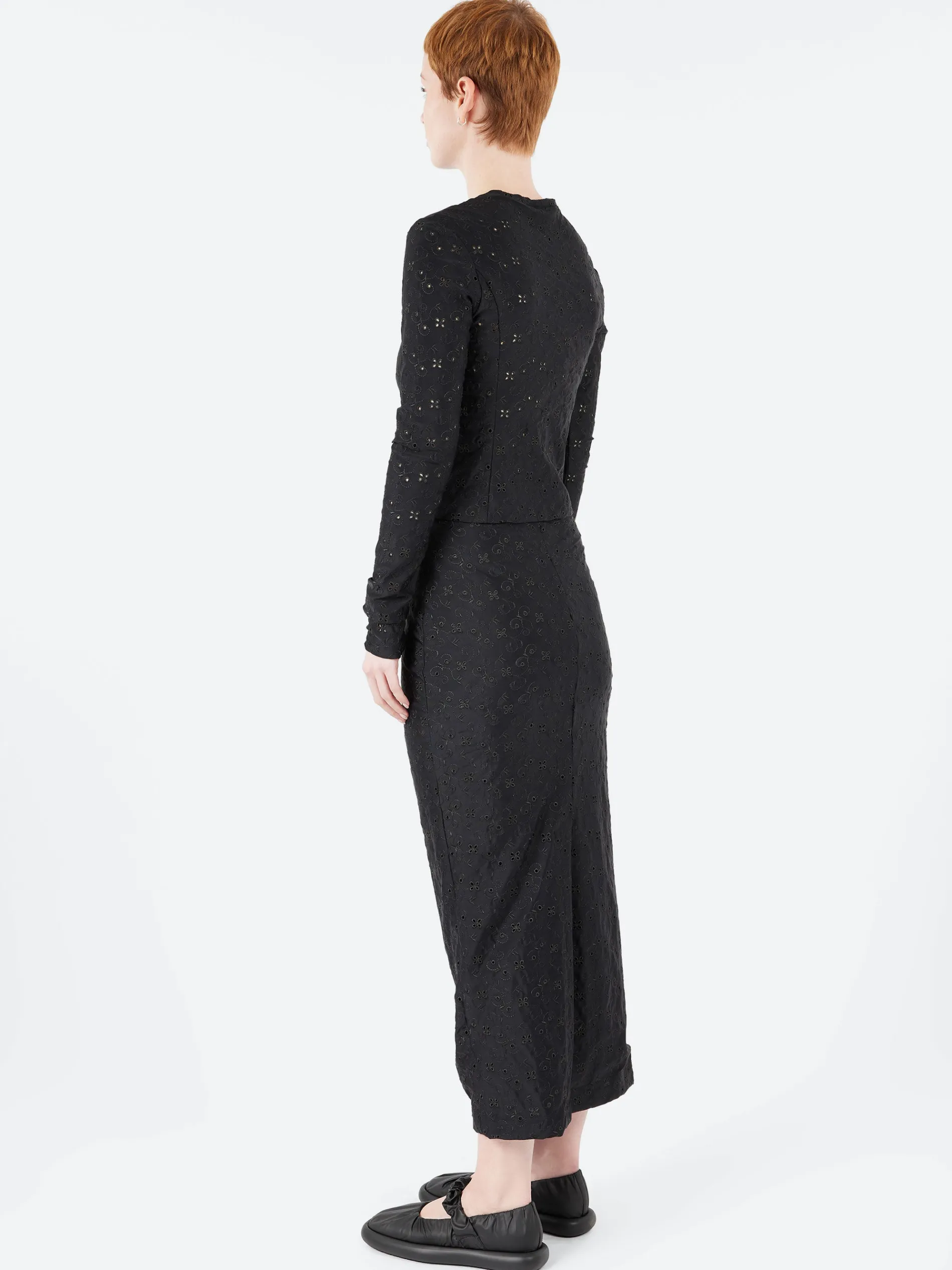 Long sleeve top featuring a round neckline and eyelet detailing throughout. Cut to a slim fit with a straight hem.
