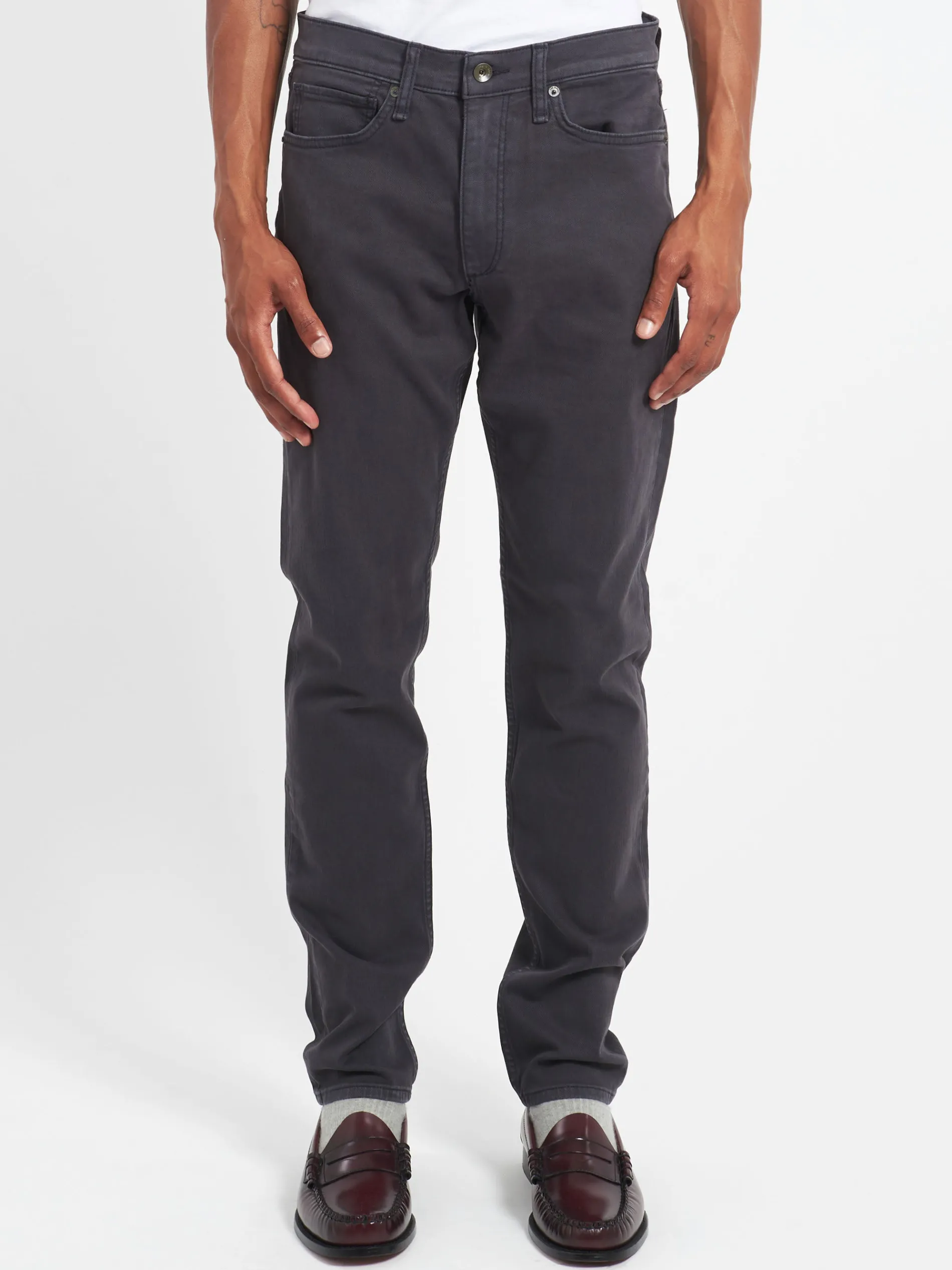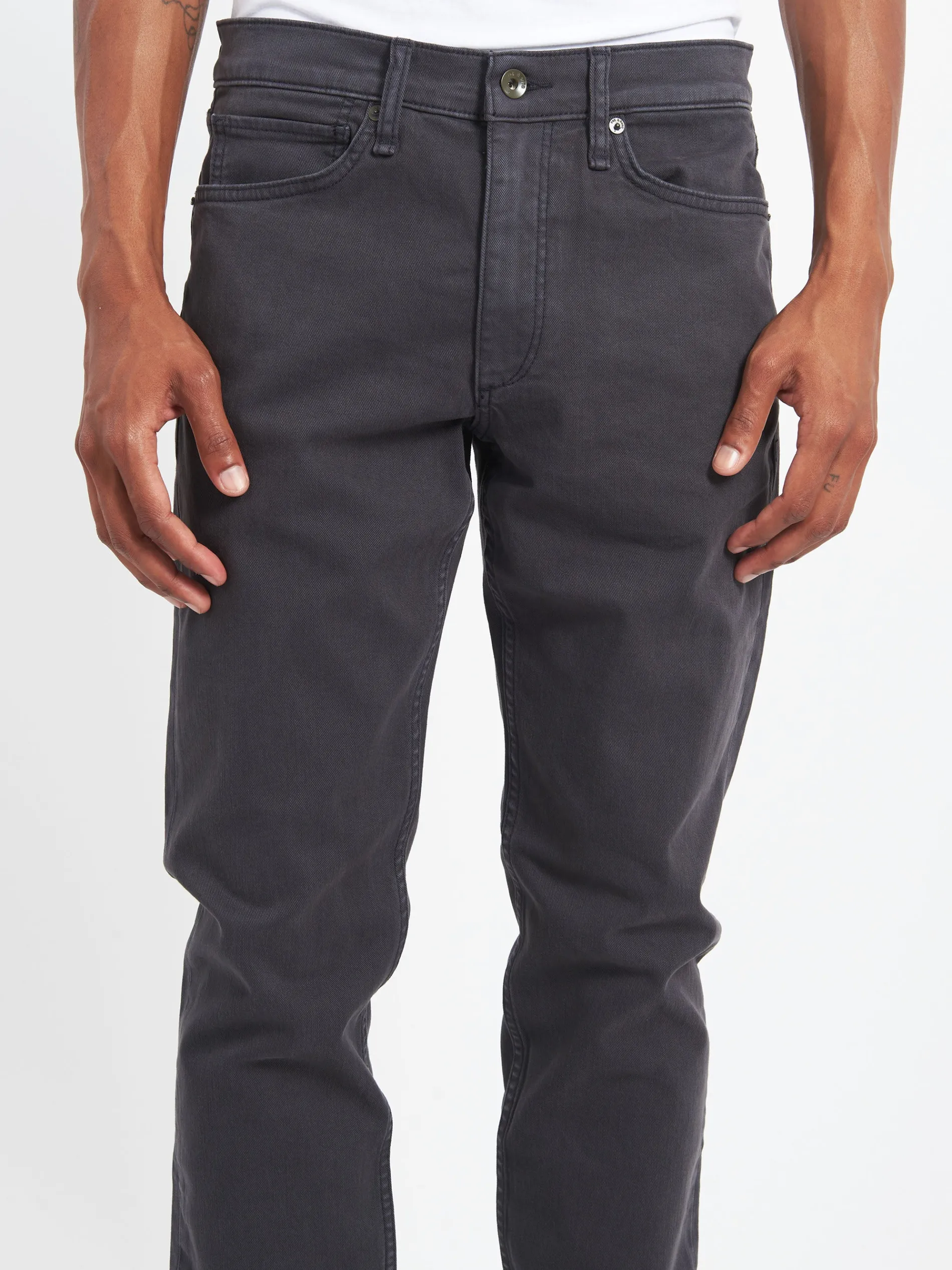 Mid-rise with a slim fit and a tailored leg. Constructed in Aero Stretch lightweight, modern comfort with superior stretch and retention. In Charcoal, a grey garment dye with a clean hem.