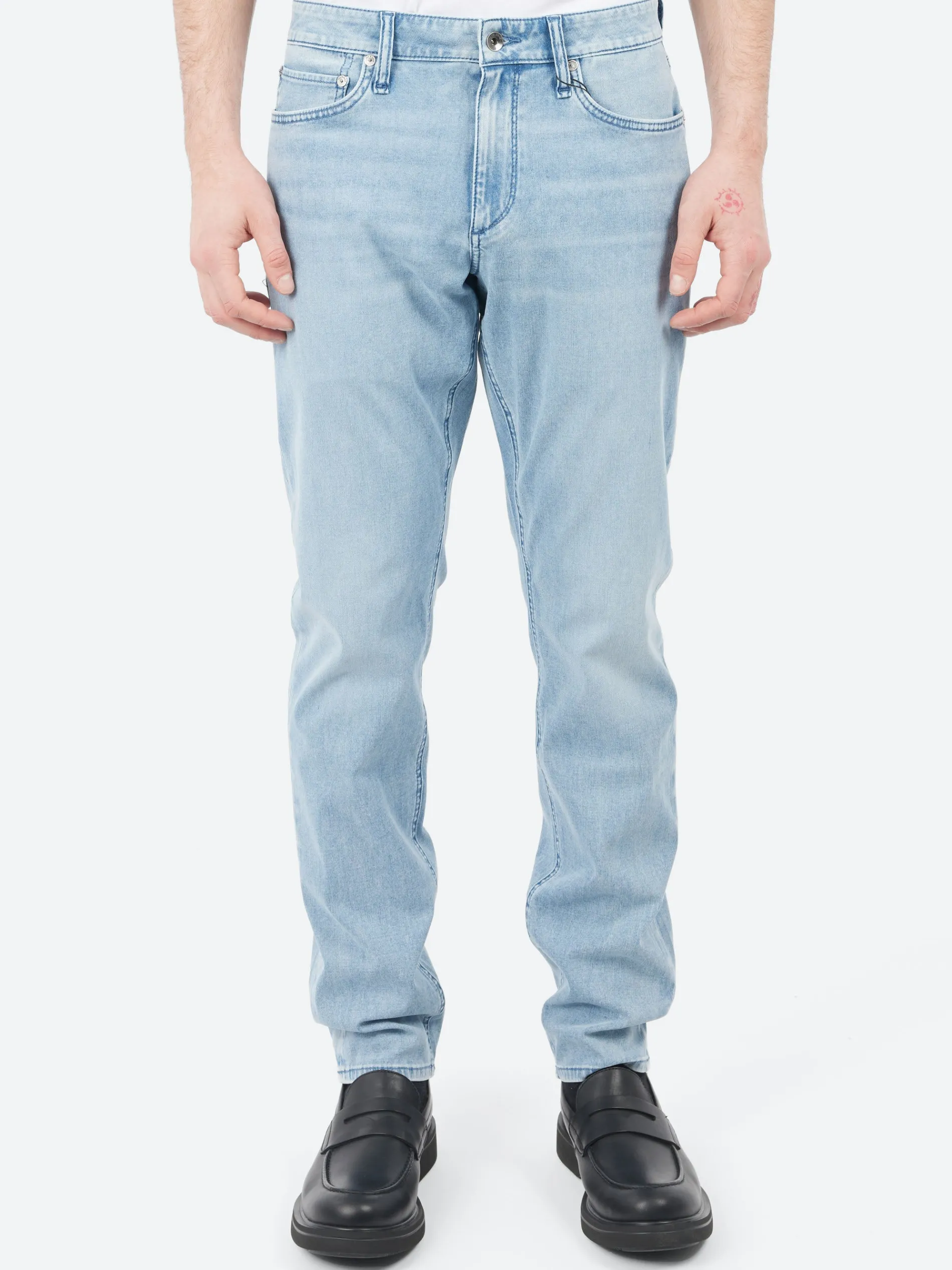 Rag u0026amp; Bone’s athletic fit engineered for mobility. Mid-rise with additional room in the hip and thigh and a subtly tapered leg. Crafted from rbAIRFLEX, their breathable new stretch denim that’s moisture-wicking, light as air, and engineered for a life in motion. In Nostrand, a light indigo wash.