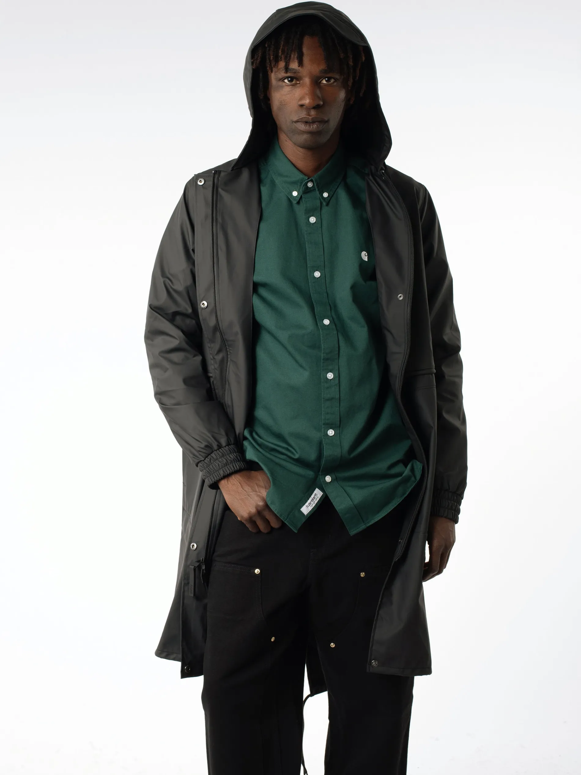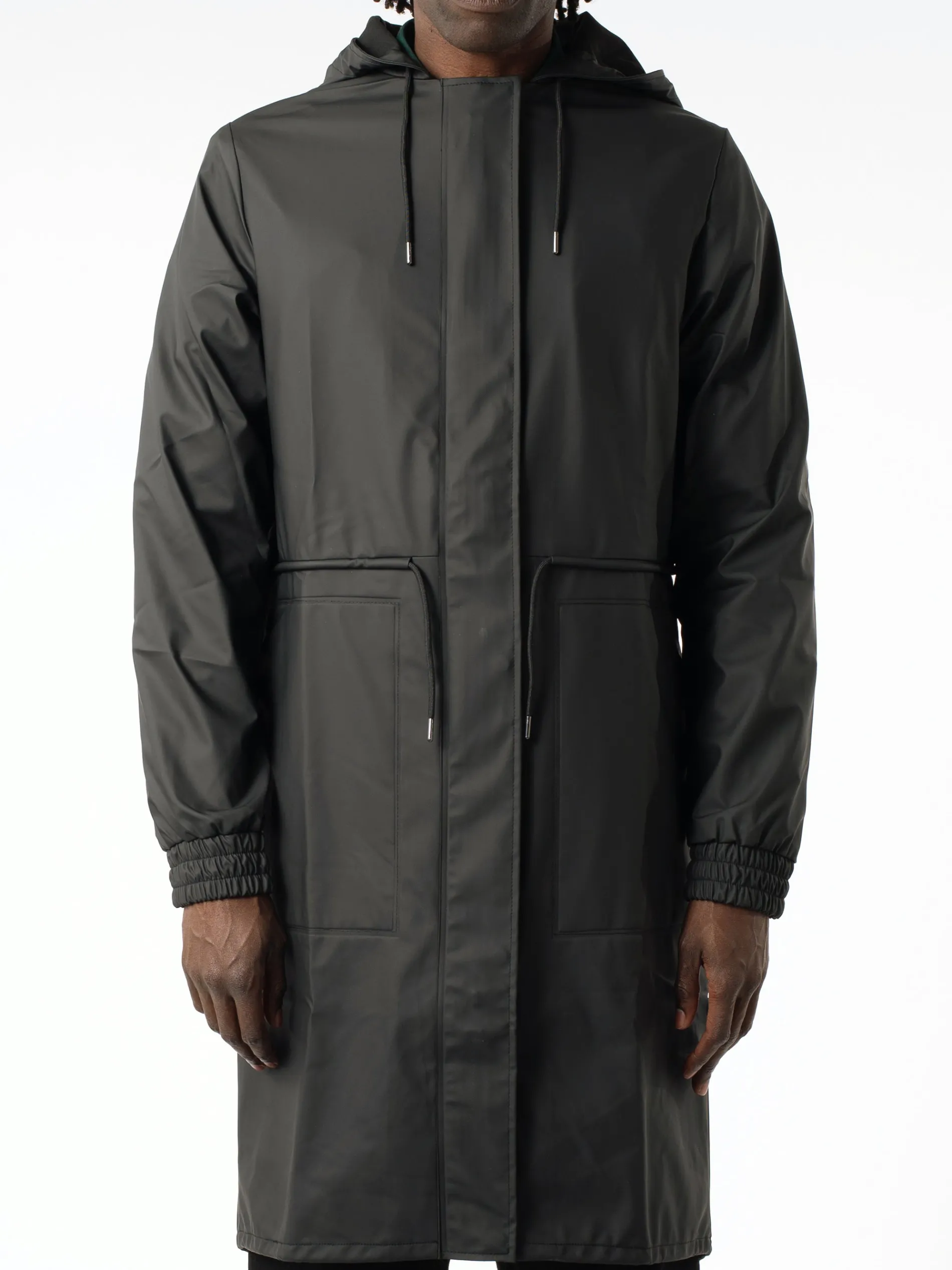 Rains String Parka, an unlined zip-up rain coat. Complete with a drawstring hood.