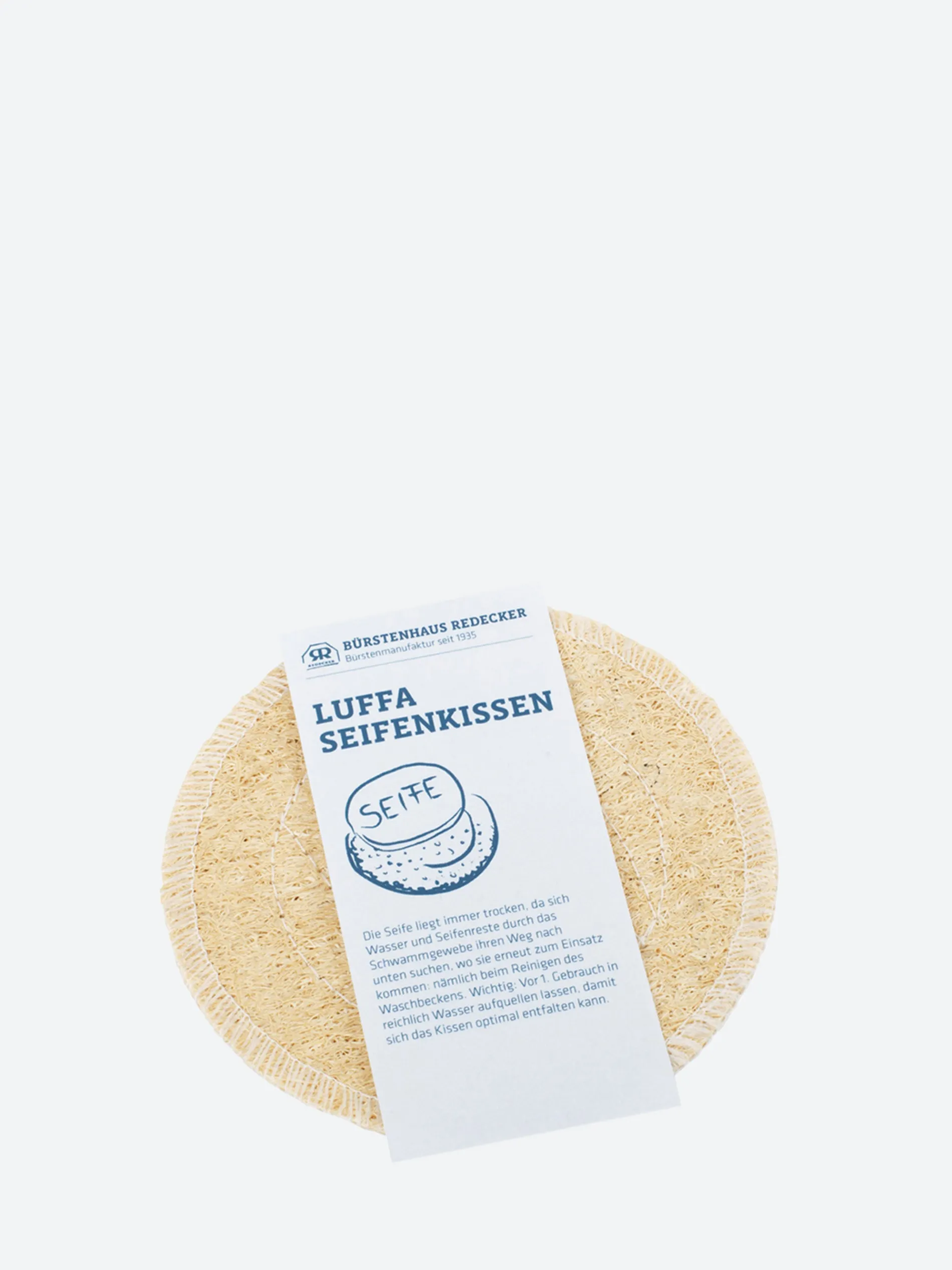 Loofah soap cushions have a dual function: the soap stays dry, and afterwards the cushion can be used for surface cleaning.