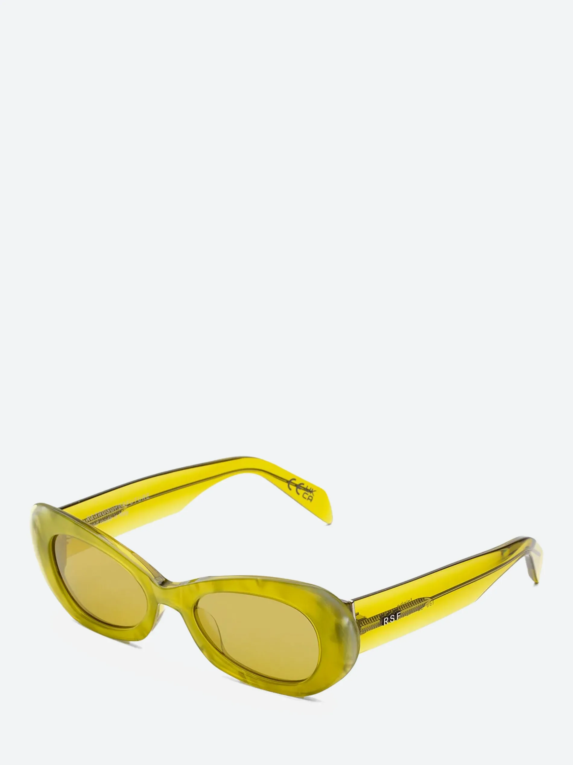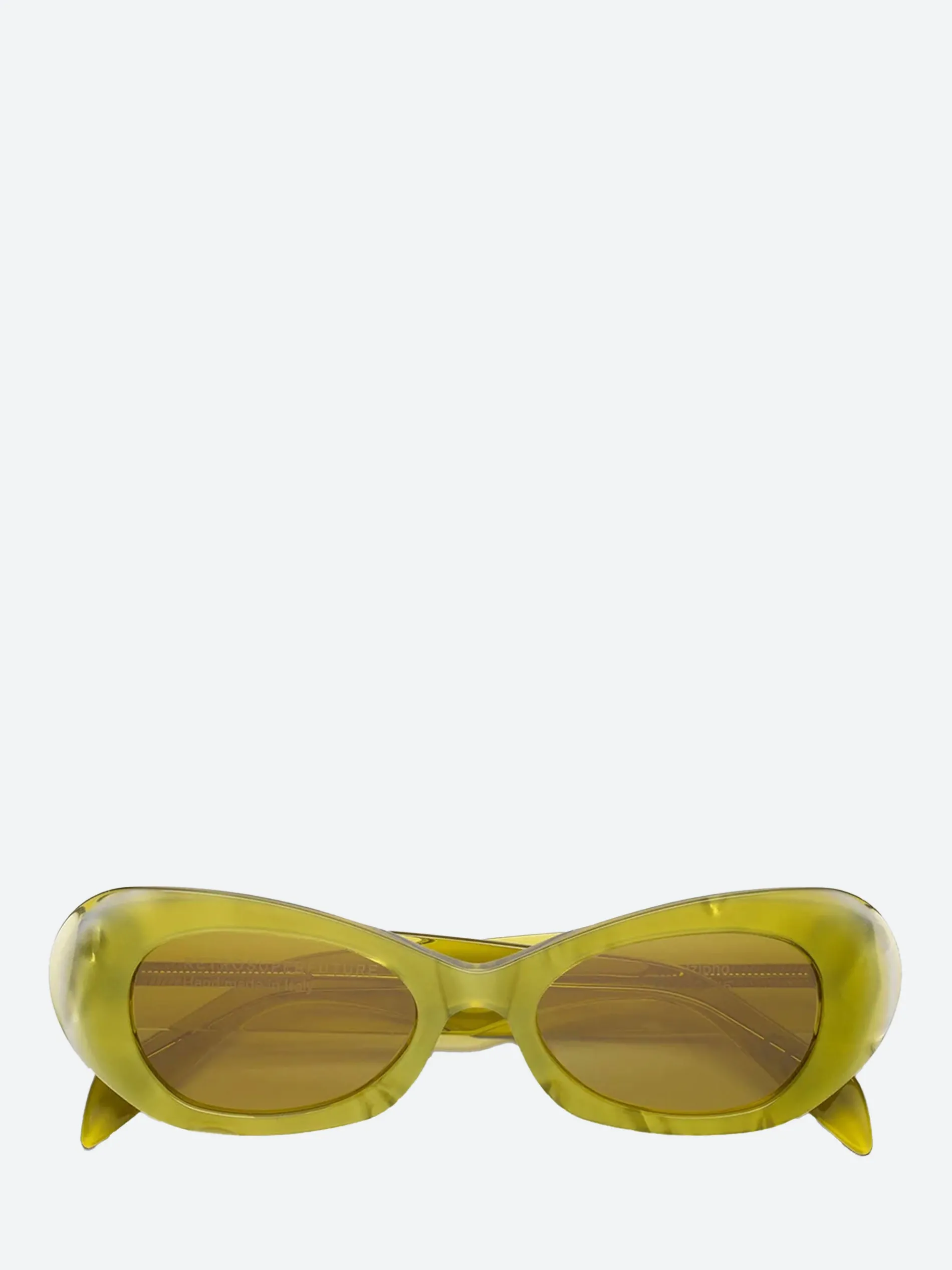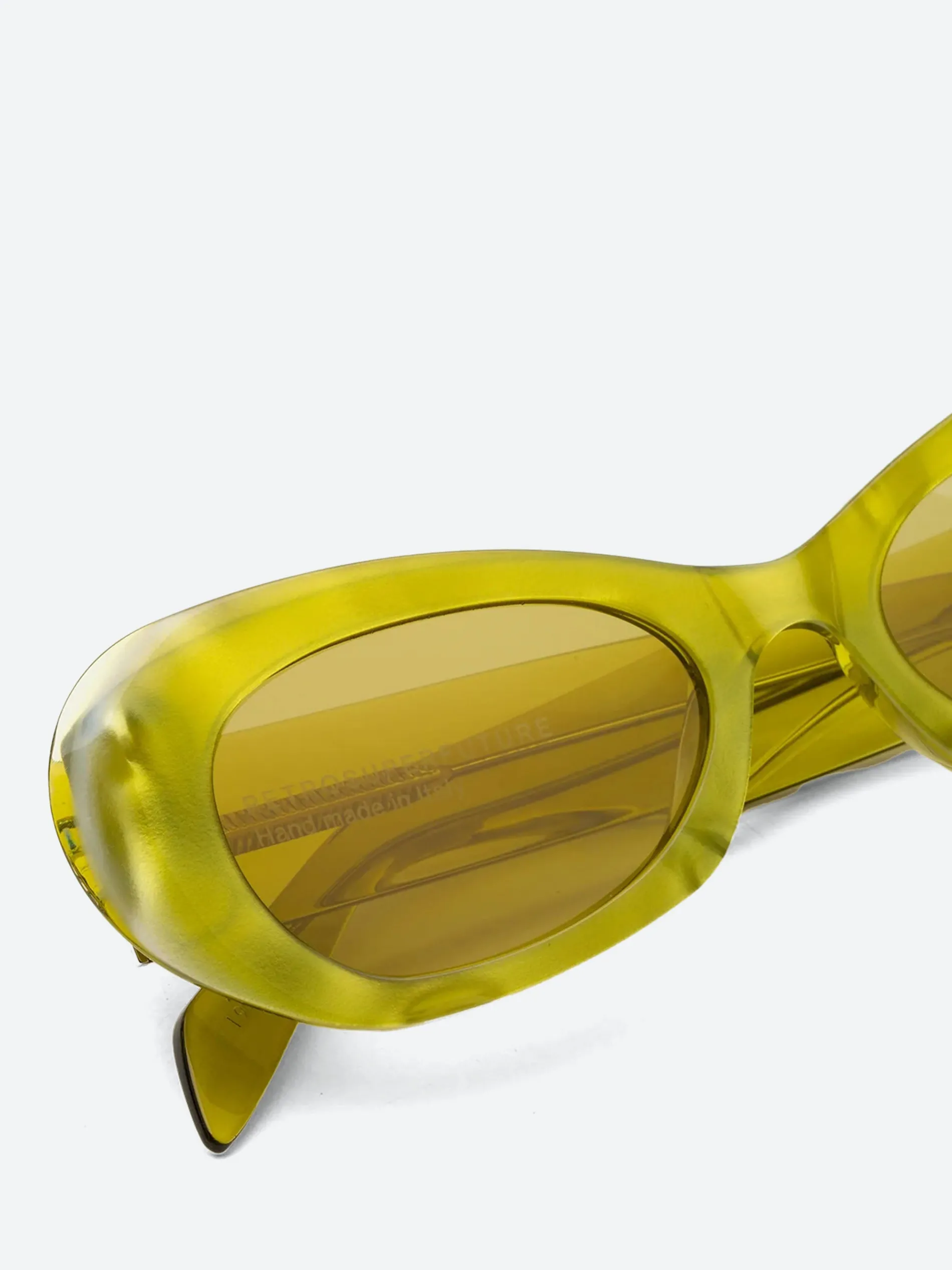 The Izipho Mindless sunglasses from RETROSUPERFUTURE are a bold and avant-garde eyewear choice. Handcrafted in Italy, these sunglasses feature high-grade Italian acetate in a striking acid yellow crystal frame, complemented by matching Zeiss lenses in base 6. This combination offers both visual impact and superior optical clarity.