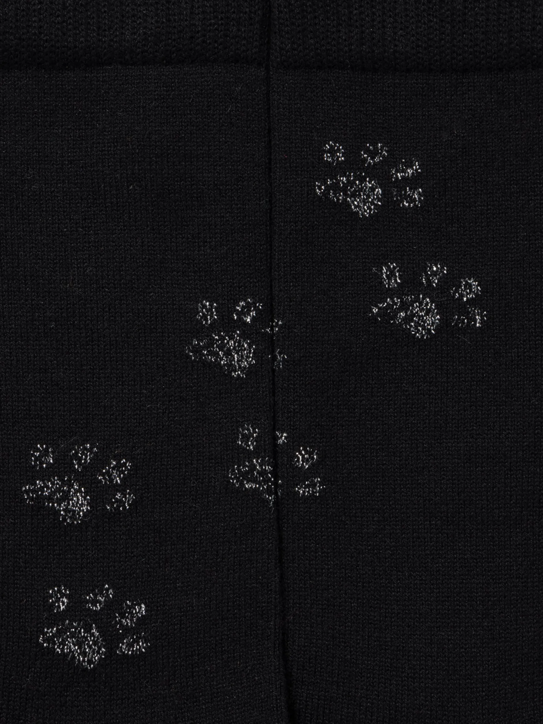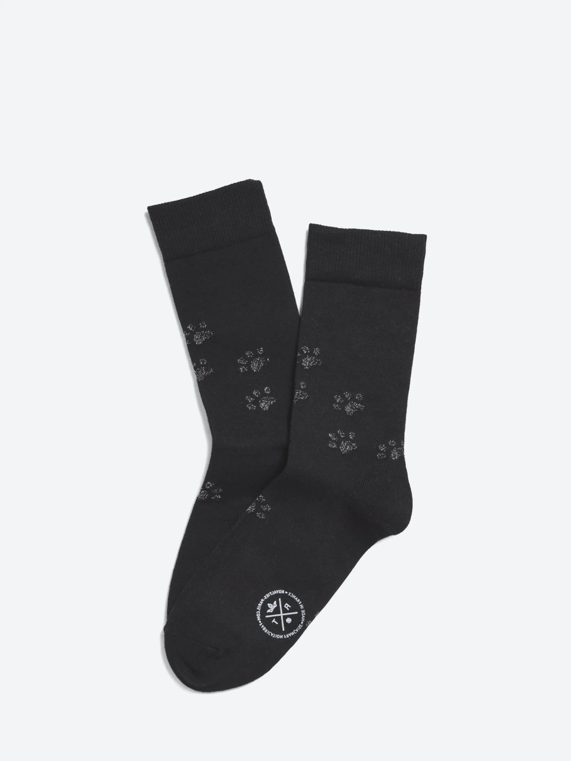 These jacquard socks evoke the traces left by the paws of a cat. The contrast between the matte cotton yarn and lurex shimmer of the pawprints gives this design its playful subtlety.