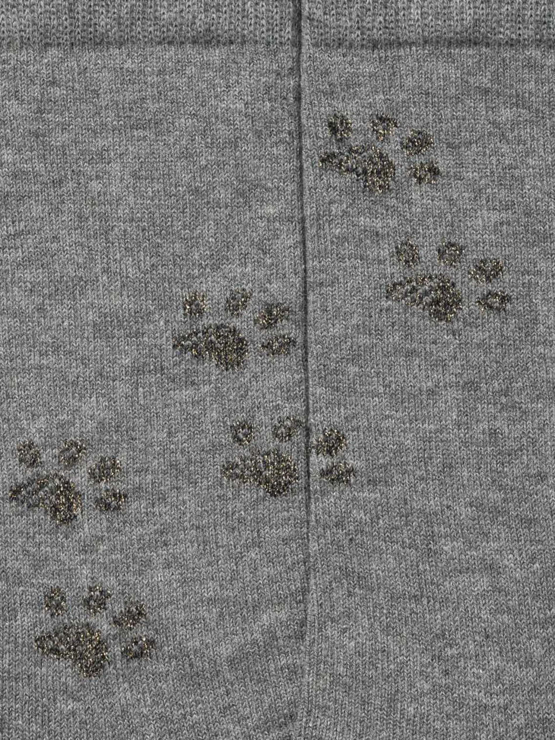 These jacquard socks evoke the traces left by the paws of a cat. The contrast between the matte cotton yarn and lurex shimmer of the pawprints gives this design its playful subtlety.