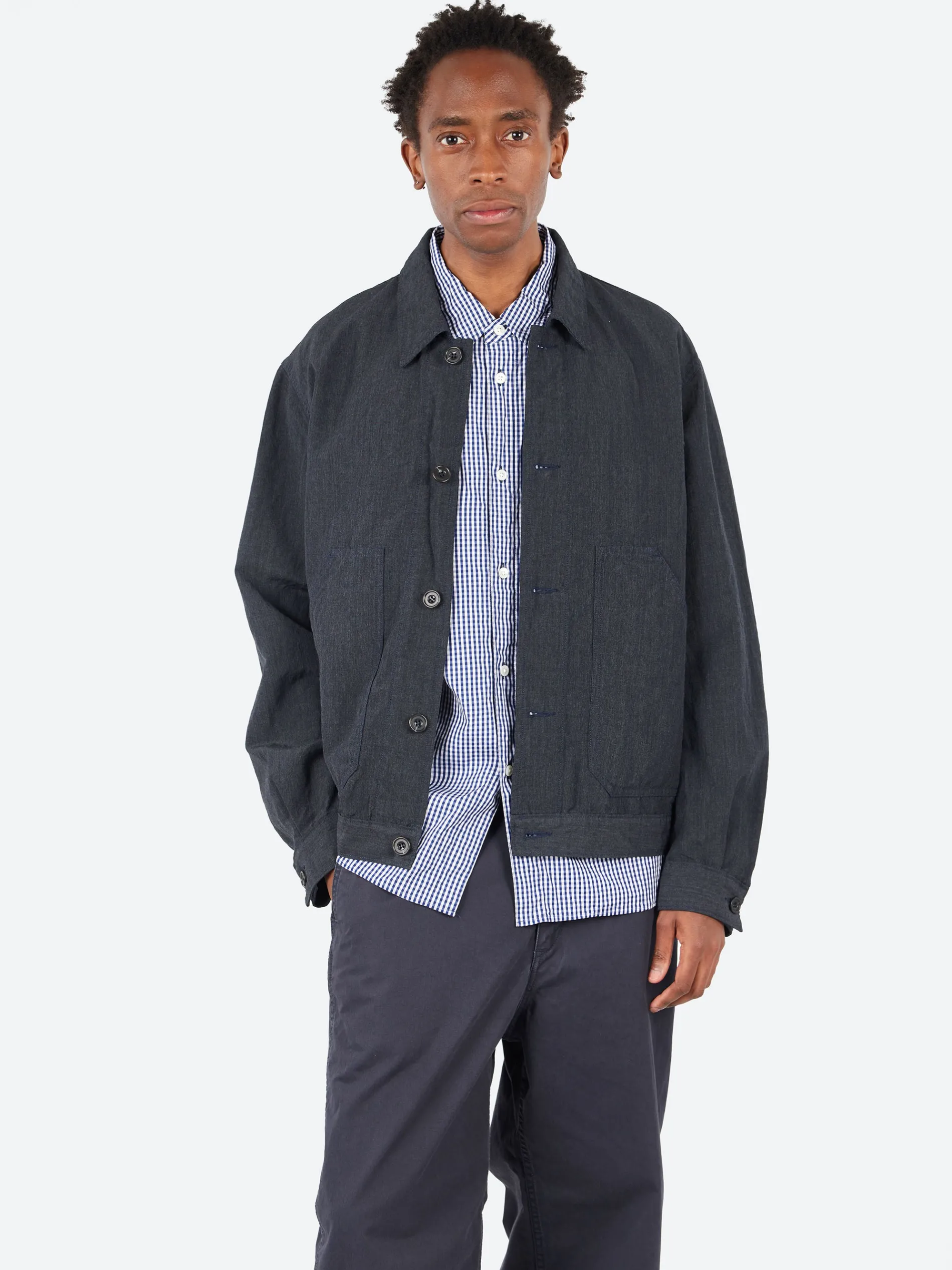 This loose-fitting short jacket features dropped shoulders and sleeves that are curved like an MA-1, adding a unique and stylish touch. It includes work-style pockets and subtle color stitching, enhancing its overall design. The outer material is a finely woven plain weave fabric made from yarn-dyed wool linen, crafted to the limit for a refined, textured finish.