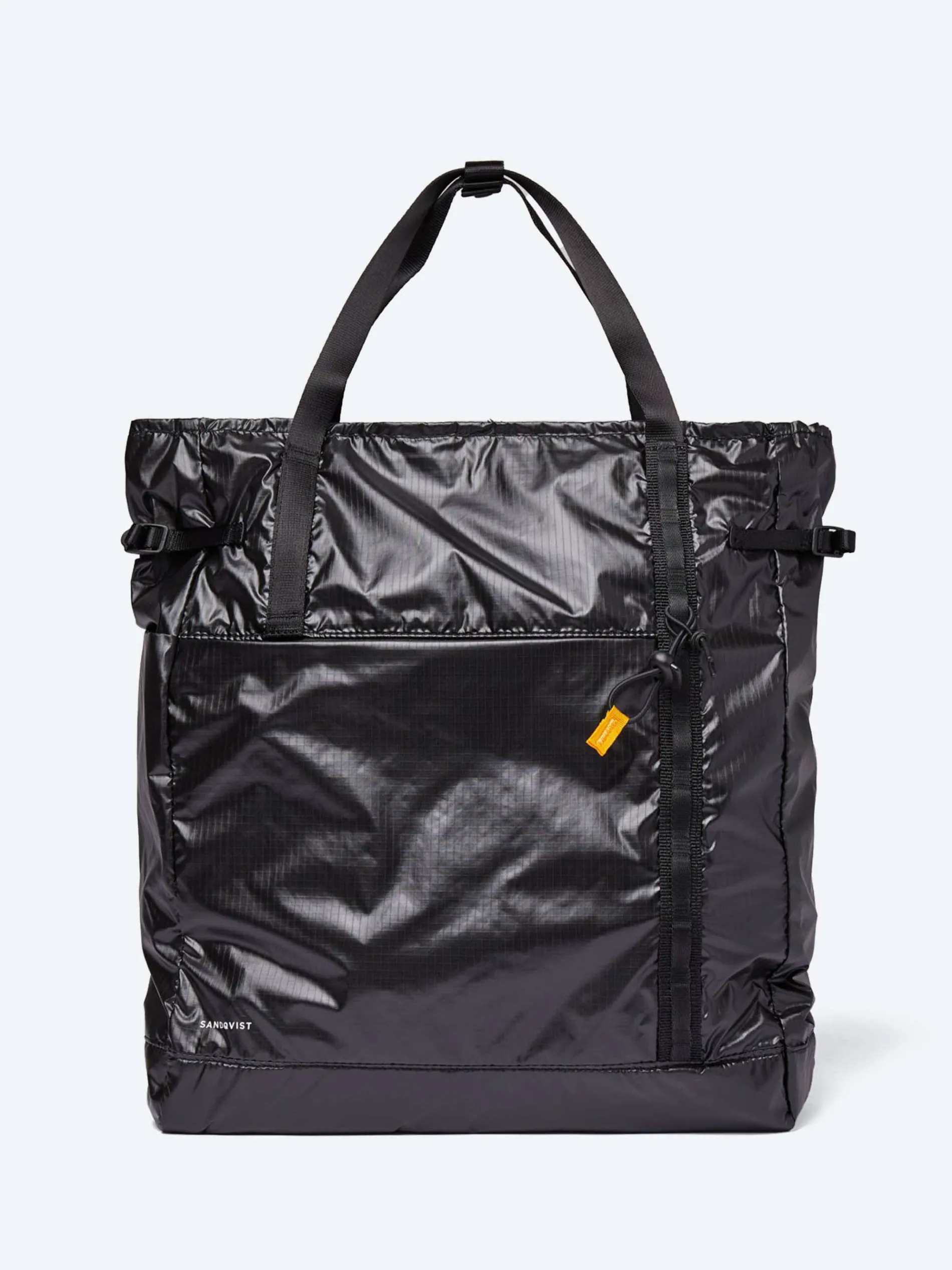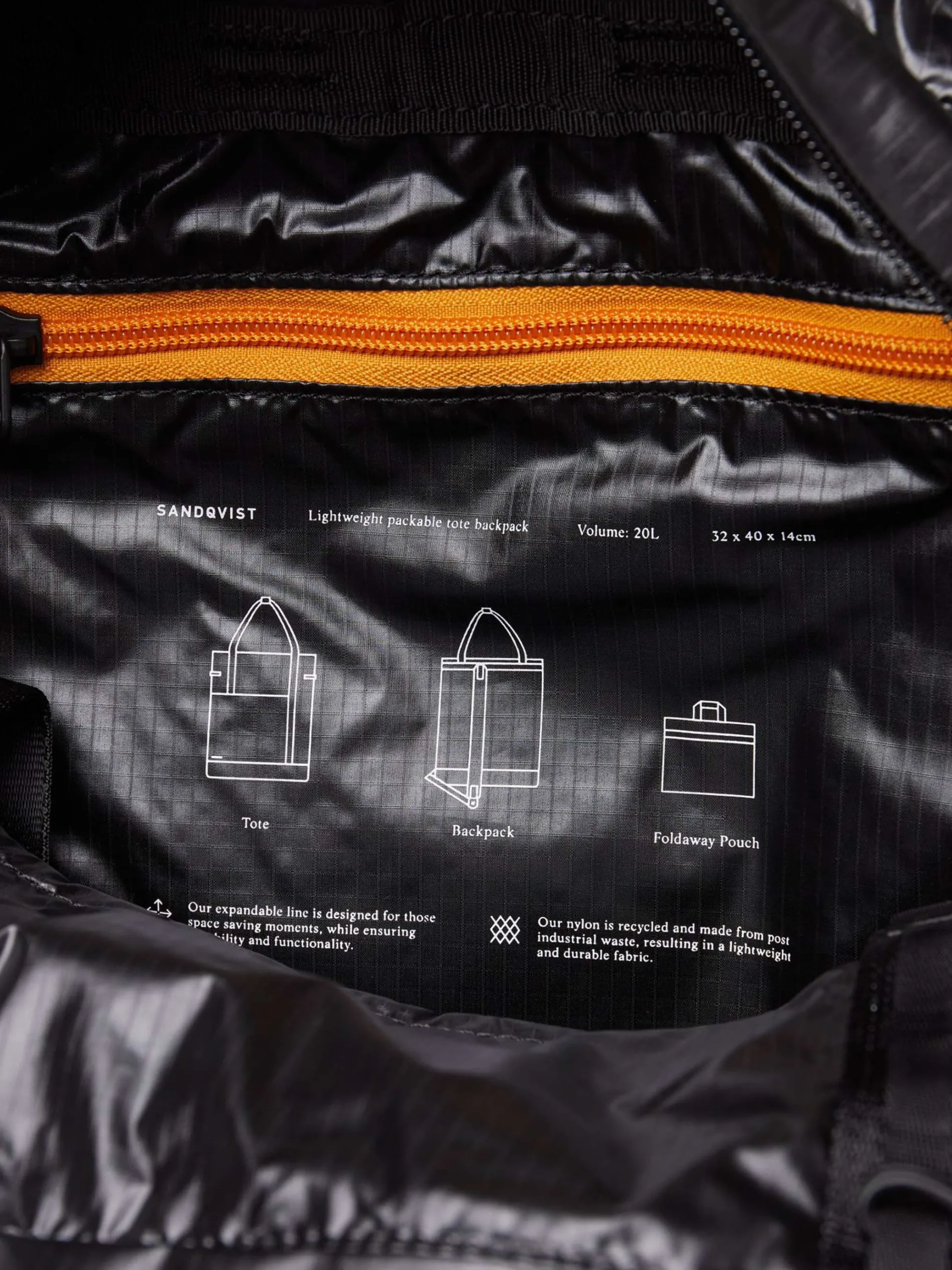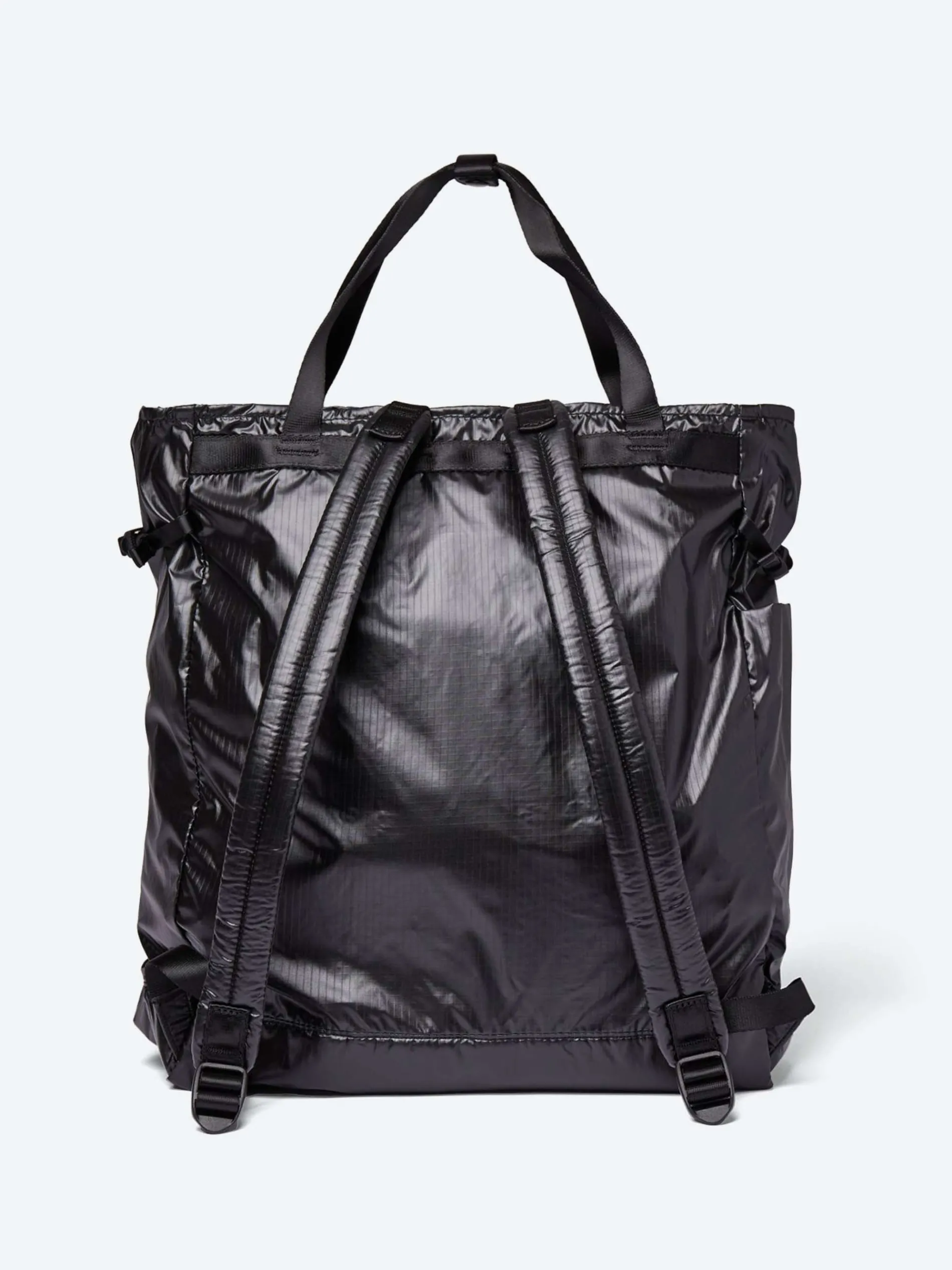 Foldable tote backpack made from 100% recycled nylon twin ripstop.