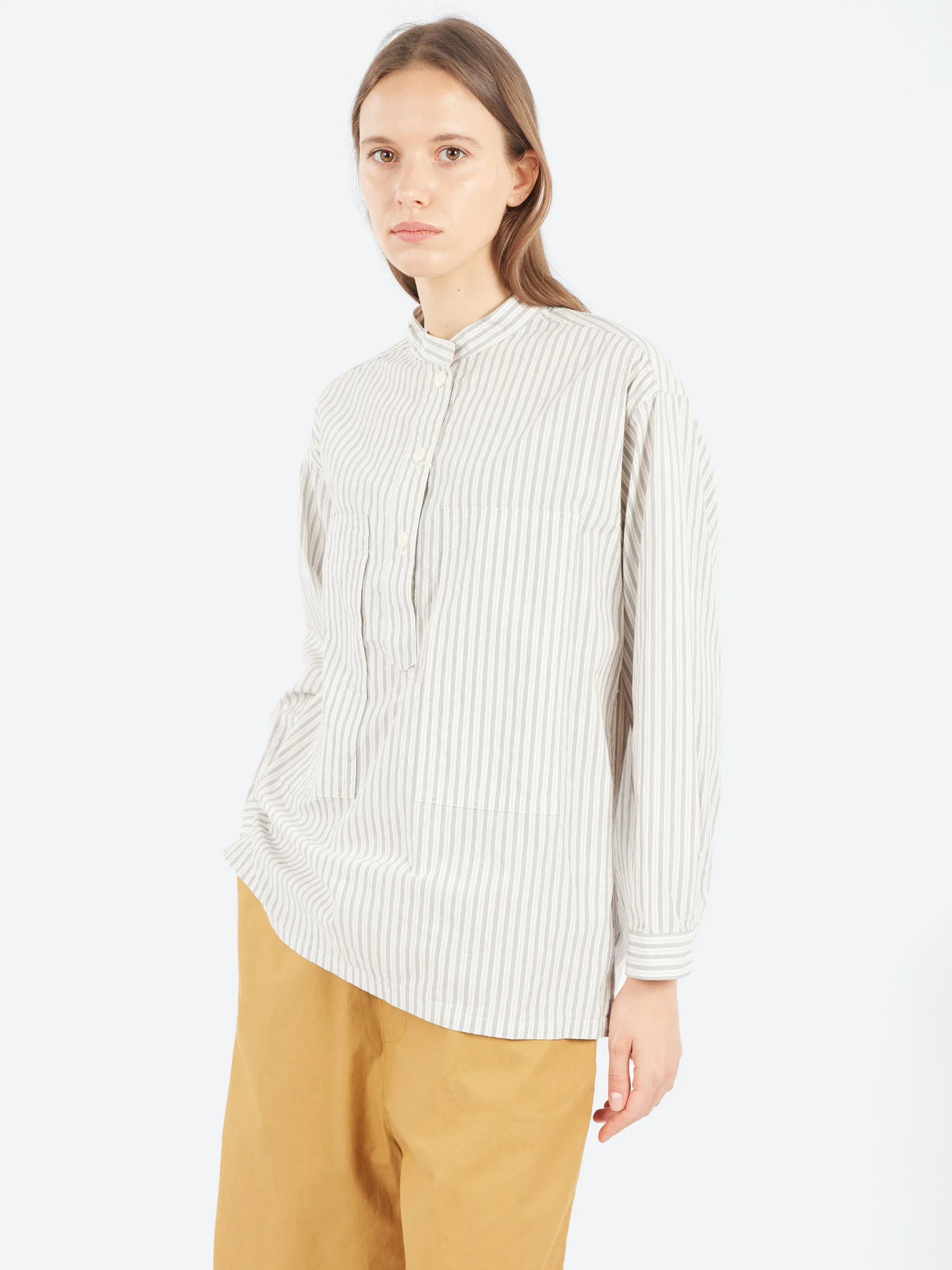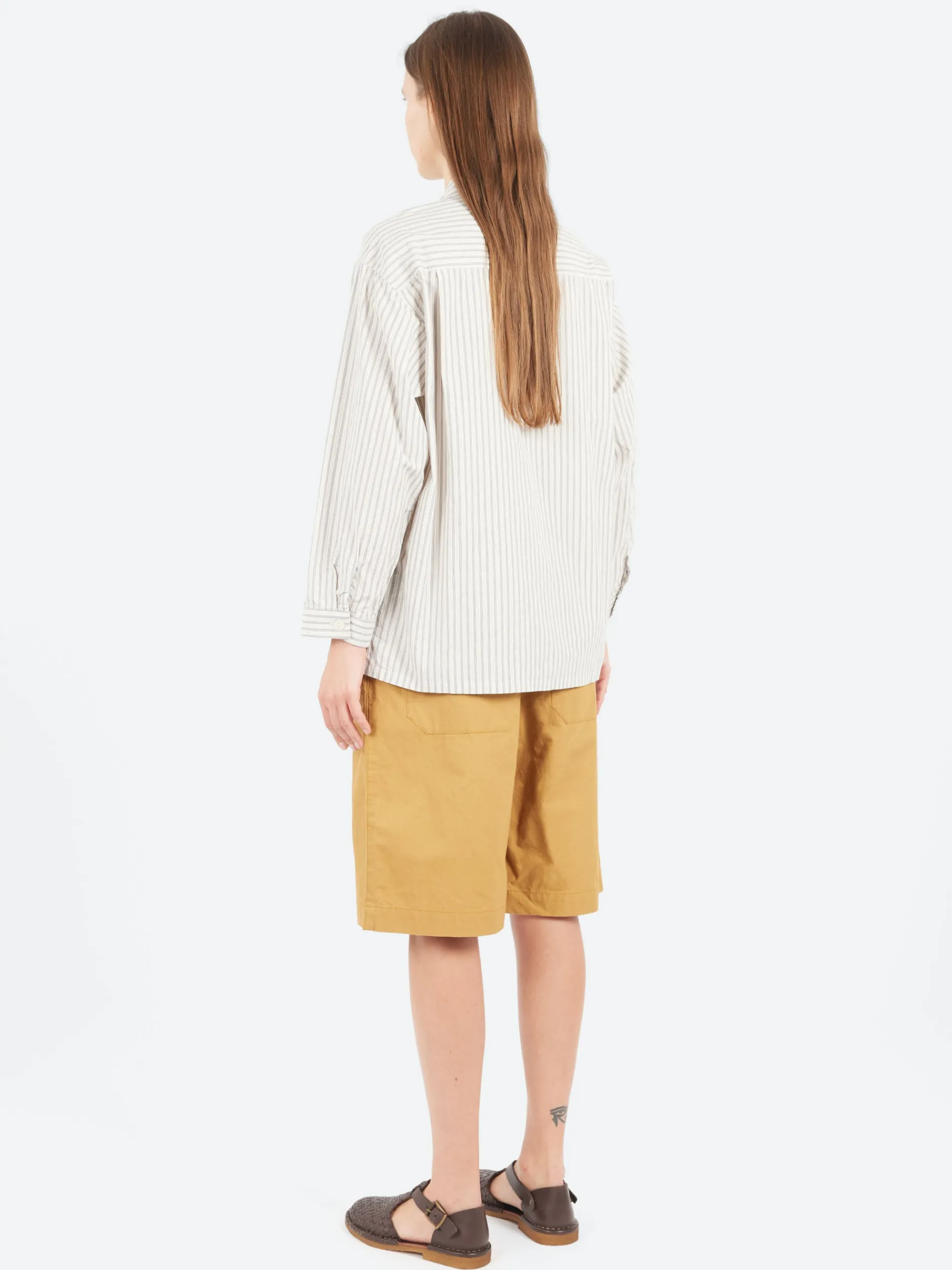 This Sarahwear Carpenter Shirt is crafted from densely woven, firm poplin fabric, offering durability and a natural, washed texture for a comfortable, work-ready style. This loose-fitting pullover shirt features unique pockets on both sides of the chest, adding both functionality and distinctive design. Ideal for those seeking a practical yet stylish option for everyday wear.