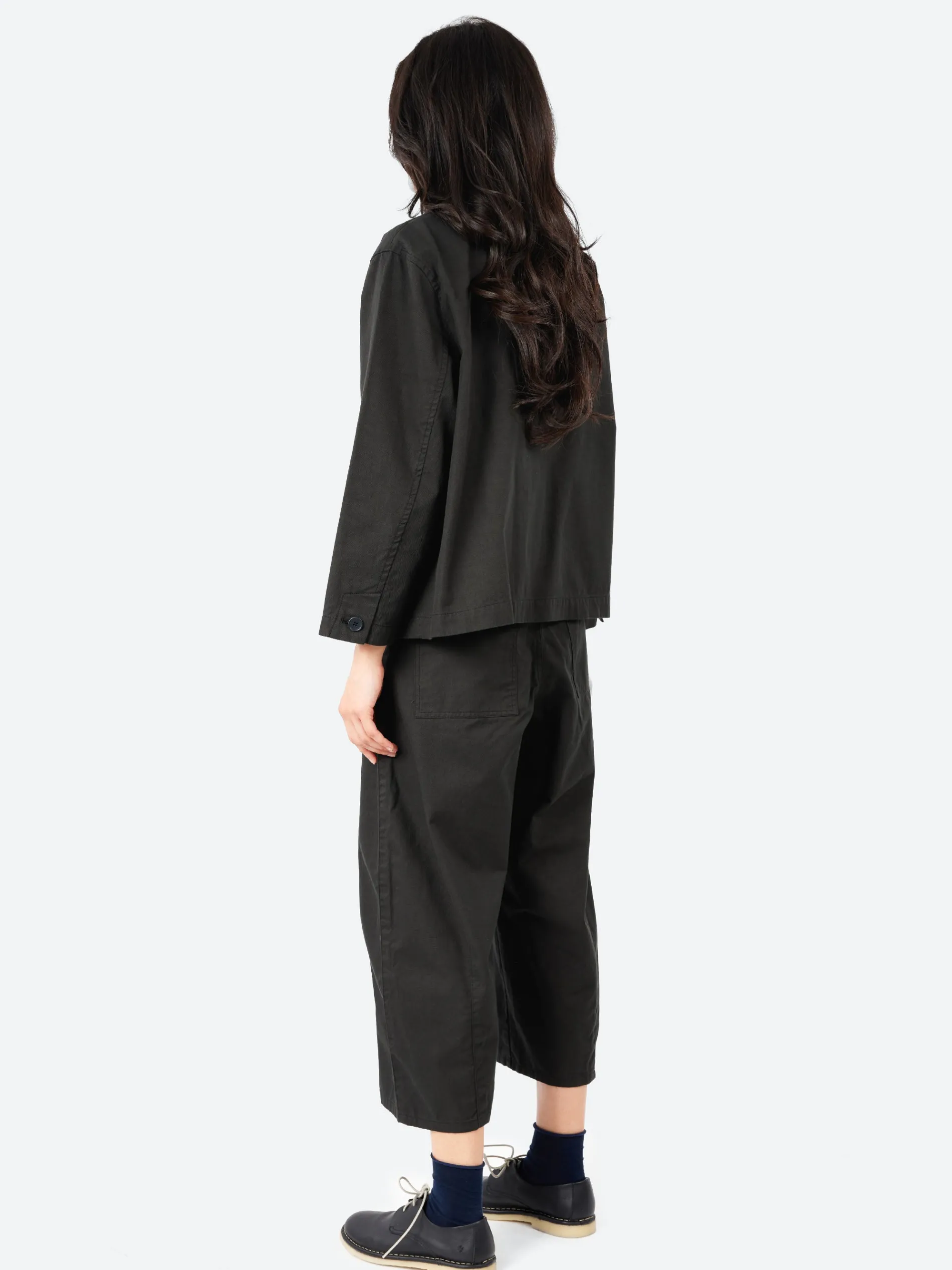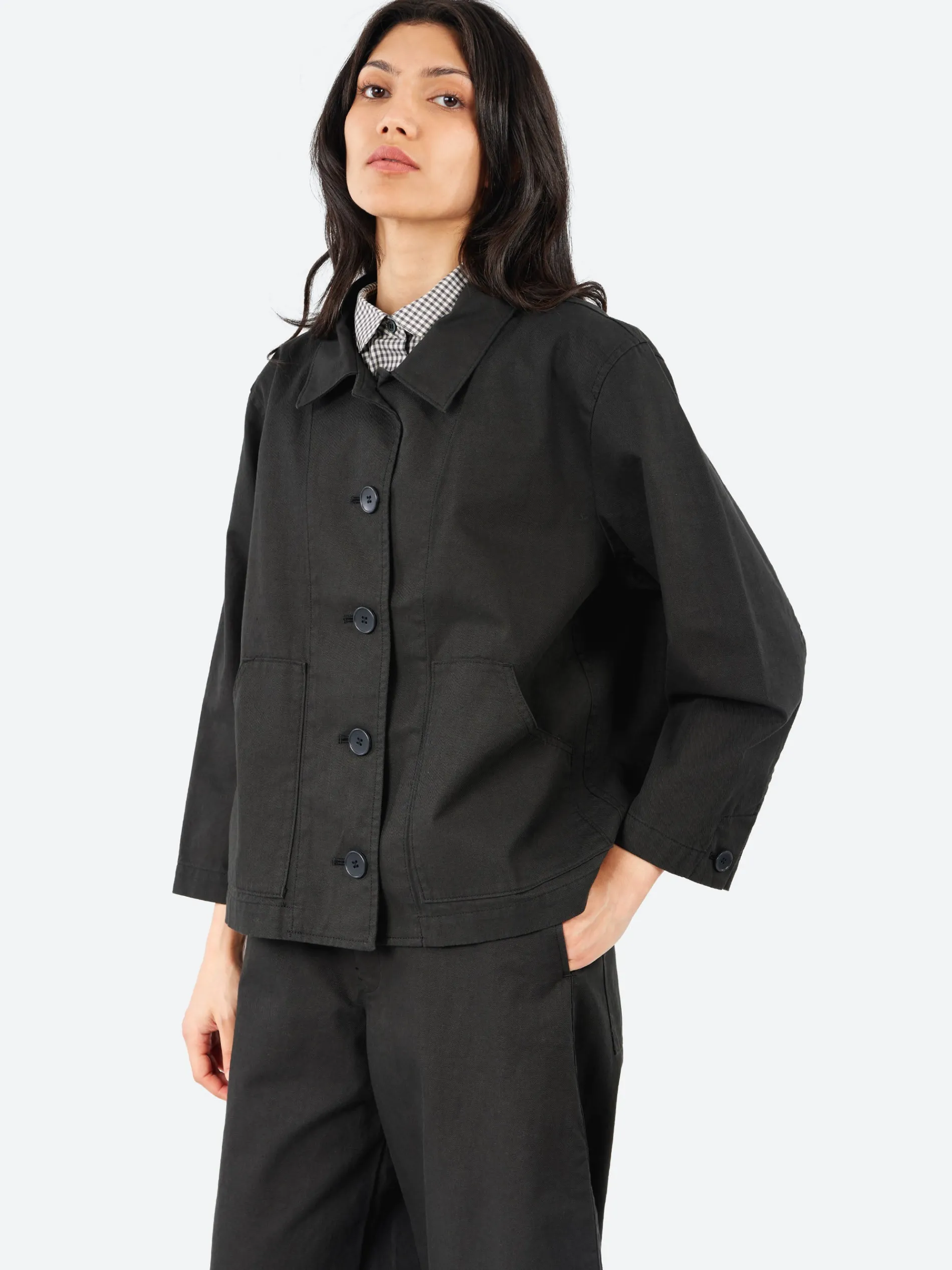 Inspired by the timeless style of 70’s folk singers. With its rounded neckline and loose, boxy silhouette, it offers both ease of layering and comfort. Made from light, soft organic cotton twill, the fabric has a natural luster. Perfect for layering with seasonal innerwear, this jacket is versatile enough to be worn throughout every season.