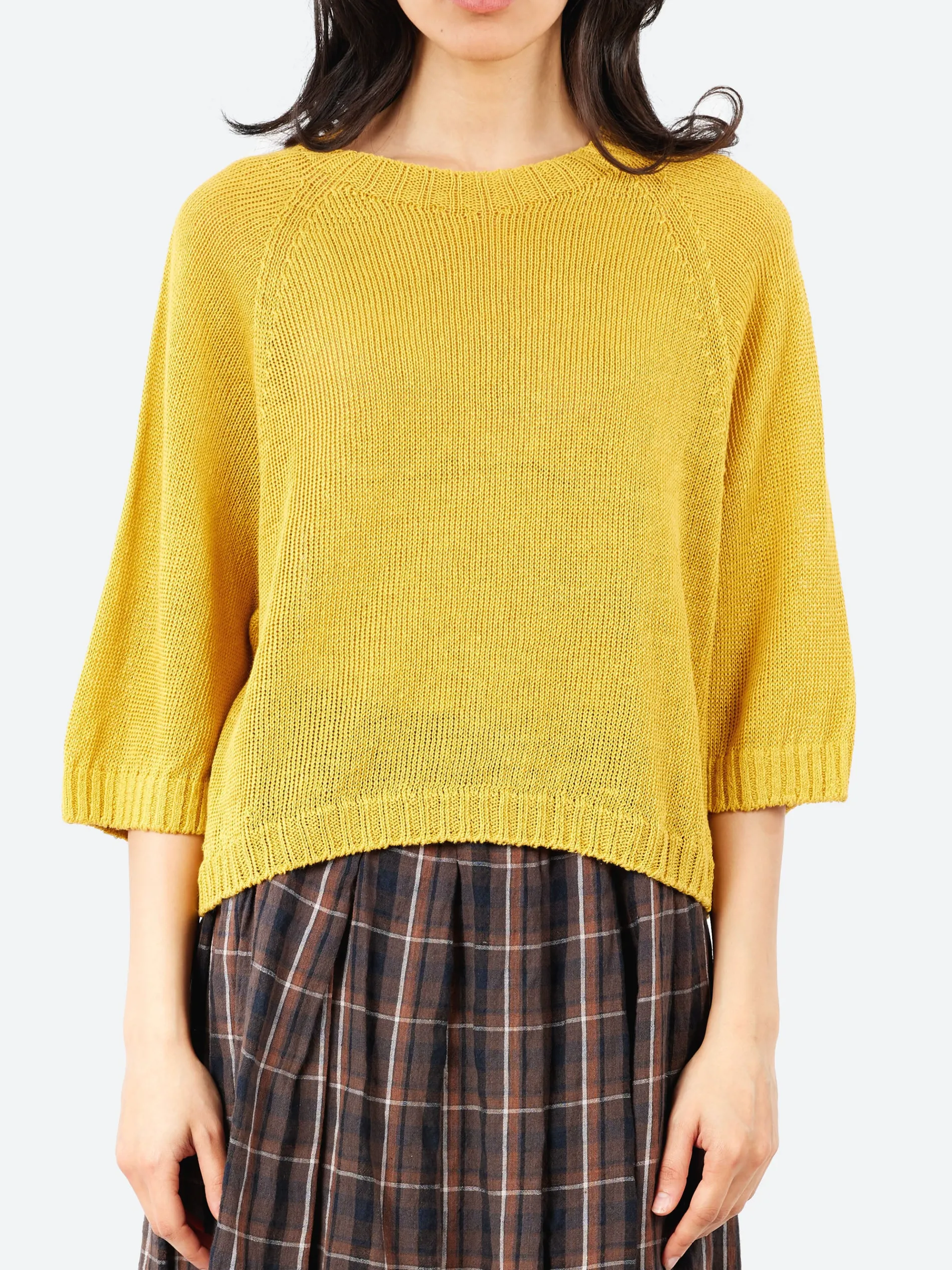 This easy summer knit from Sarahwear is breathable and comfortable to wear all season long. Made from a slightly transparent linen yarn with subtle sheen, the cropped raglan sleeve and loose silhouette make for effortless layering.