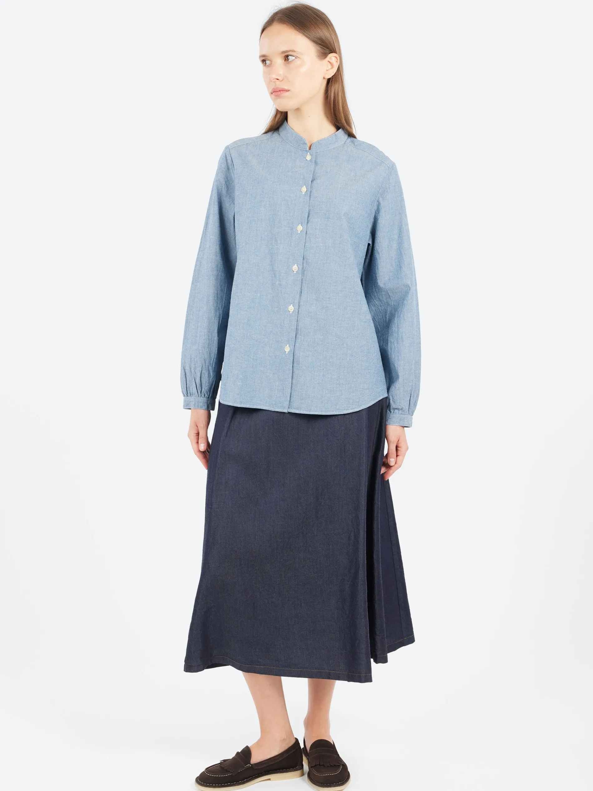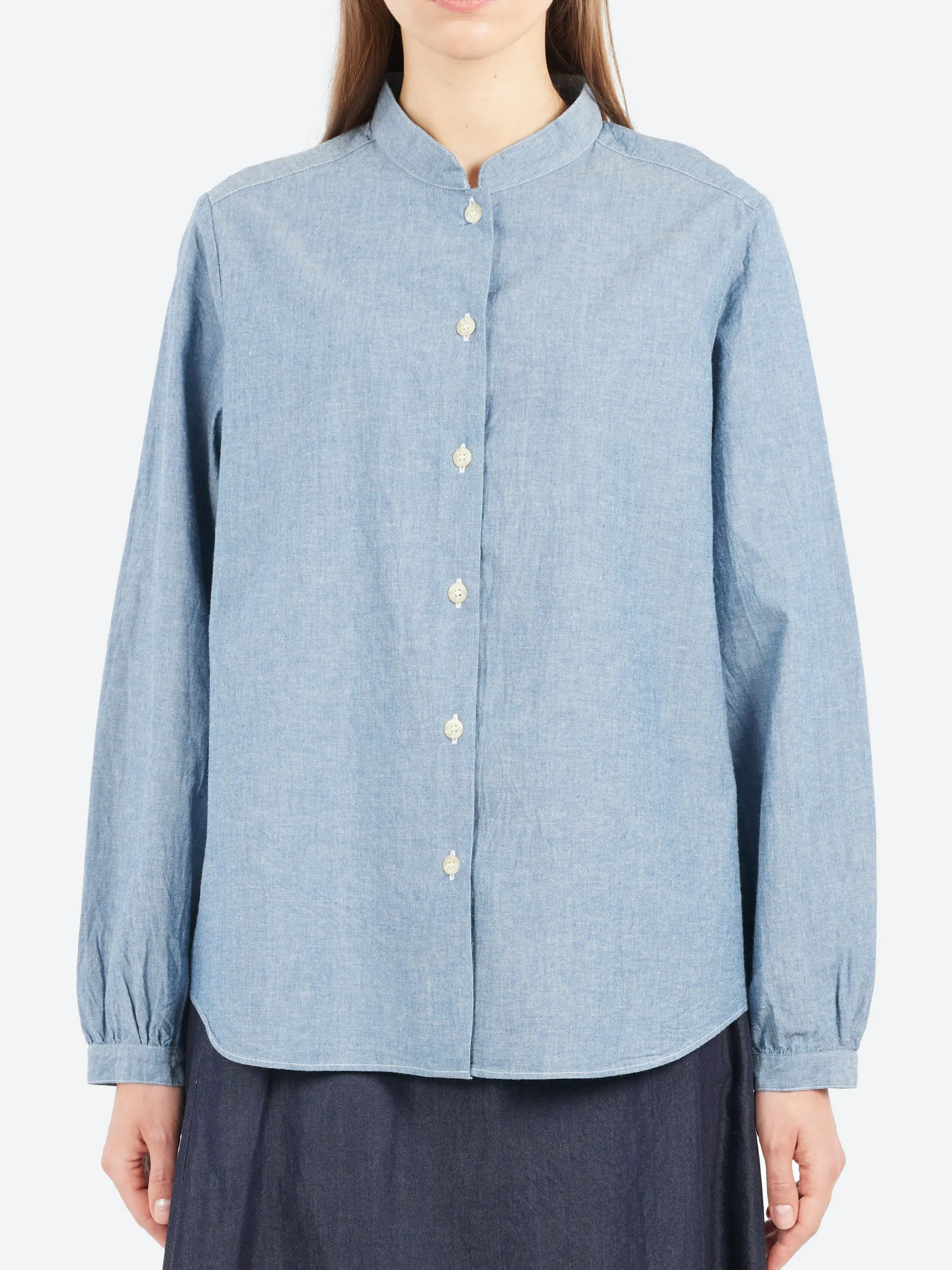 The Sarahwear Rosie Shirt features a clean stand-up collar and modest puffed cuffs that add a subtle feminine touch. Made from 100% cotton chambray fabric, it is light, breathable and durable, offering both comfort and lasting quality.