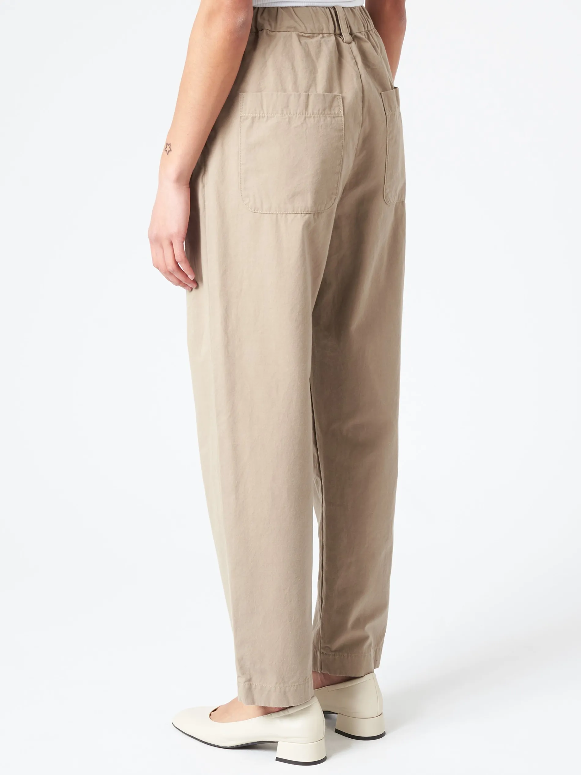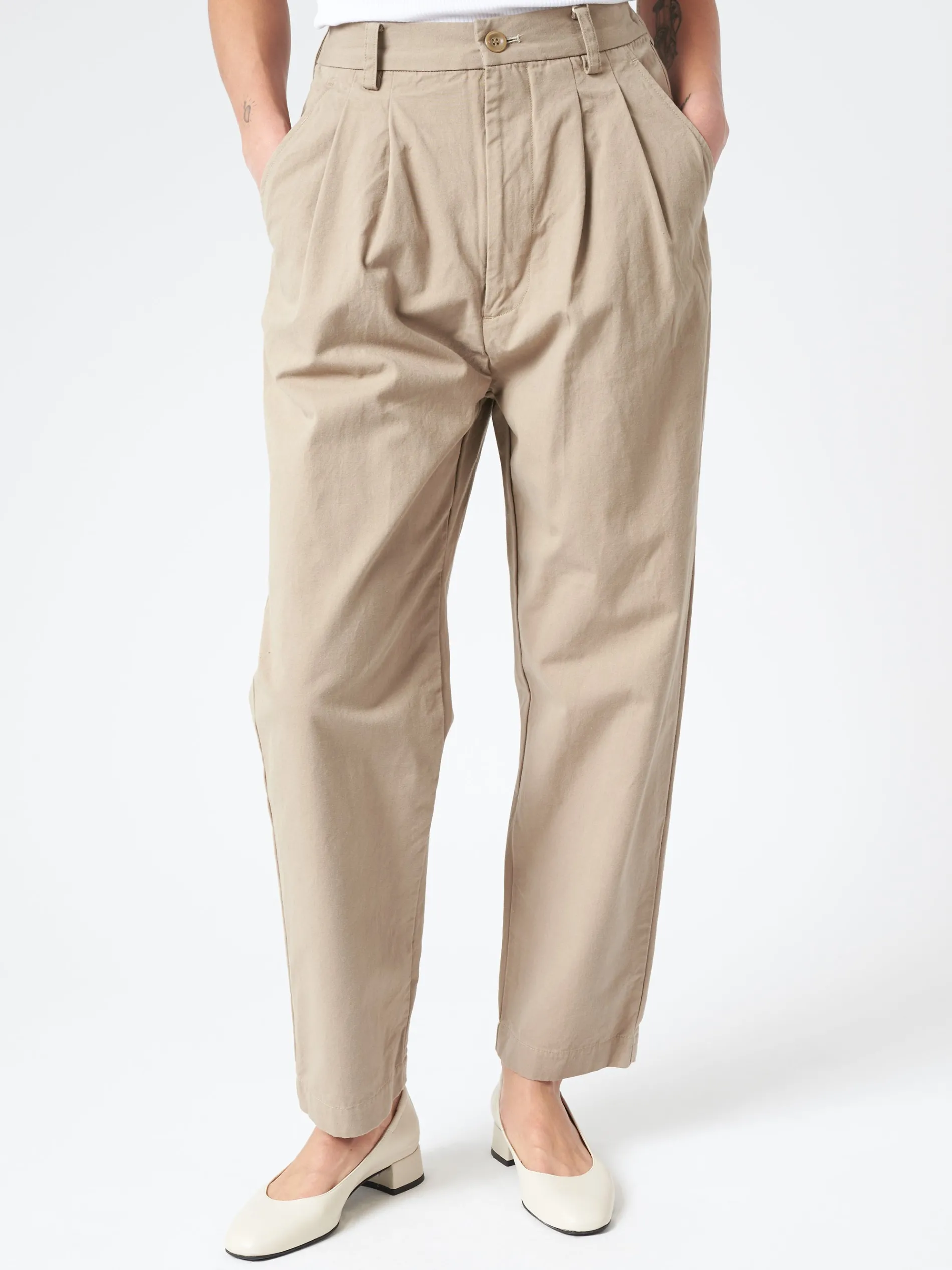 Sarahwear pleated-front tapered pants made from crisp cotton weather cloth, a densely woven fabric with firm structure.