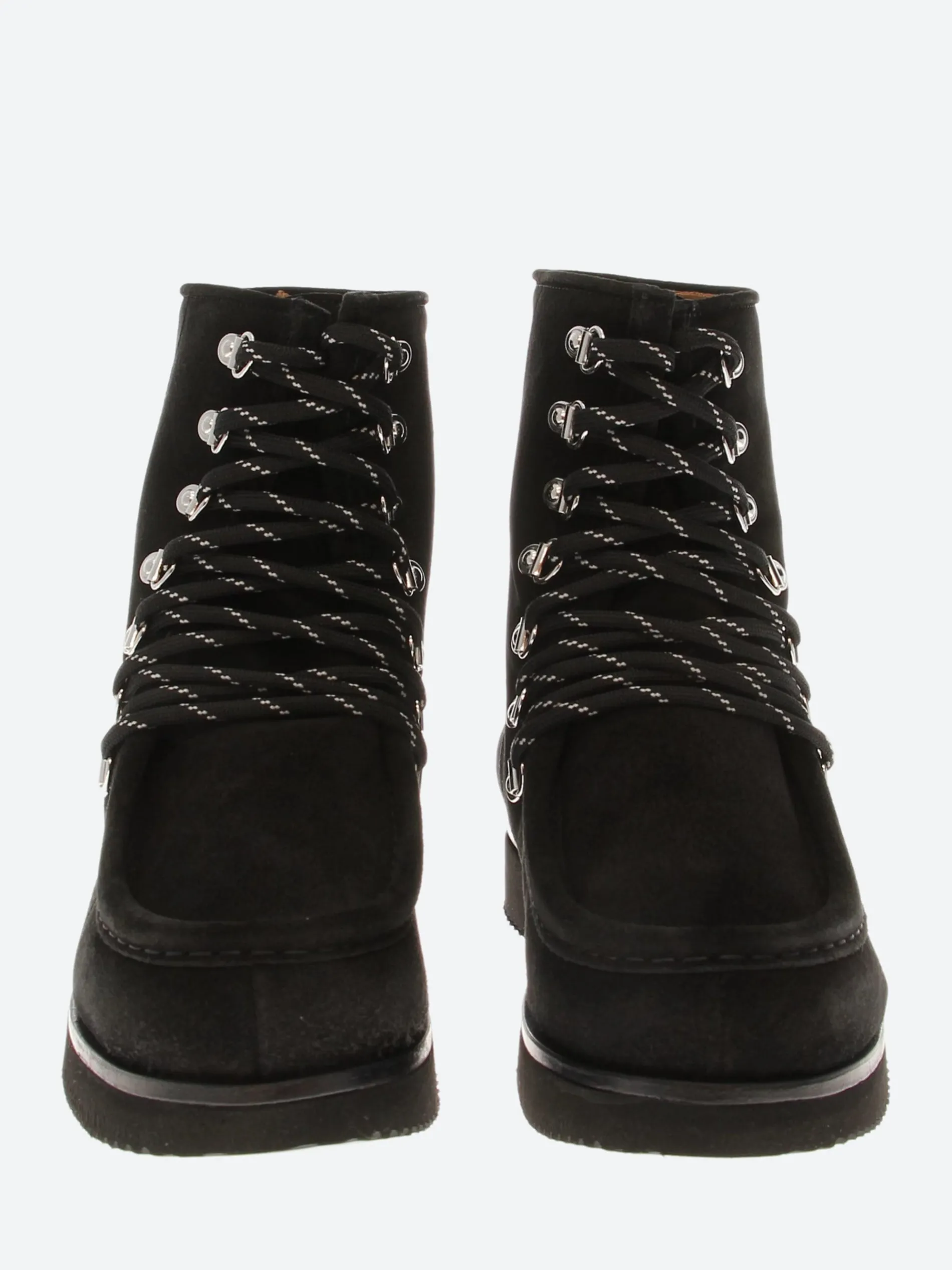Handsewn moc toe boots in suede skin, calf lining, leather innersole and Vibram eva outsole.