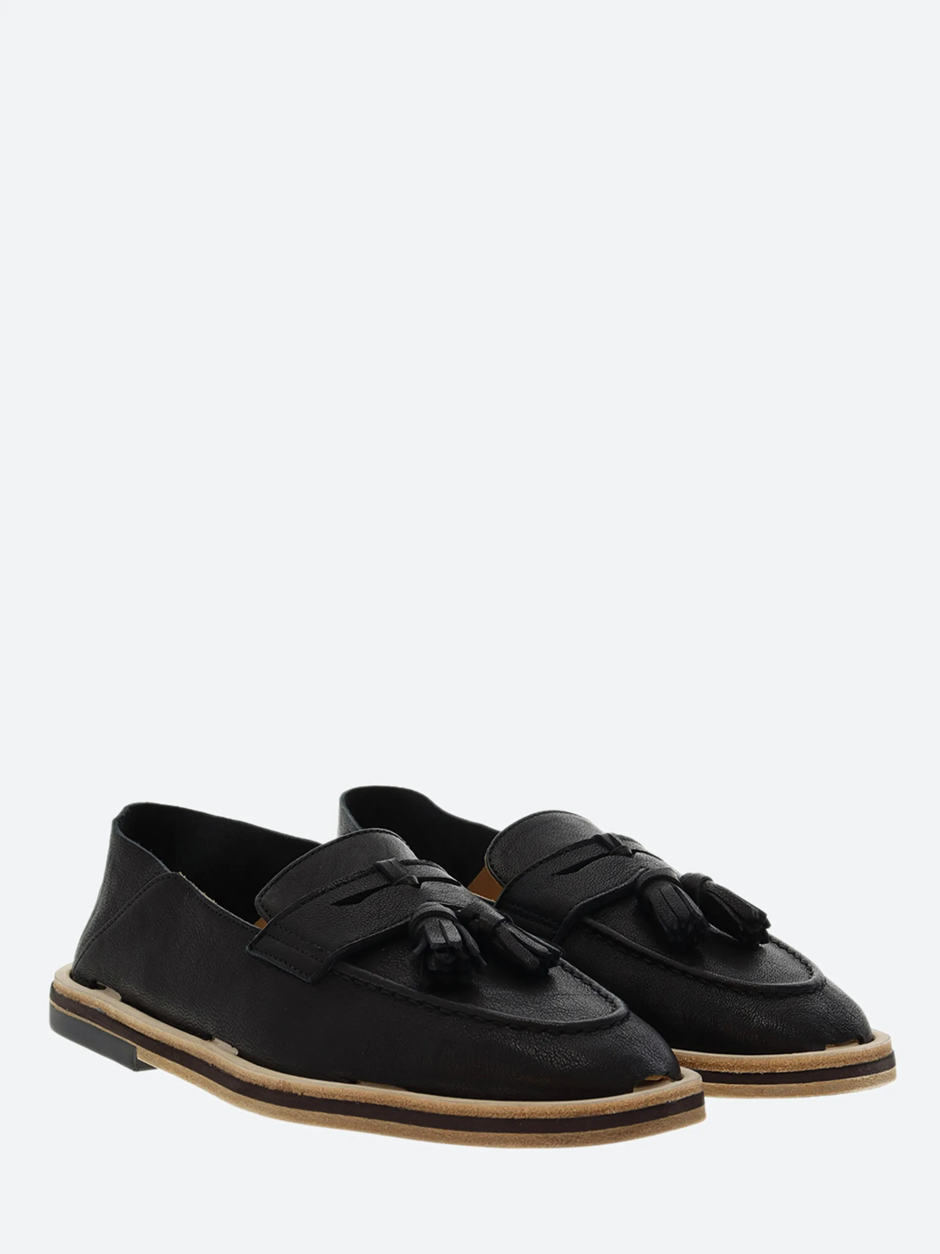Handsewn loafers in brush off cow skin, calf lining and handmade leather outsole with anti-slip rubber island.