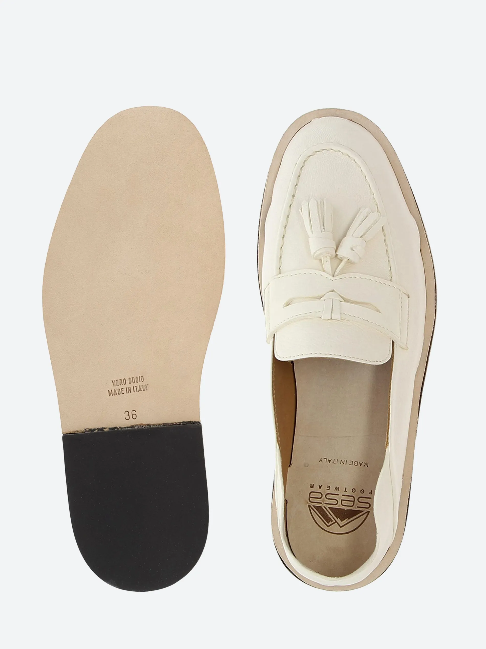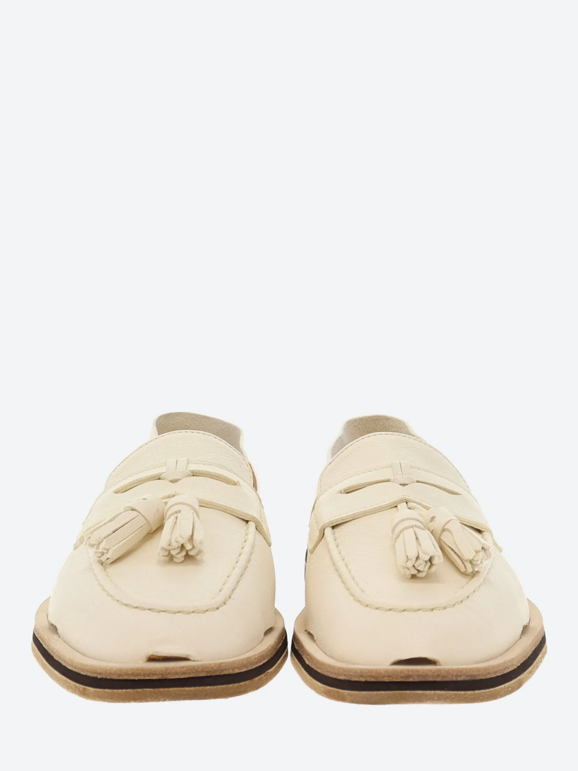 Handsewn loafers in brush off cow skin, calf lining and handmade leather outsole with anti-slip rubber island.
