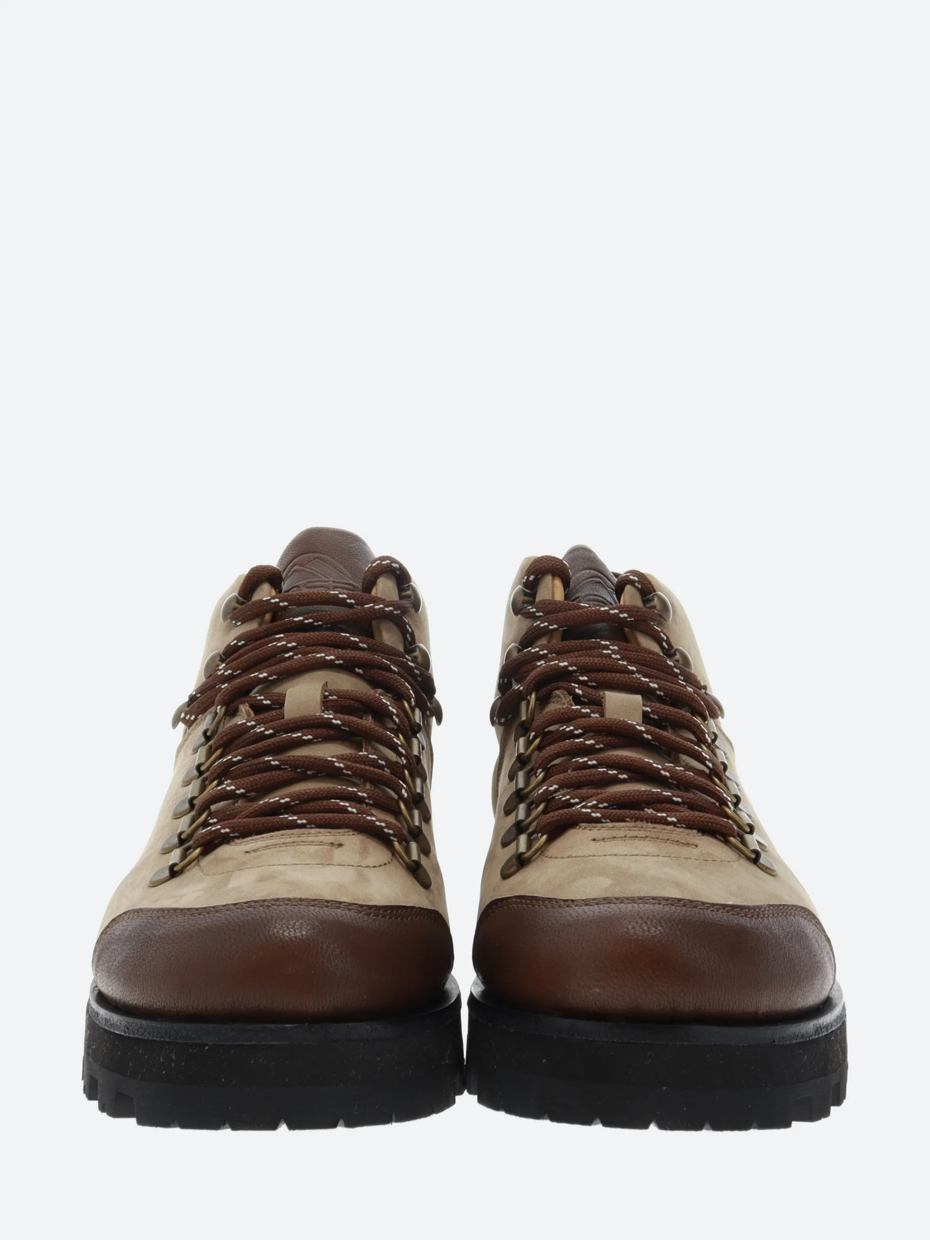 Mountaineering boots in cow nubuck, calf lining, Blake stitched in leather midsole with Vibram Teton rubber outsole.
