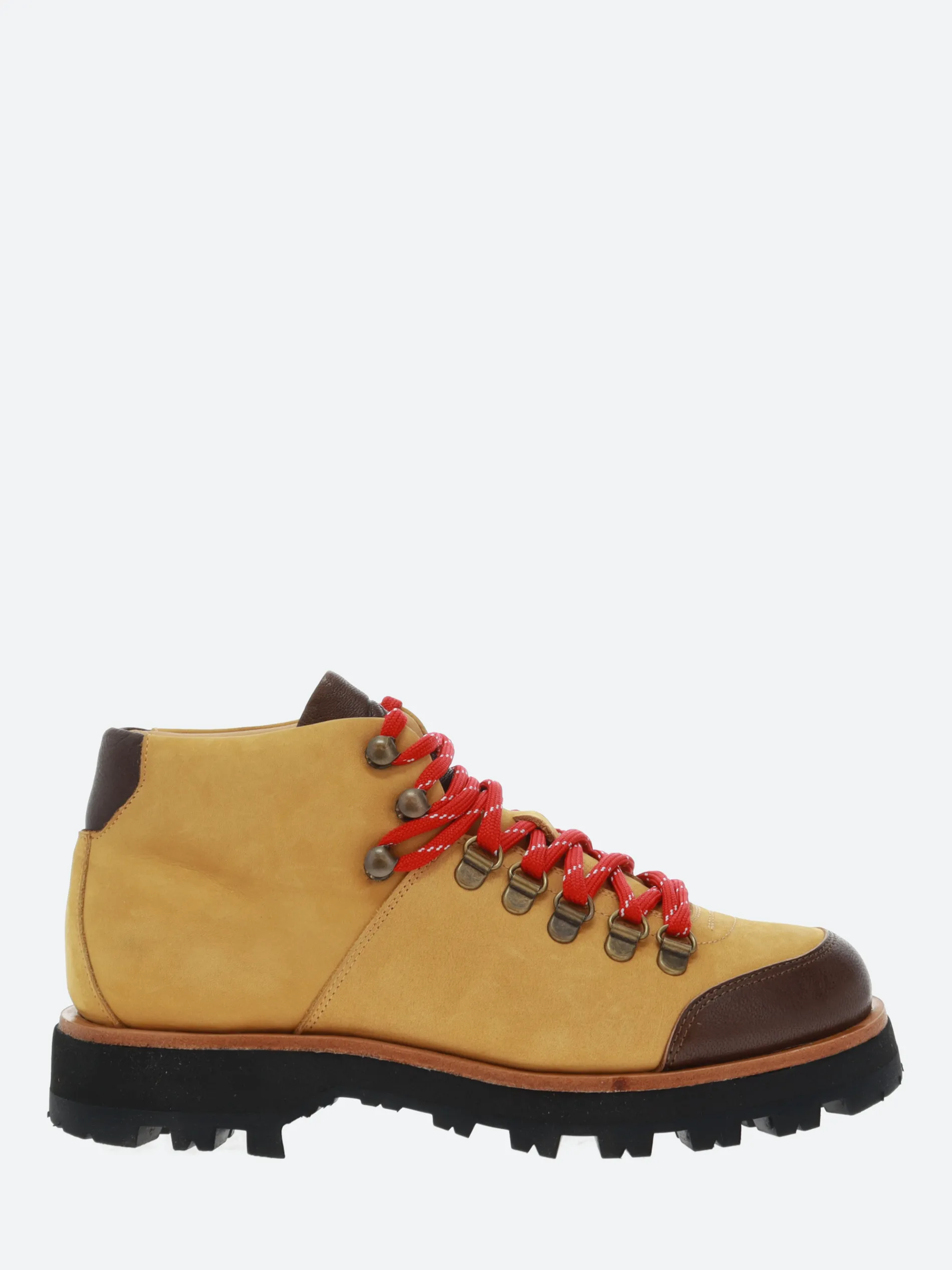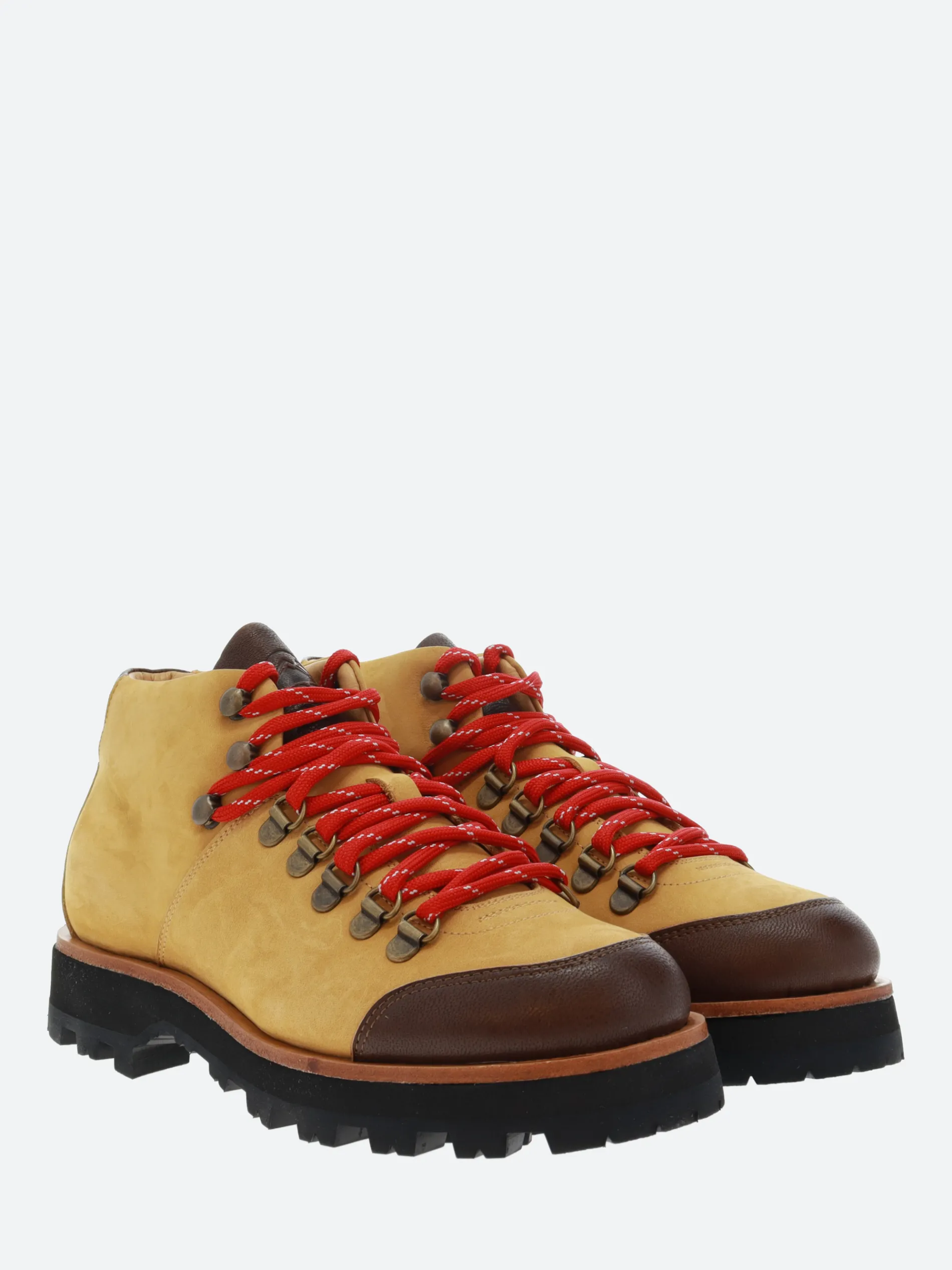 Mountaineering boots in cow nubuck, calf lining, Blake stitched in leather midsole with Vibram Teton rubber outsole.