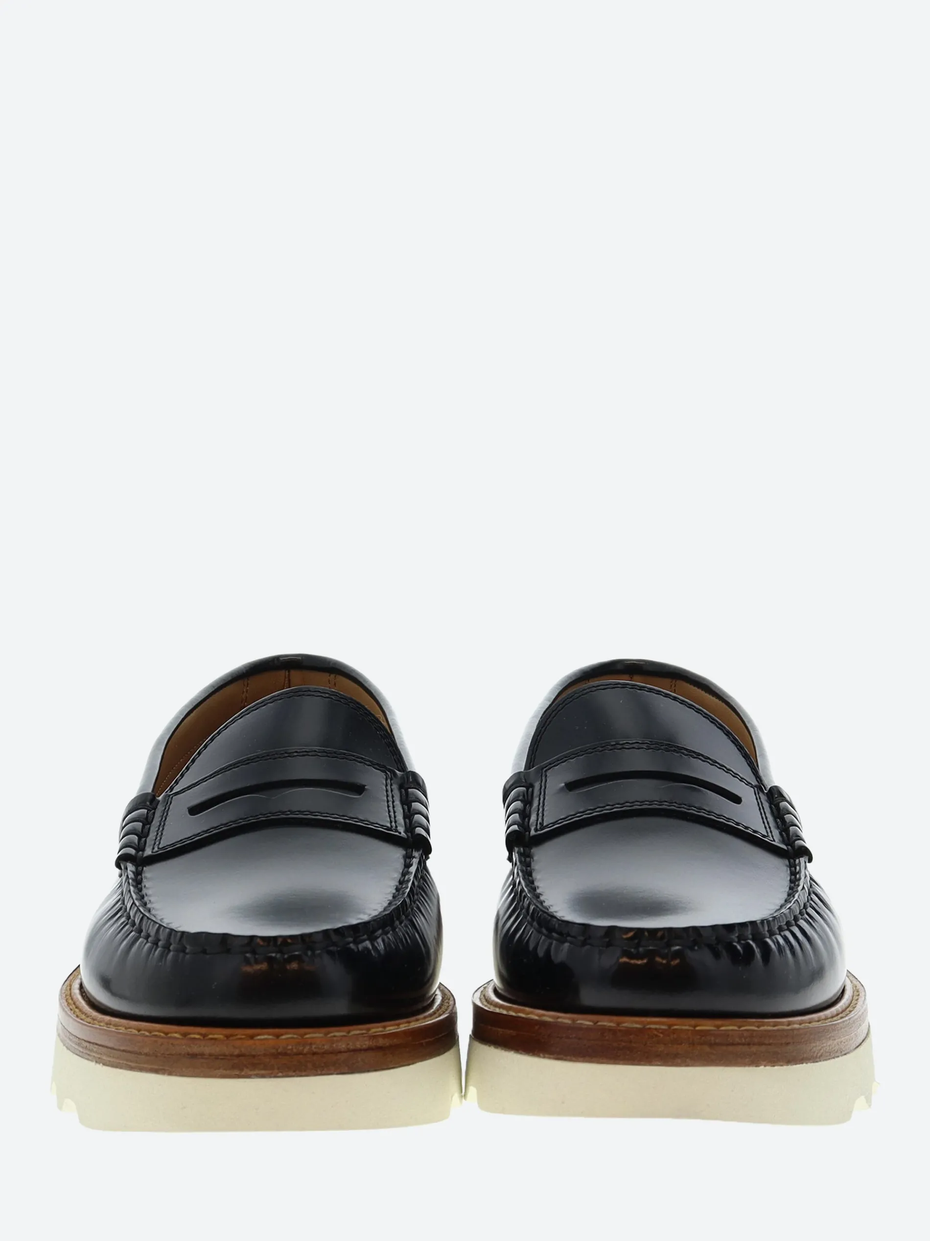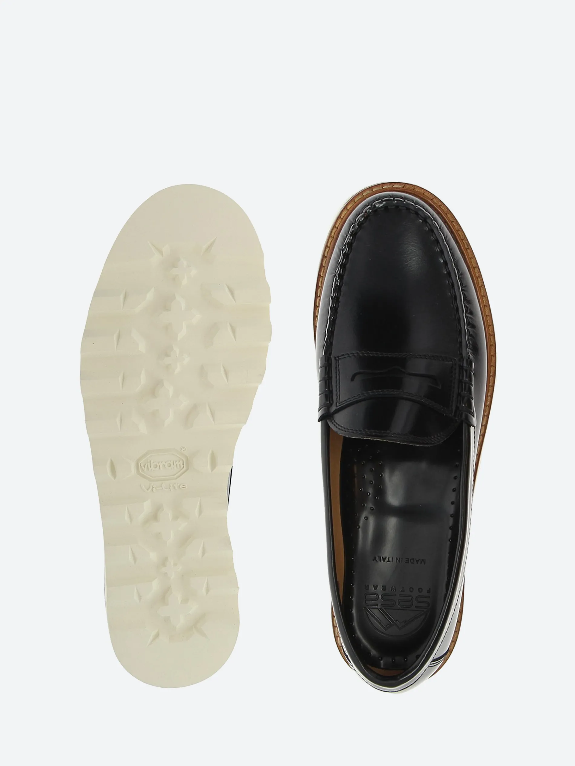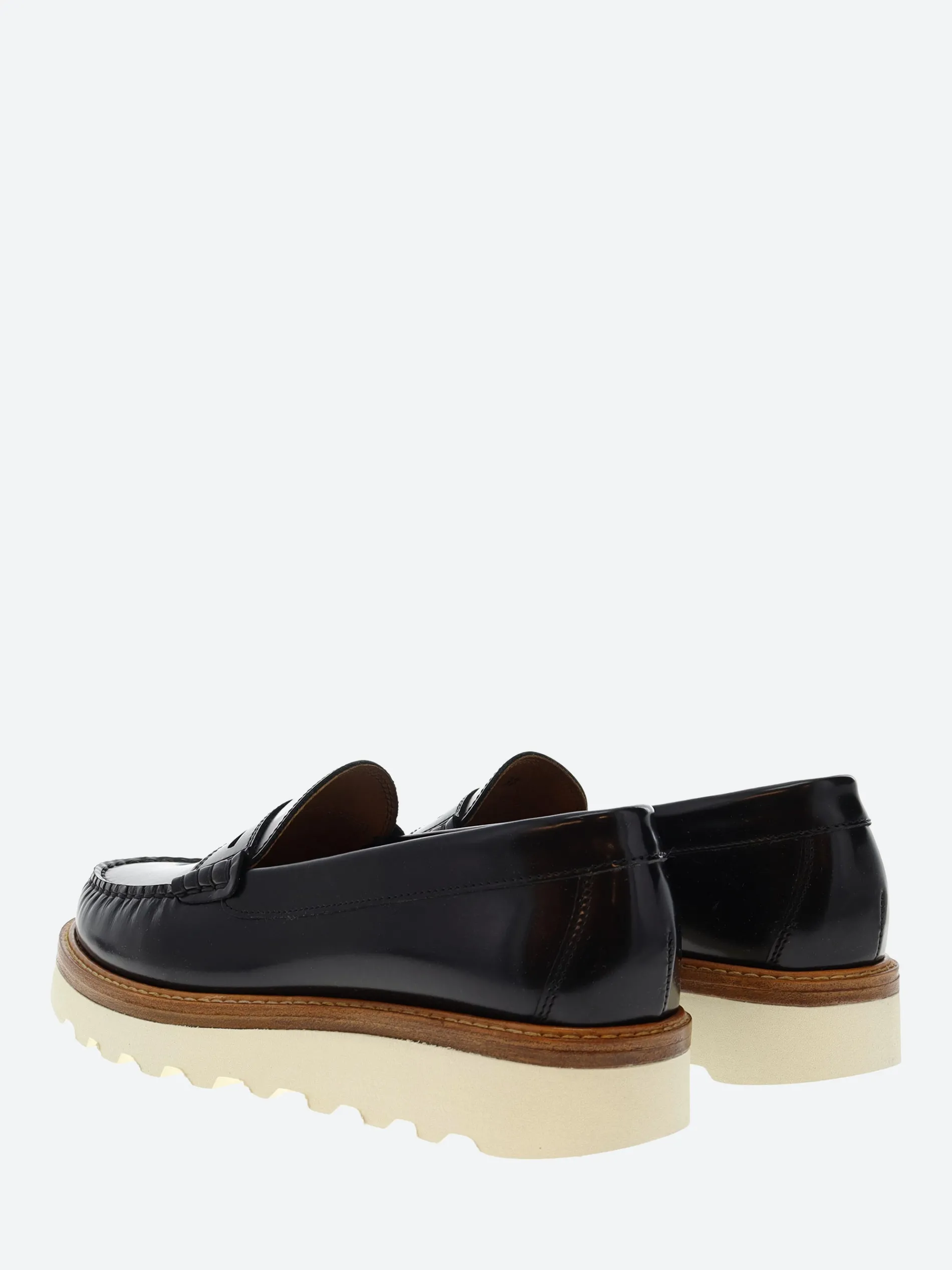 Handsewn penny loafers in brush off cow skin, calf lining, leather midsole and Vibram EVA outsole.