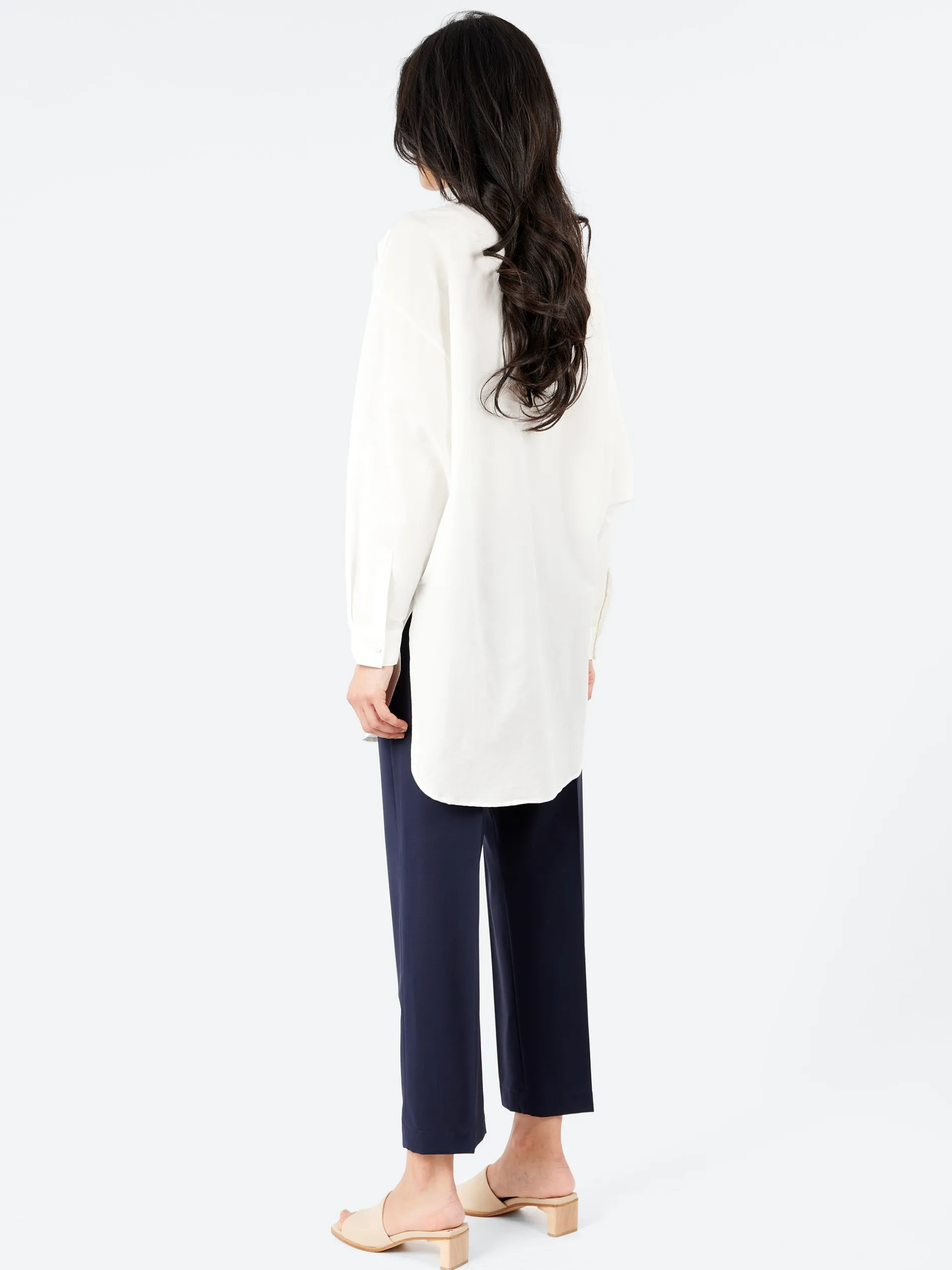 This Silk Laundry shirt is made from a silk-cotton blend, offering a soft, breathable feel. Designed for an oversized fit, it features a classic shirt collar, batwing sleeves for a relaxed silhouette, and a curved hemline with a longer back tail for added style. Finished with internal French seams for a polished finish.