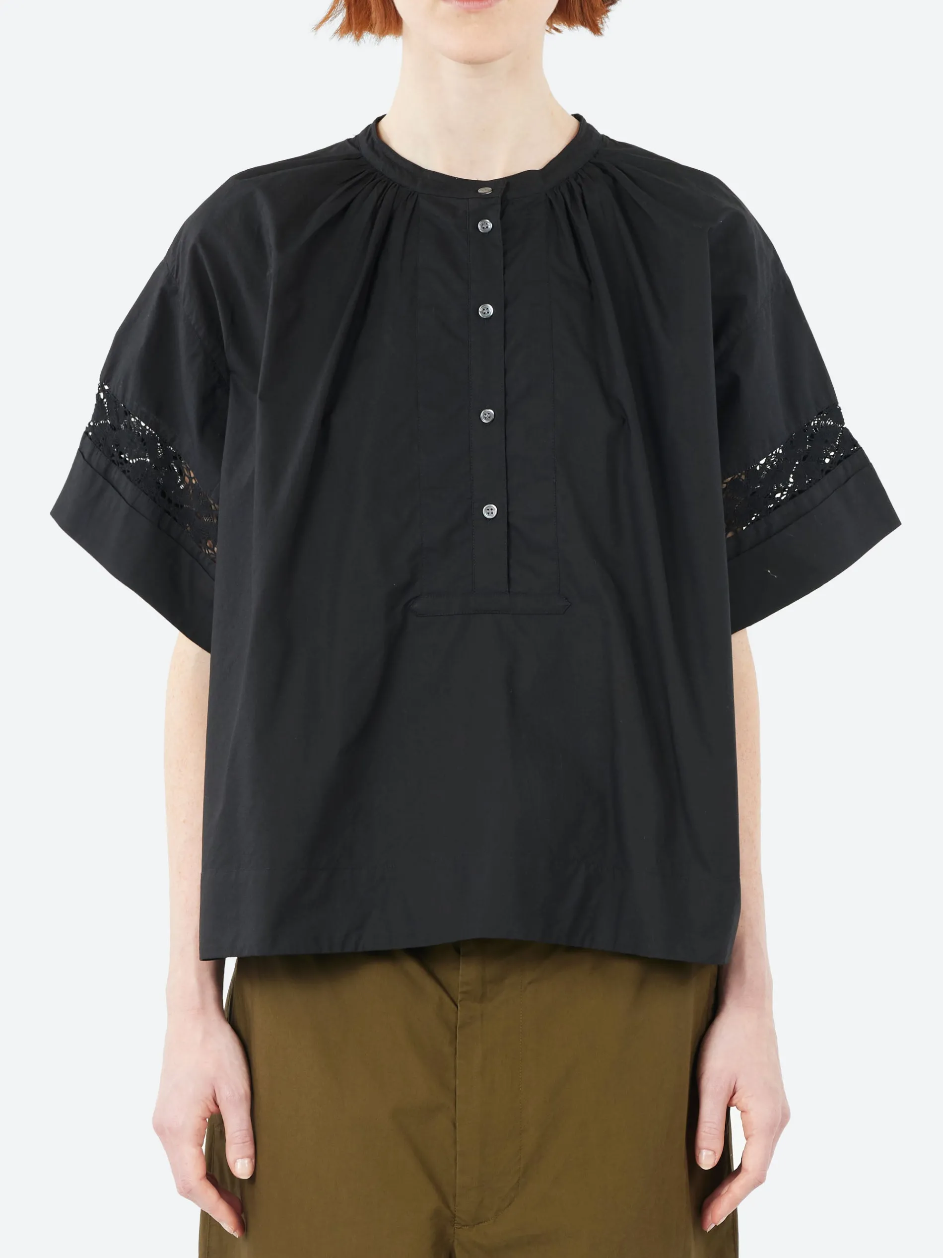 The Soeur Albane Blouse offers a loose fit with short, wide sleeves for a laid-back style. It features a round neckline with a small collar stand and gathered detailing, along with a front button closure. The blouse is embellished with embroidery on the sleeves and finished with a hem on both the body and sleeves. Crafted from soft cotton poplin, it ensures comfort and breathability.