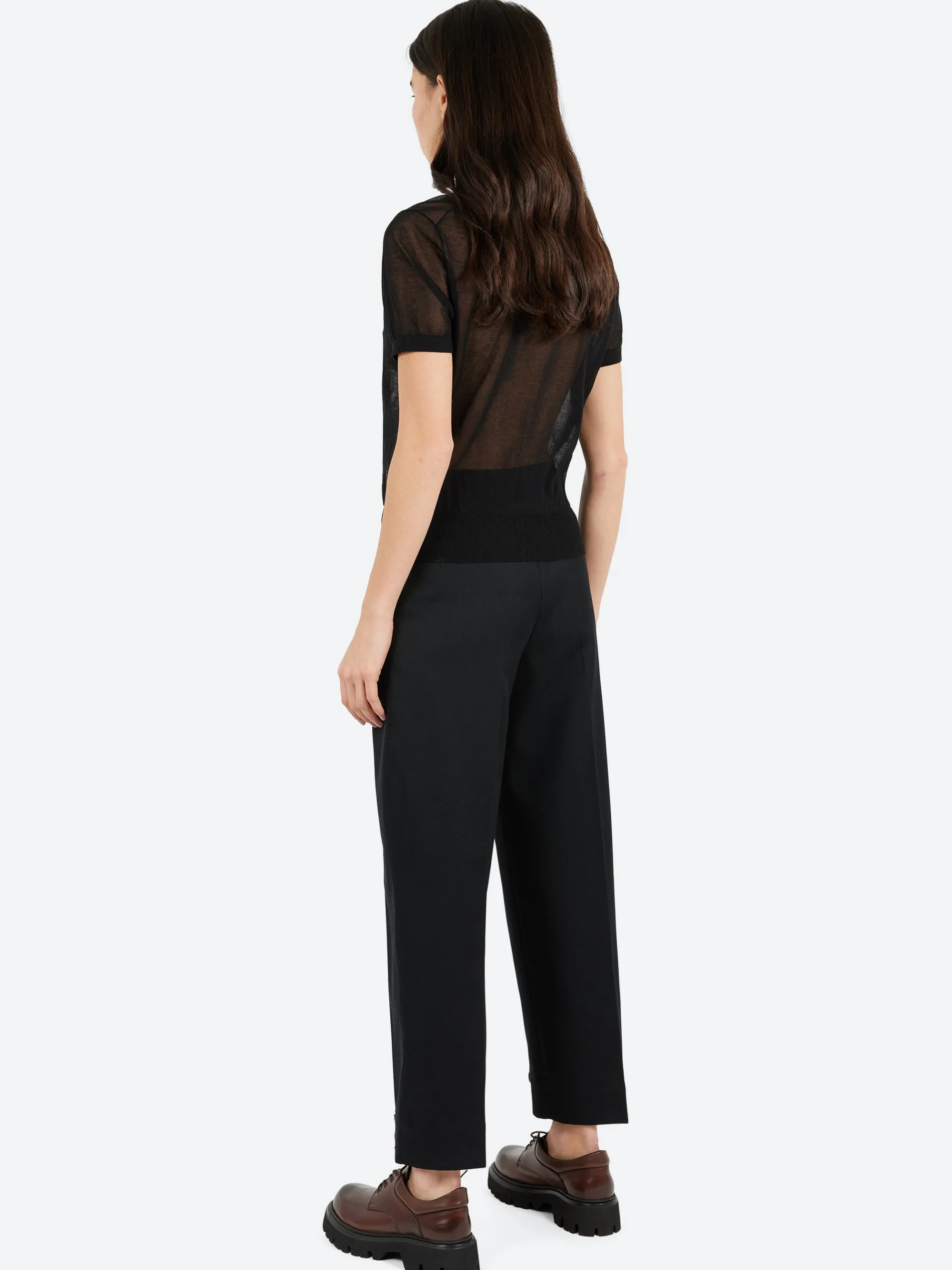 Soeur Dua features a straight cut with a tapered hem, short sleeves, and a round collar. Made from a sheer cotton knit, it offers a light, breathable feel with a subtle translucent texture.