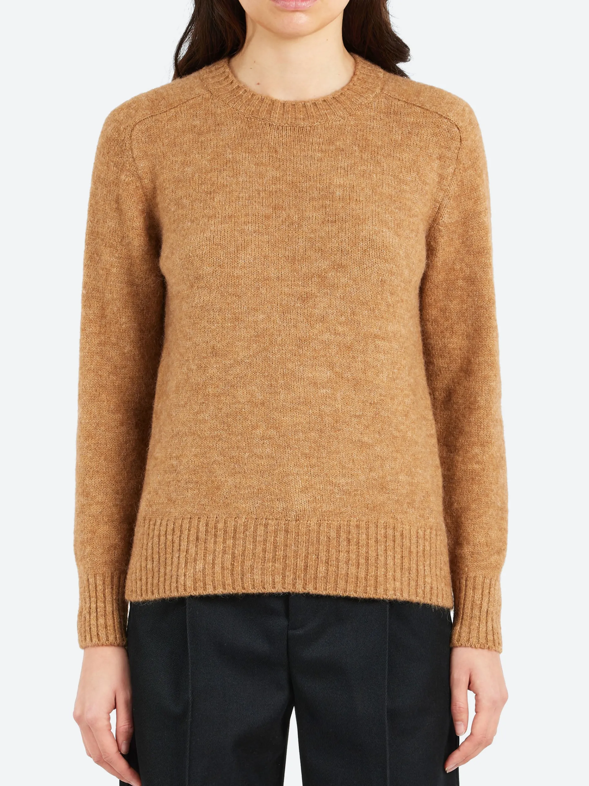 Soeur Envie is an alpaca and wool sweater. Its fit is classic and straight, with a round neckline that sits away from the neck and raglan armholes giving it a subtly relaxed look, while the voluminous and slightly fluffy knit provides softness and flexibility.