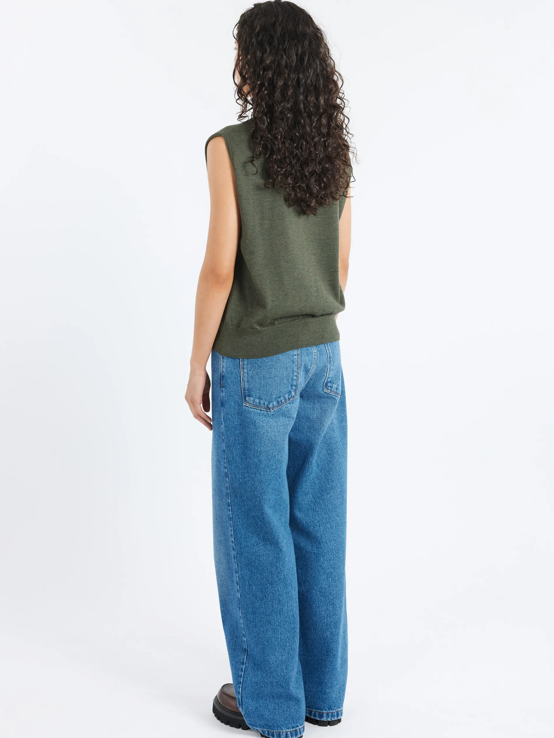 A sleeveless, deep v-neck merino wool vest. Straight cut tightened with a ribbed edge.