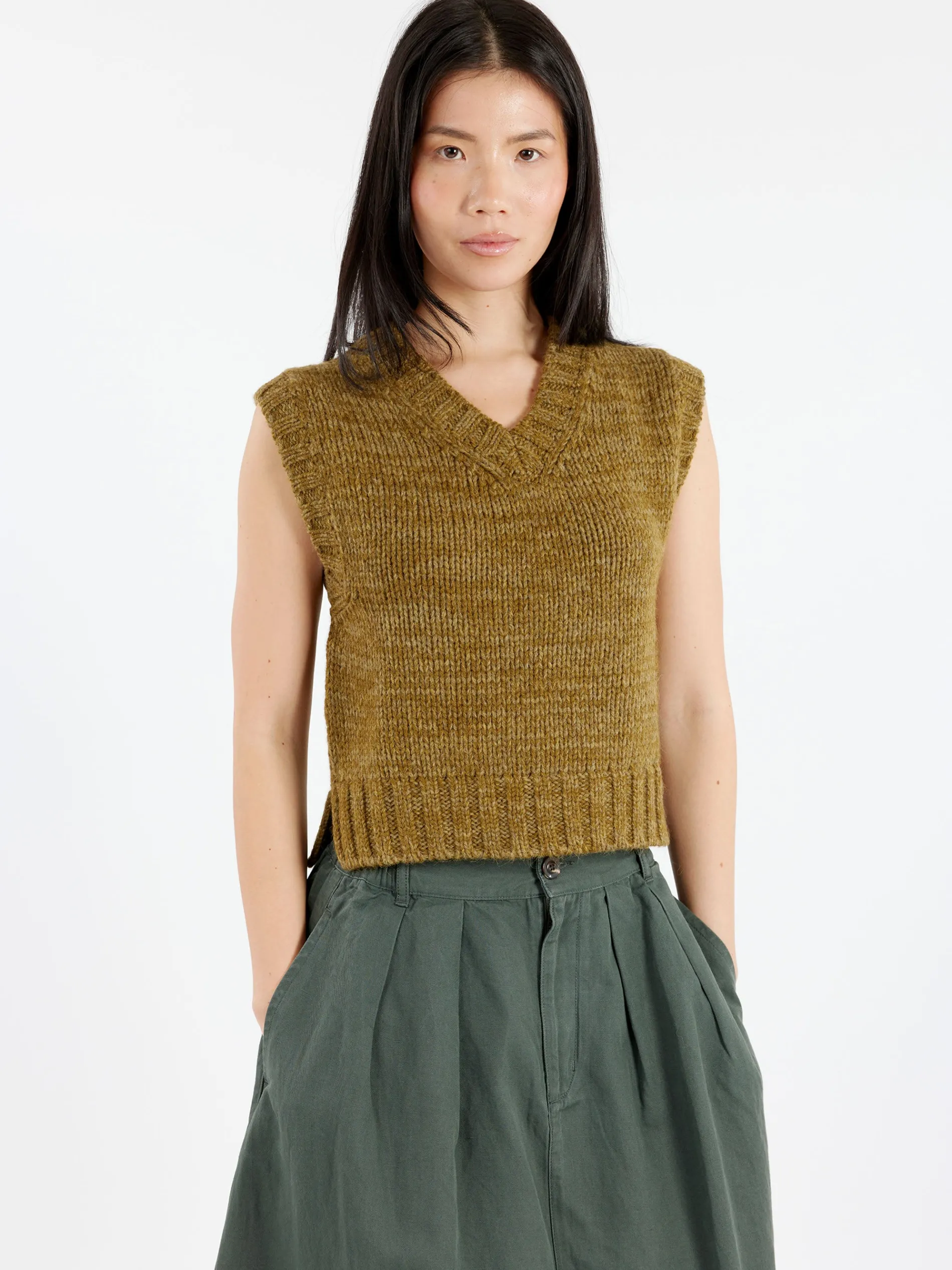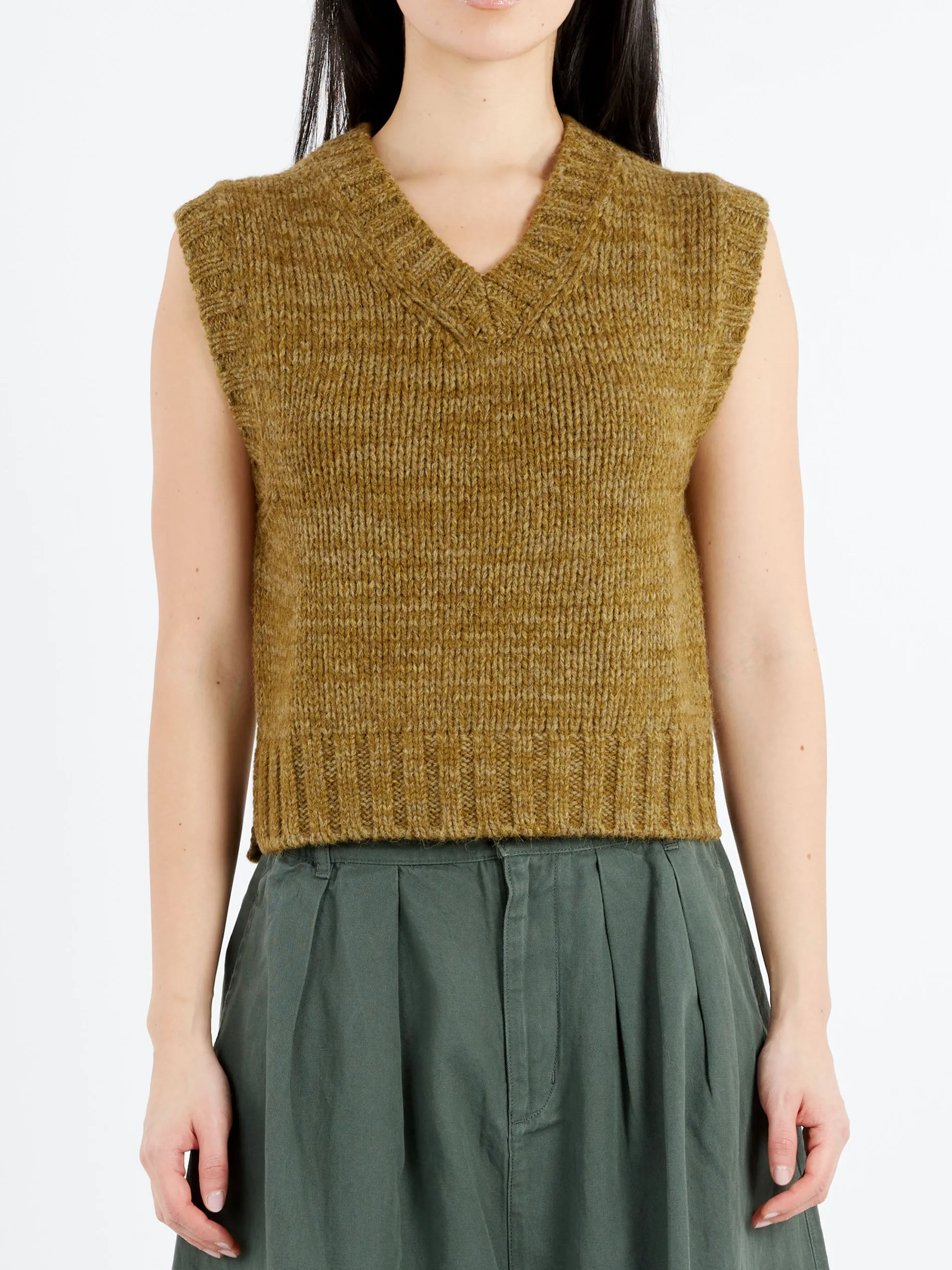Soeur Wade is a sleeveless jumper knitted from a blended wool yarn with alpaca. Perfect for layering, it’s a functional piece that will stylishly warm up a blouse or a light t-shirt.