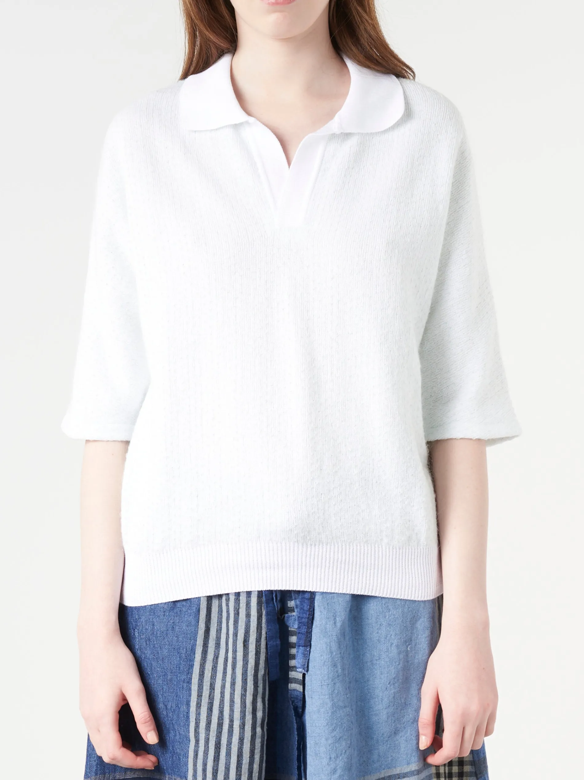 Knit polo top with three-quarter length kimono sleeves, made from a lightweight cotton-mohair blend with a fuzzy birdseye finish.