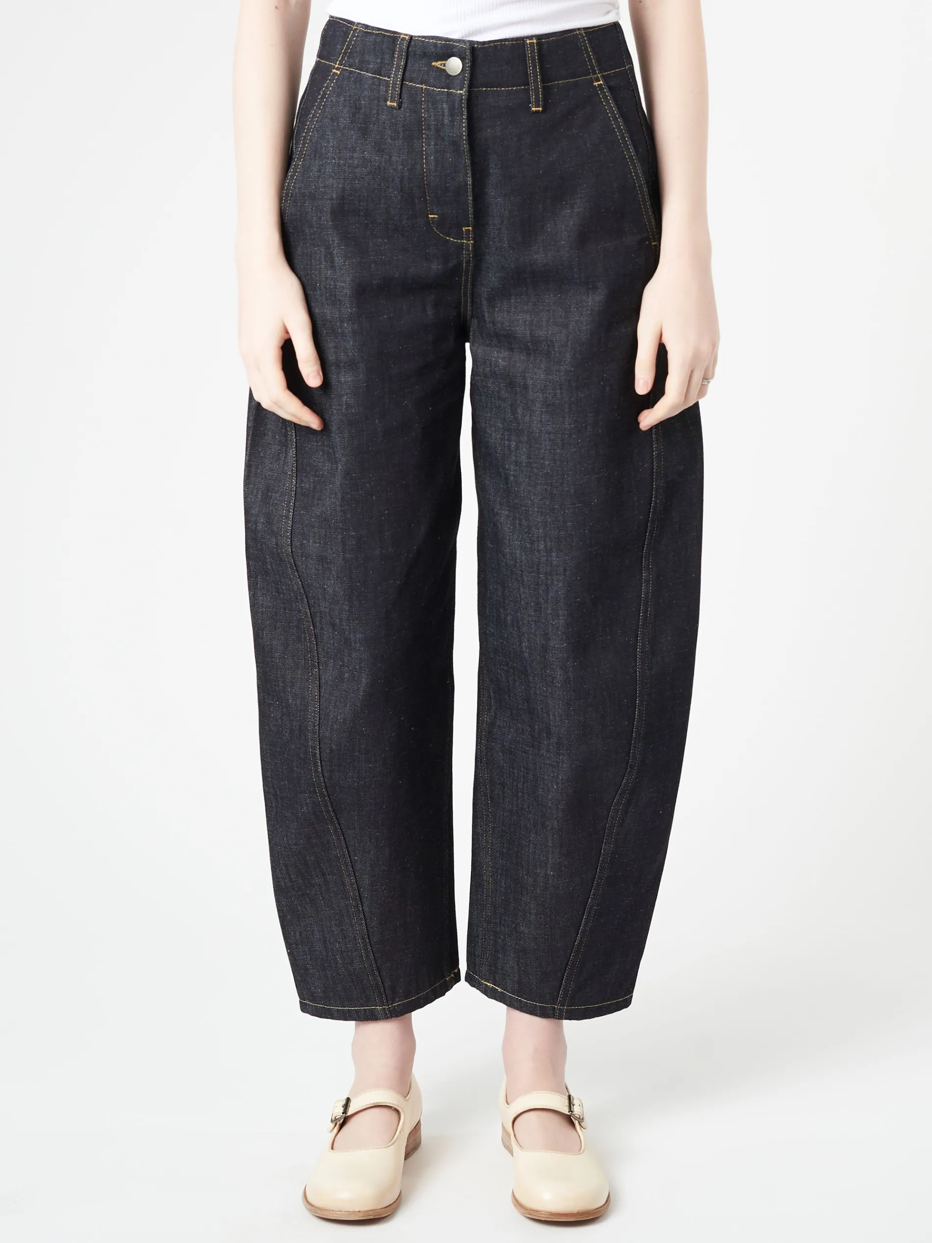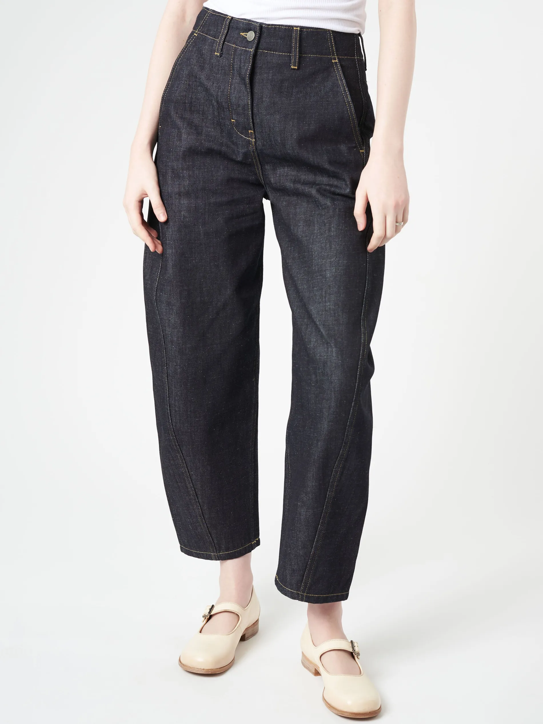 High waisted curved leg denim pant made from ISKO’s sustainable raw R-TWO™ denim.